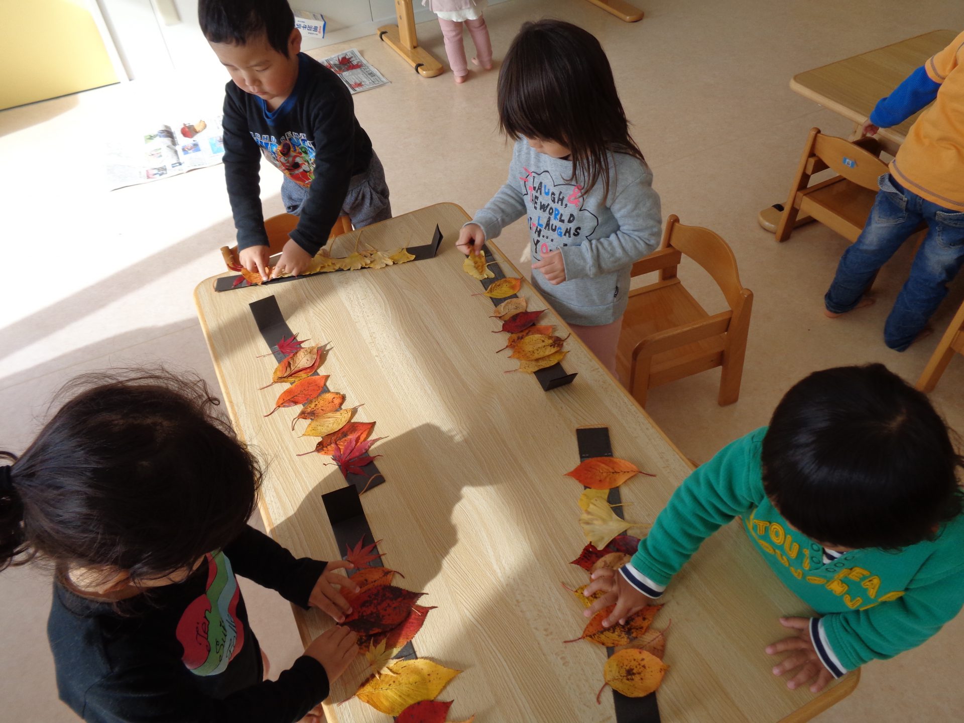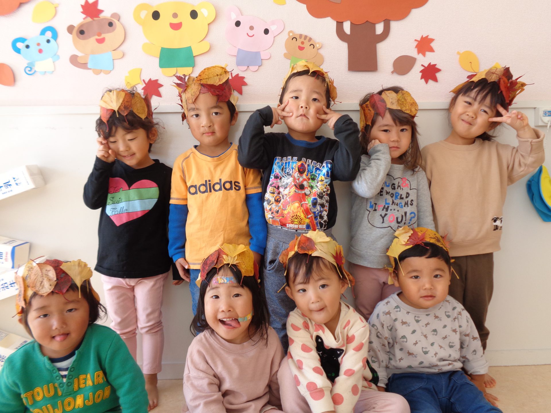 「赤の葉っぱを貼ったから、次は黄色にしよう!」と色合いを気にしている子、「いちょうがかわいいから、いっぱい貼る~」とお気に入りの形を見つけた子など、一人ひとりよく考えながら製作に取り組んでいました。鏡でかんむりを被った自分や友達の姿を確認し、「かわいいね~」と喜び合っている姿が見られました。