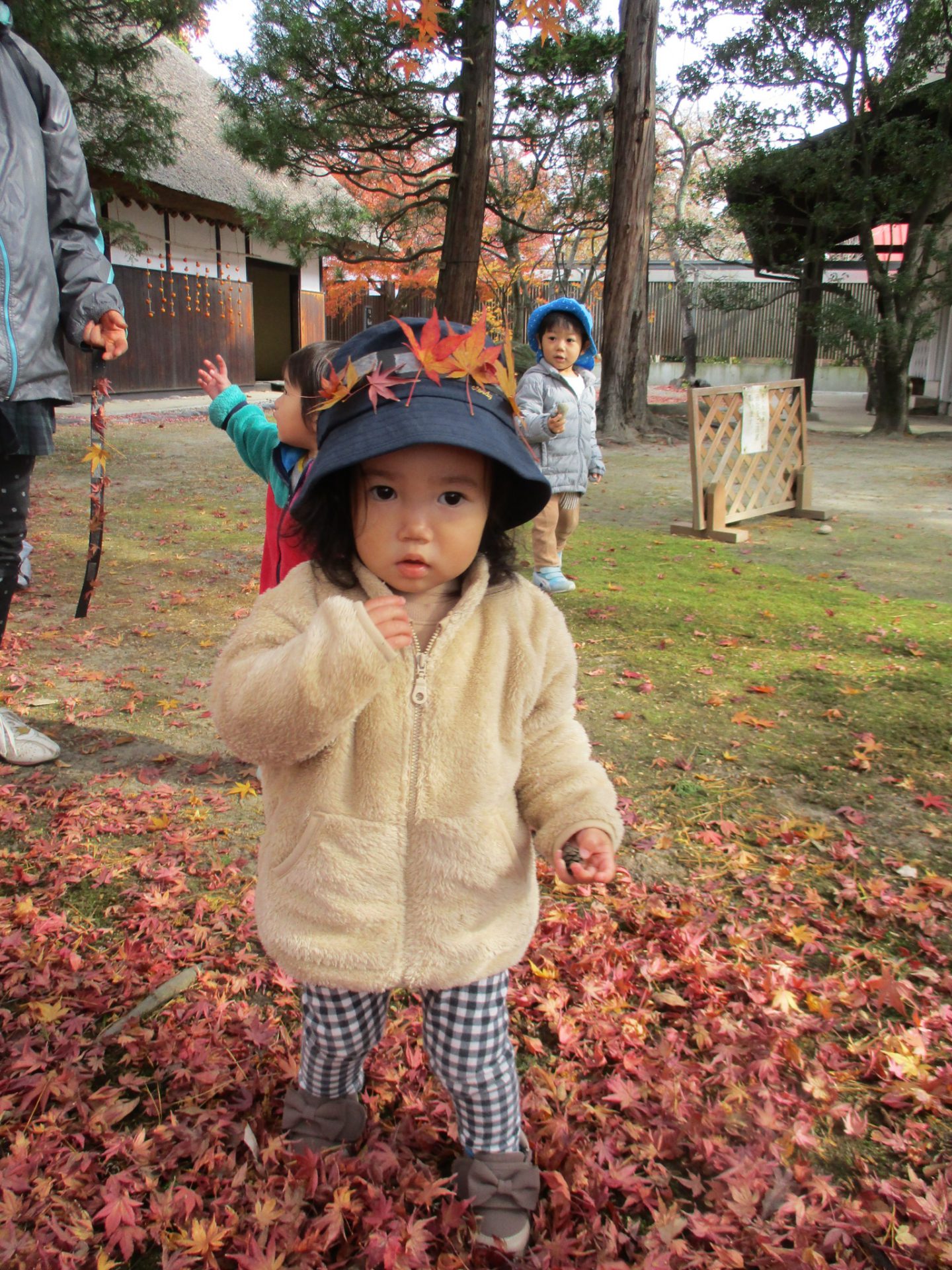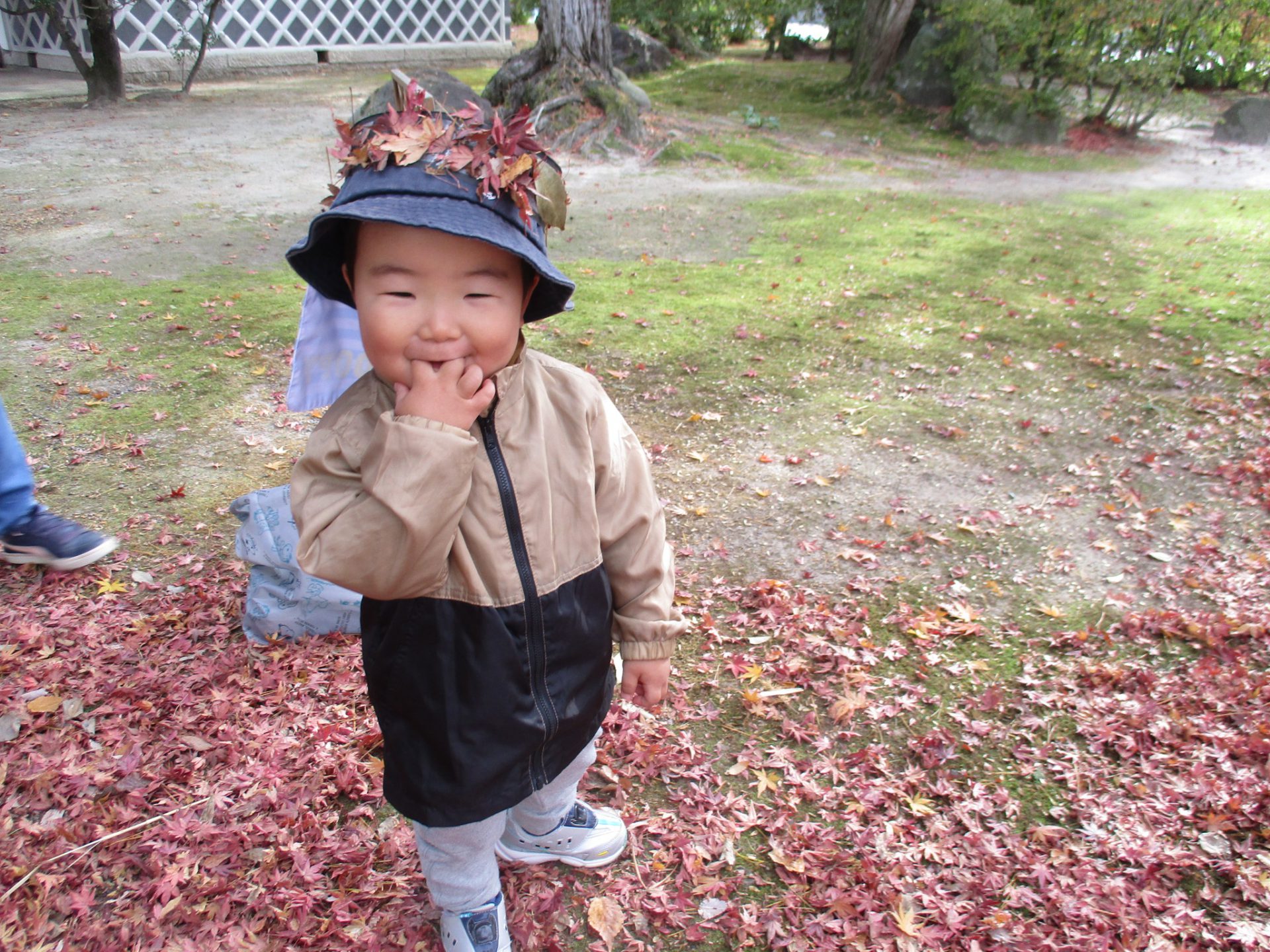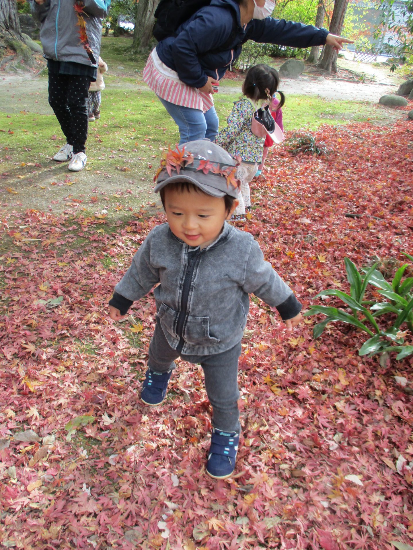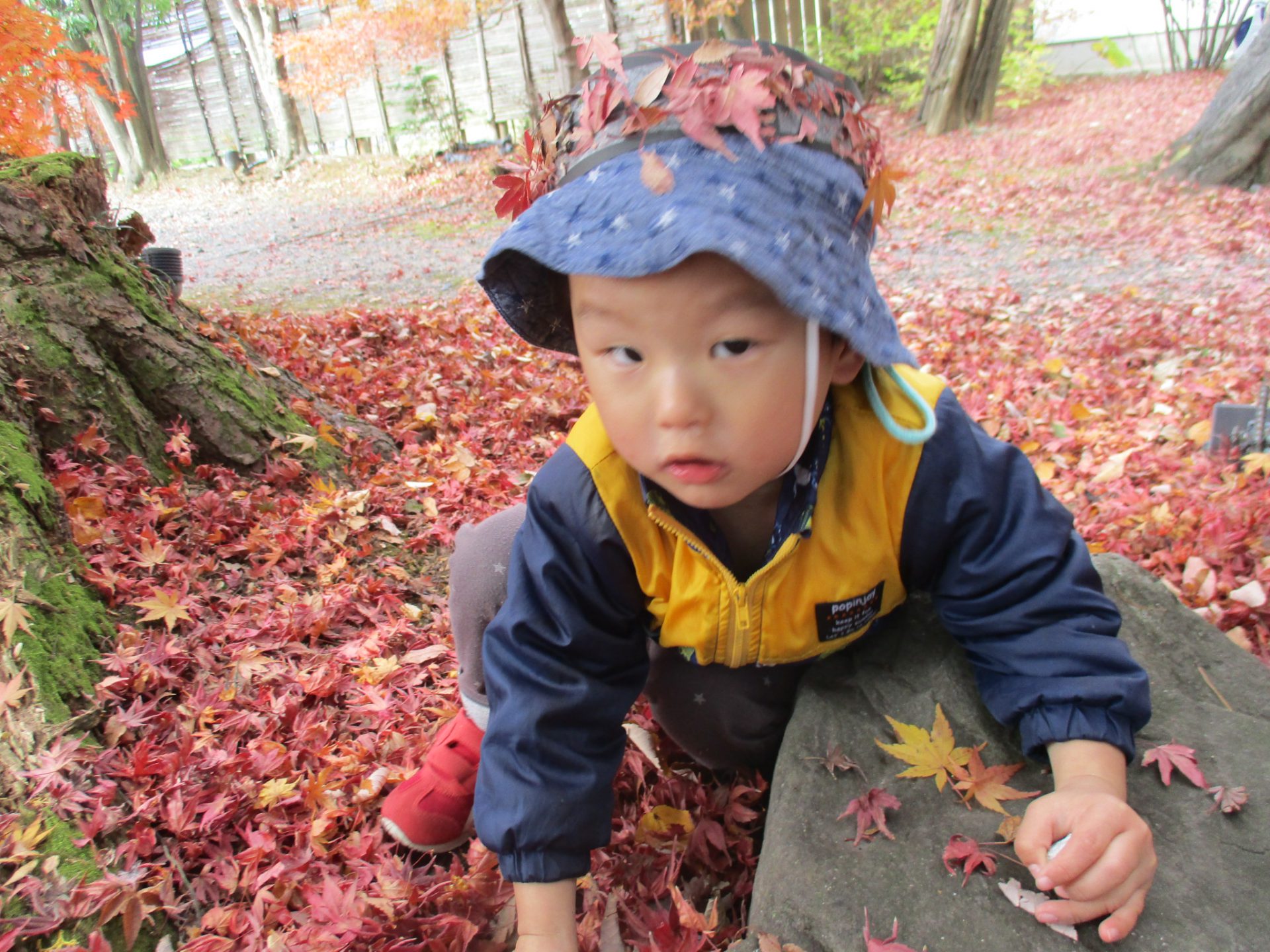 たくさんの真っ赤な落ち葉を見て散歩バックに集める姿、子ども達の上から葉っぱを散らすとうれしそうにする姿、葉っぱかんむりに興味を持って葉をくっつけて頭にかぶりポーズをとる姿...一人ひとり楽しさを感じることはちがうけれど葉っぱに興味を持てたことにうれしく思います。成長していく中での未満児のこの時のこの体験が土台になっていってすくすくと育っていってほしいと思います。