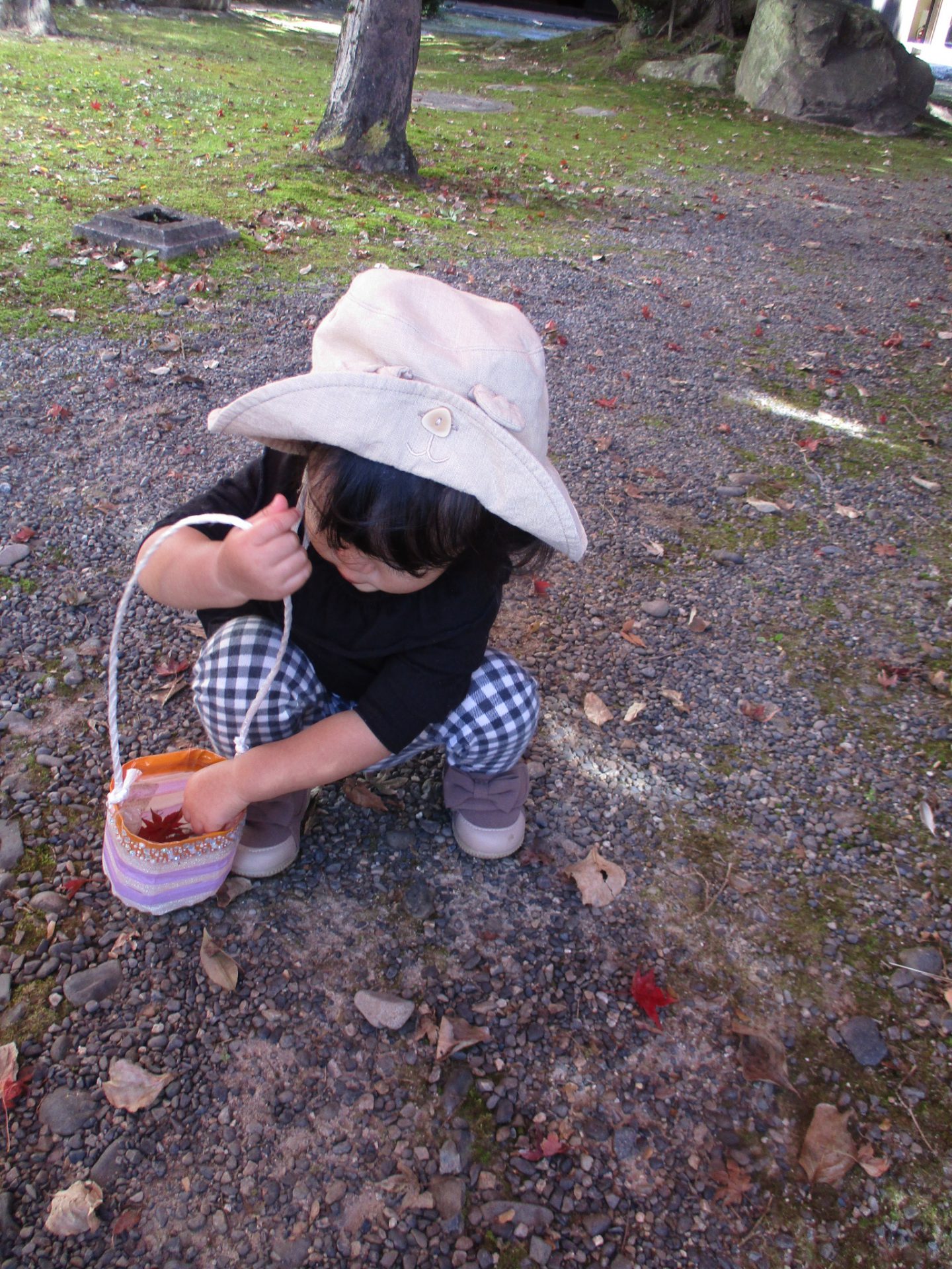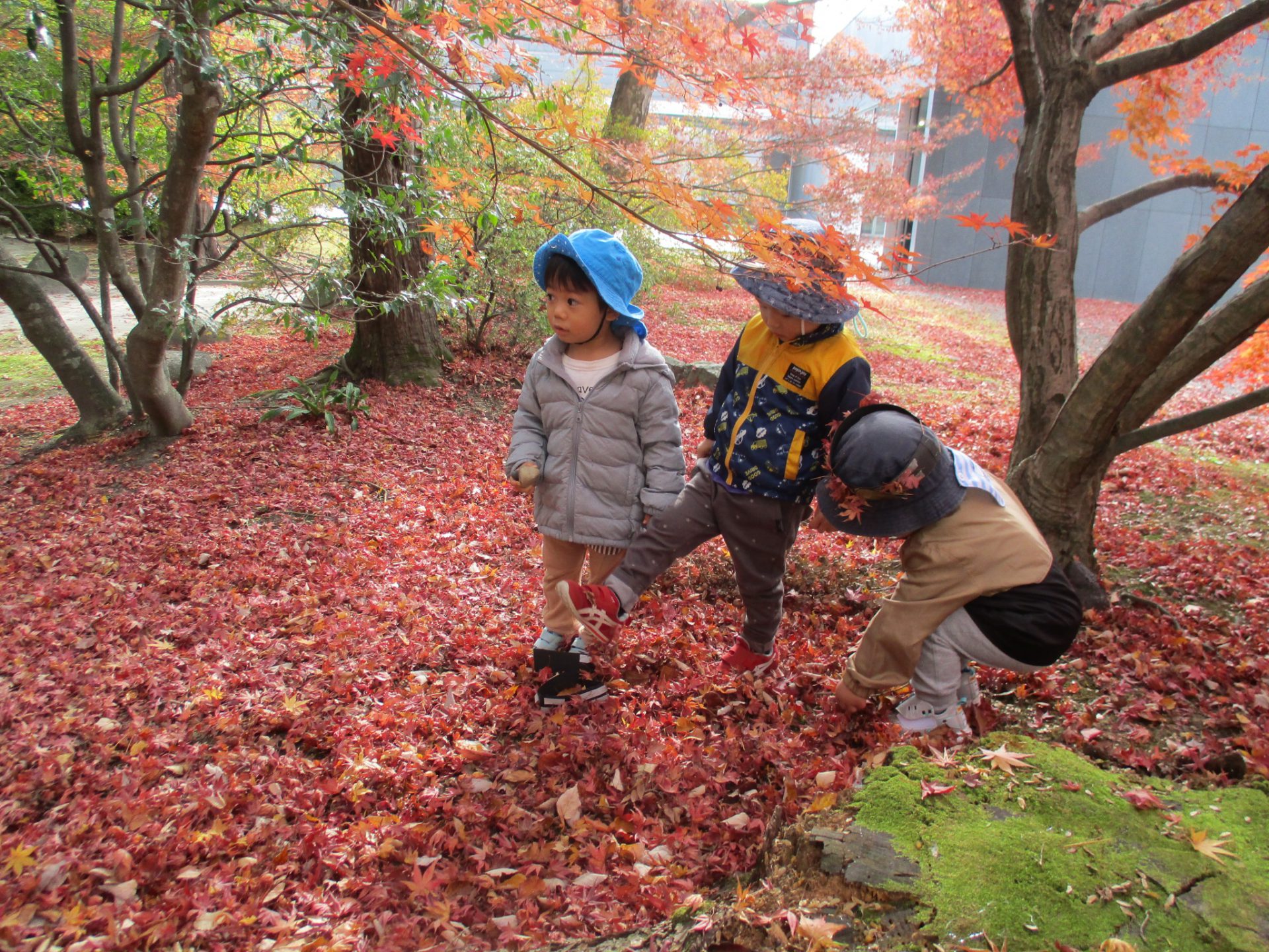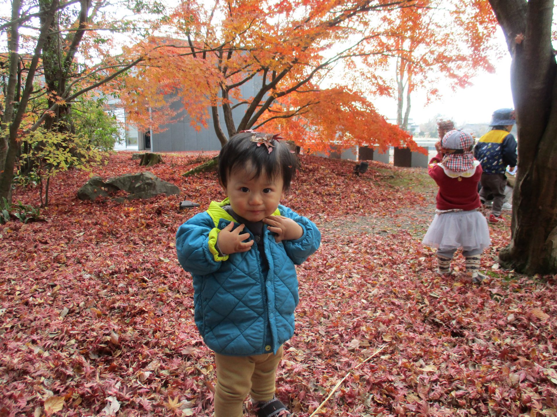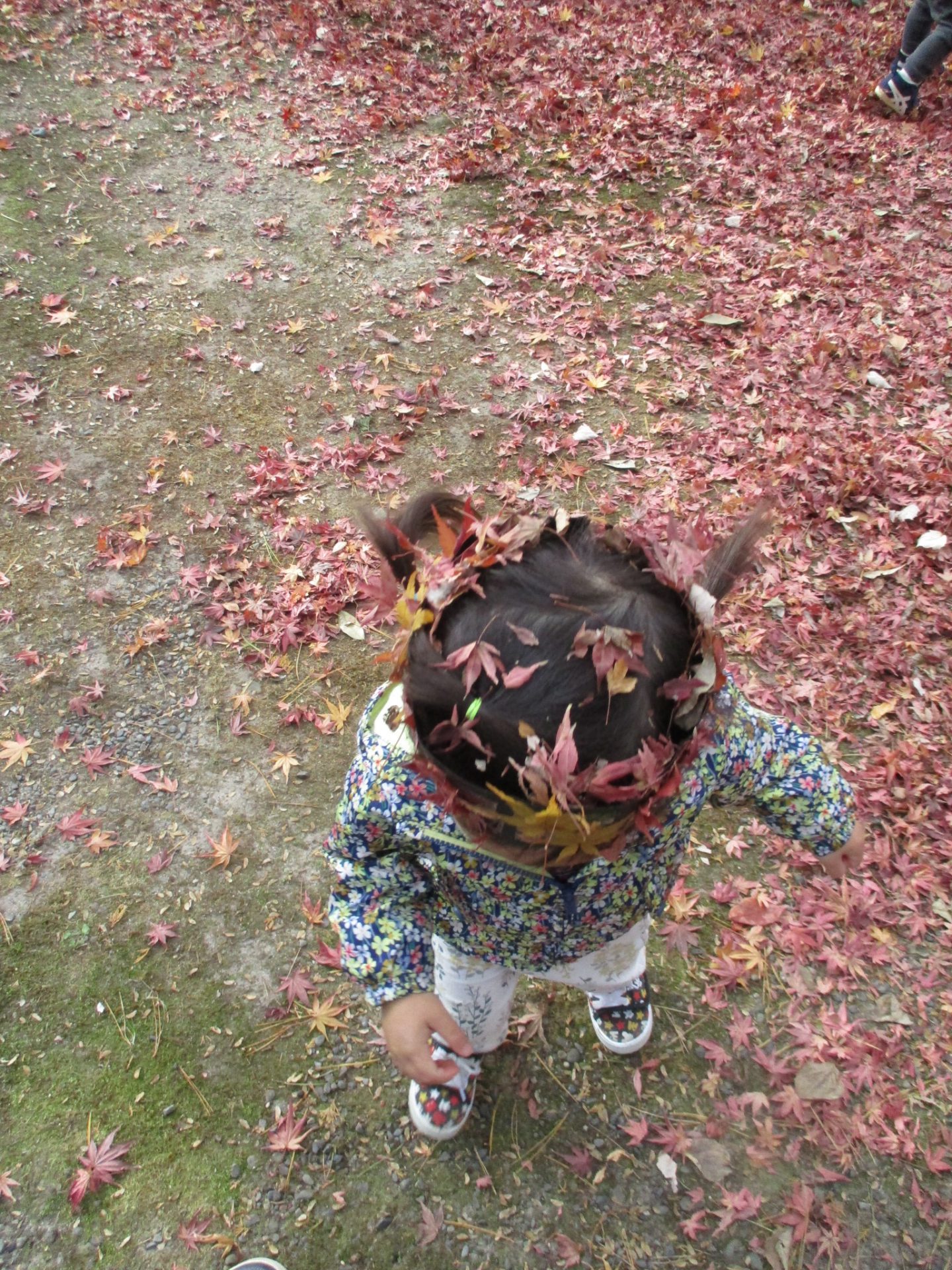 たくさんの真っ赤な落ち葉を見て散歩バックに集める姿、子ども達の上から葉っぱを散らすとうれしそうにする姿、葉っぱかんむりに興味を持って葉をくっつけて頭にかぶりポーズをとる姿...一人ひとり楽しさを感じることはちがうけれど葉っぱに興味を持てたことにうれしく思います。成長していく中での未満児のこの時のこの体験が土台になっていってすくすくと育っていってほしいと思います。