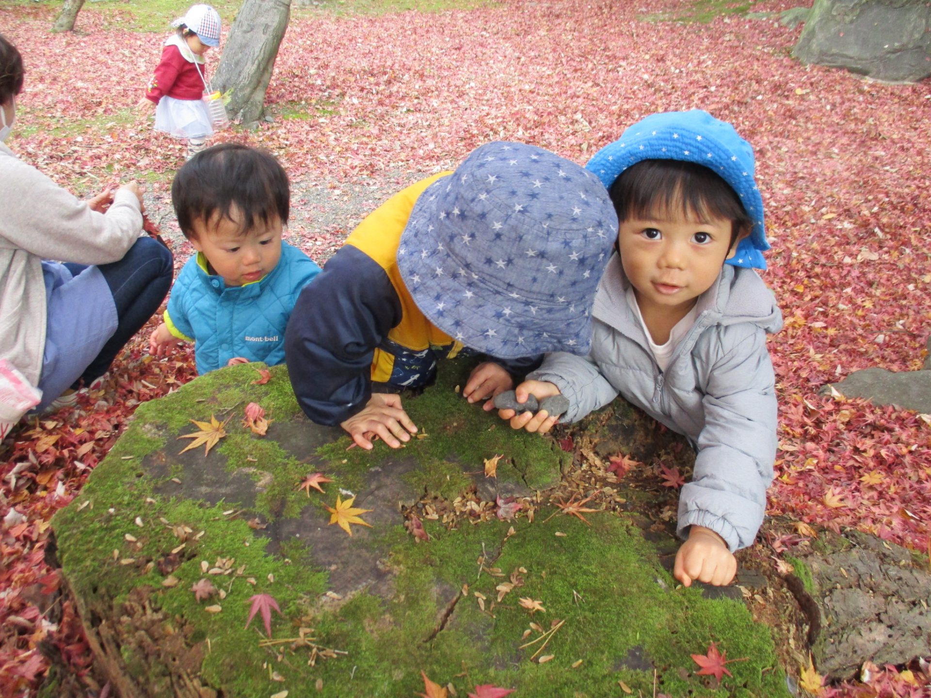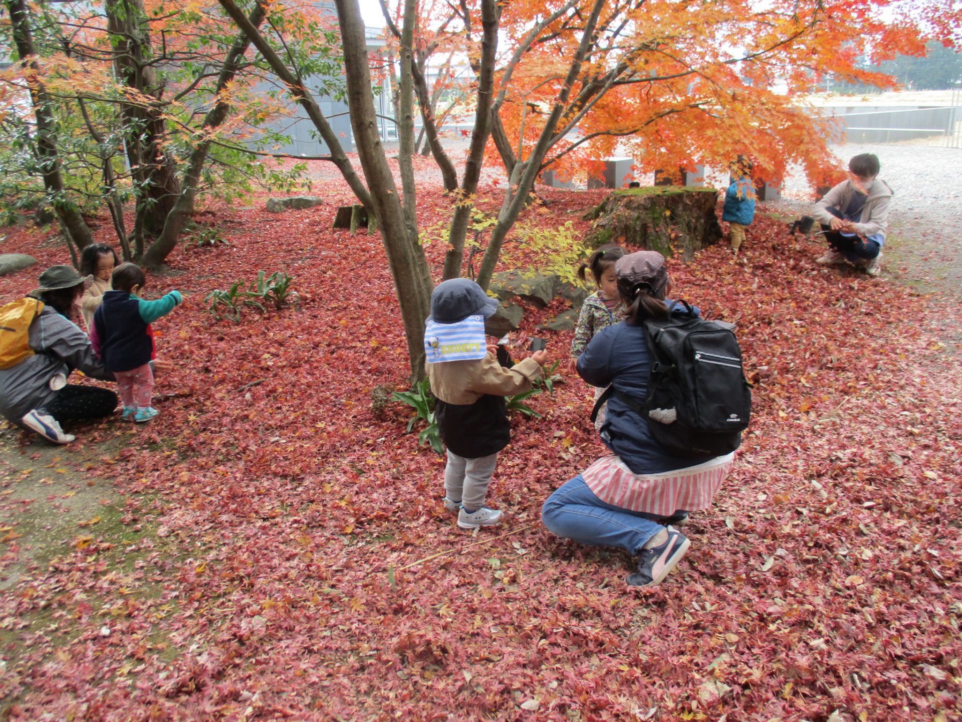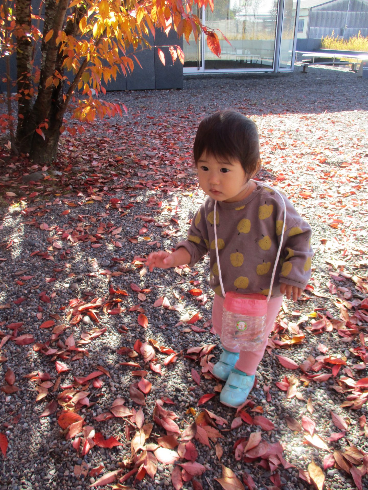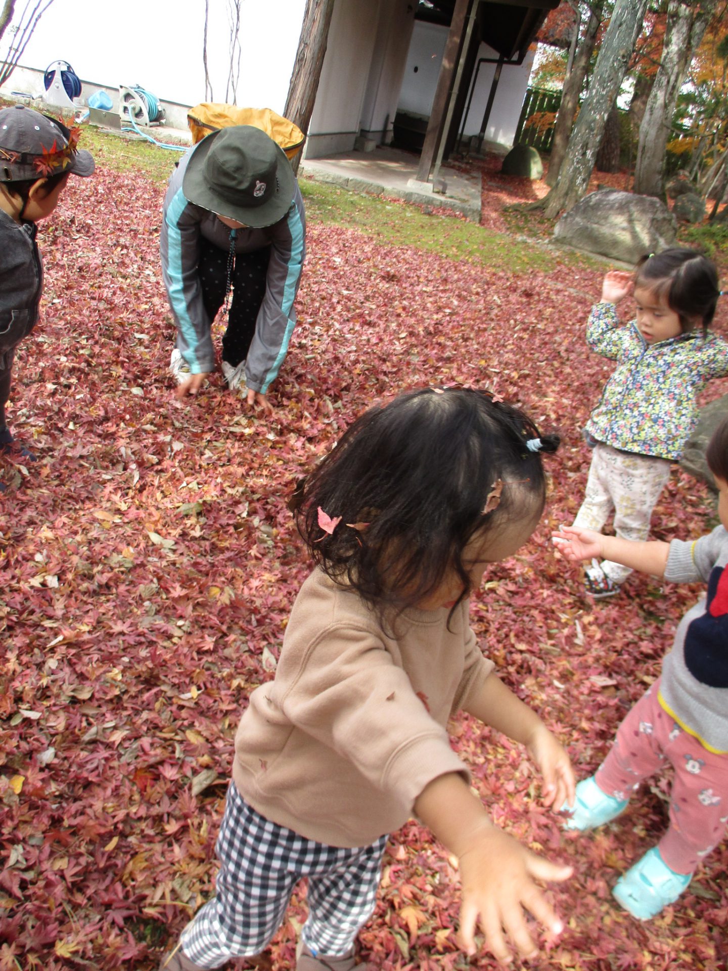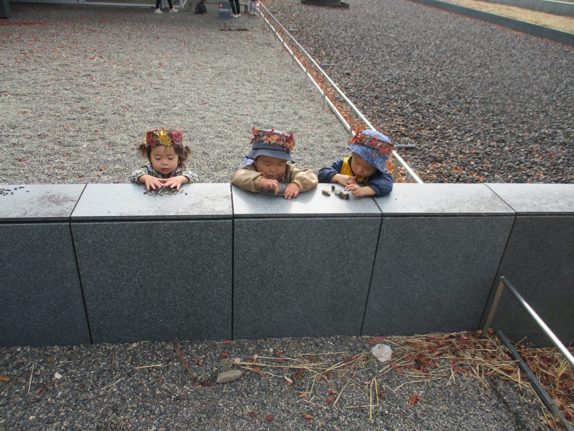たくさんの真っ赤な落ち葉を見て散歩バックに集める姿、子ども達の上から葉っぱを散らすとうれしそうにする姿、葉っぱかんむりに興味を持って葉をくっつけて頭にかぶりポーズをとる姿...一人ひとり楽しさを感じることはちがうけれど葉っぱに興味を持てたことにうれしく思います。成長していく中での未満児のこの時のこの体験が土台になっていってすくすくと育っていってほしいと思います。