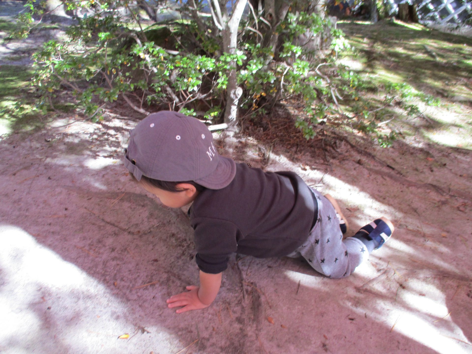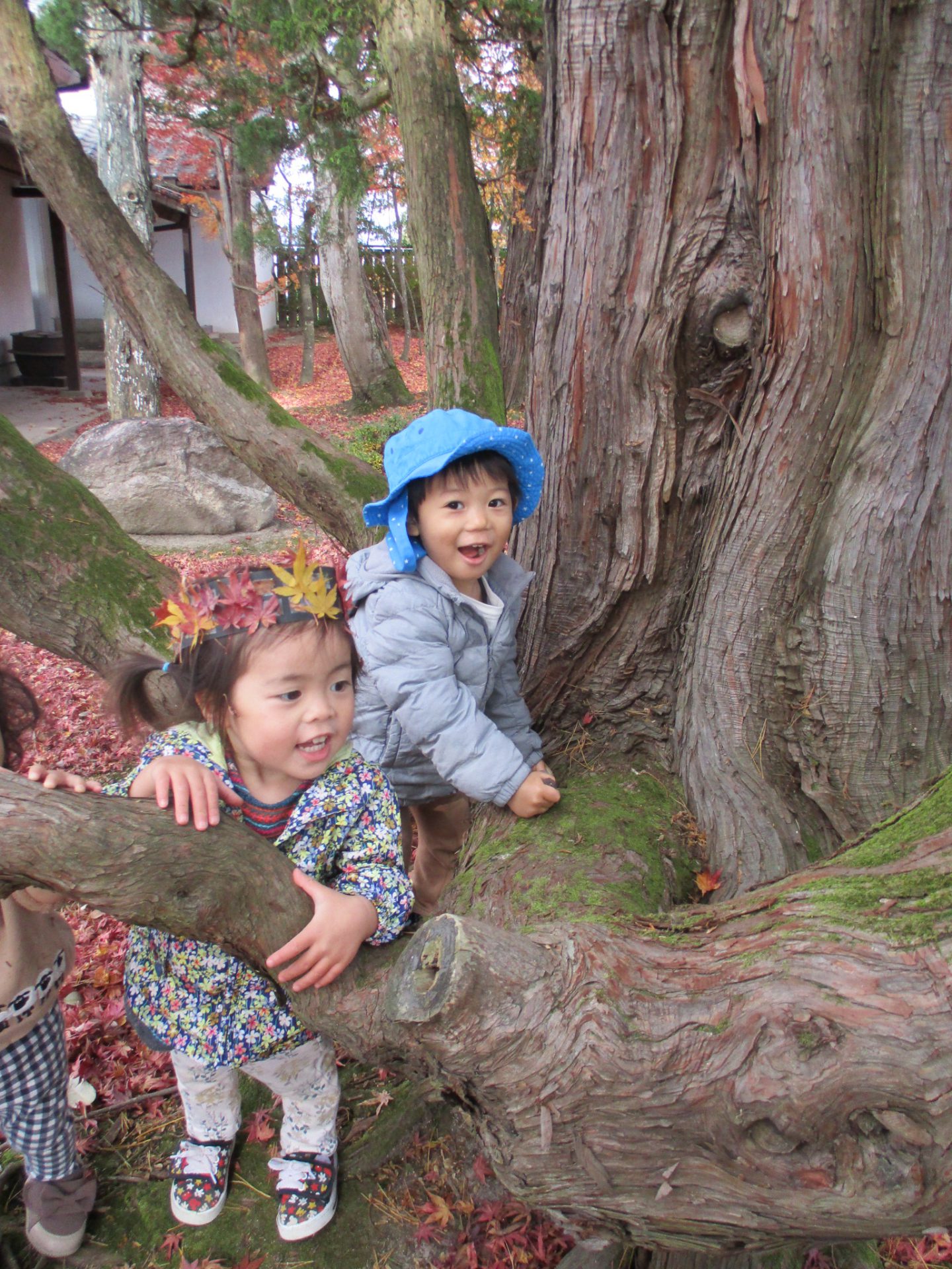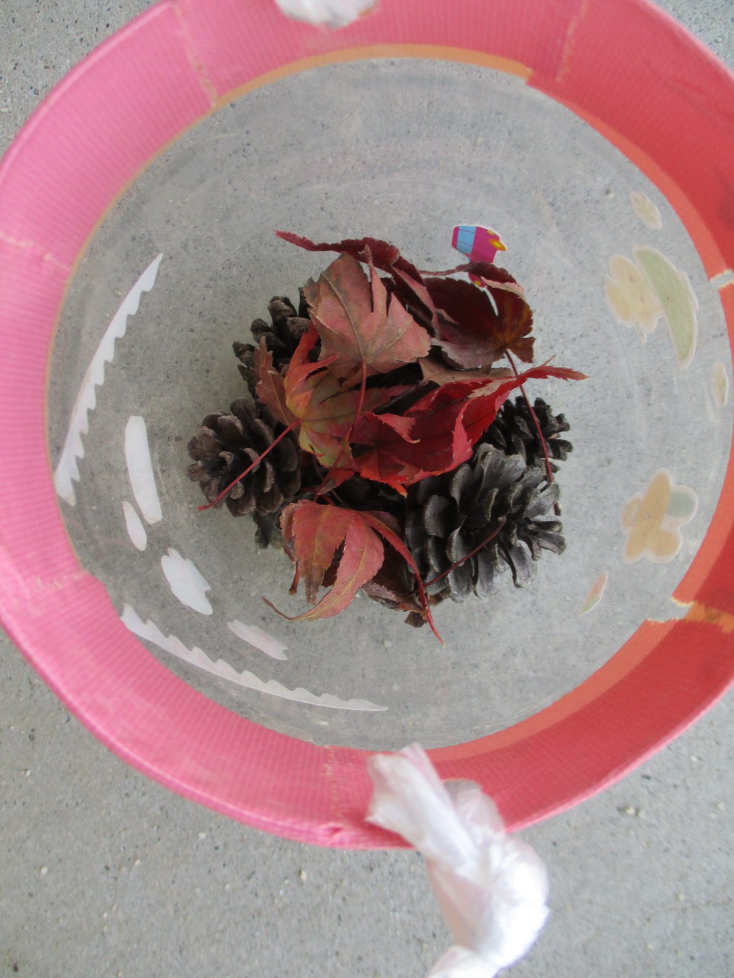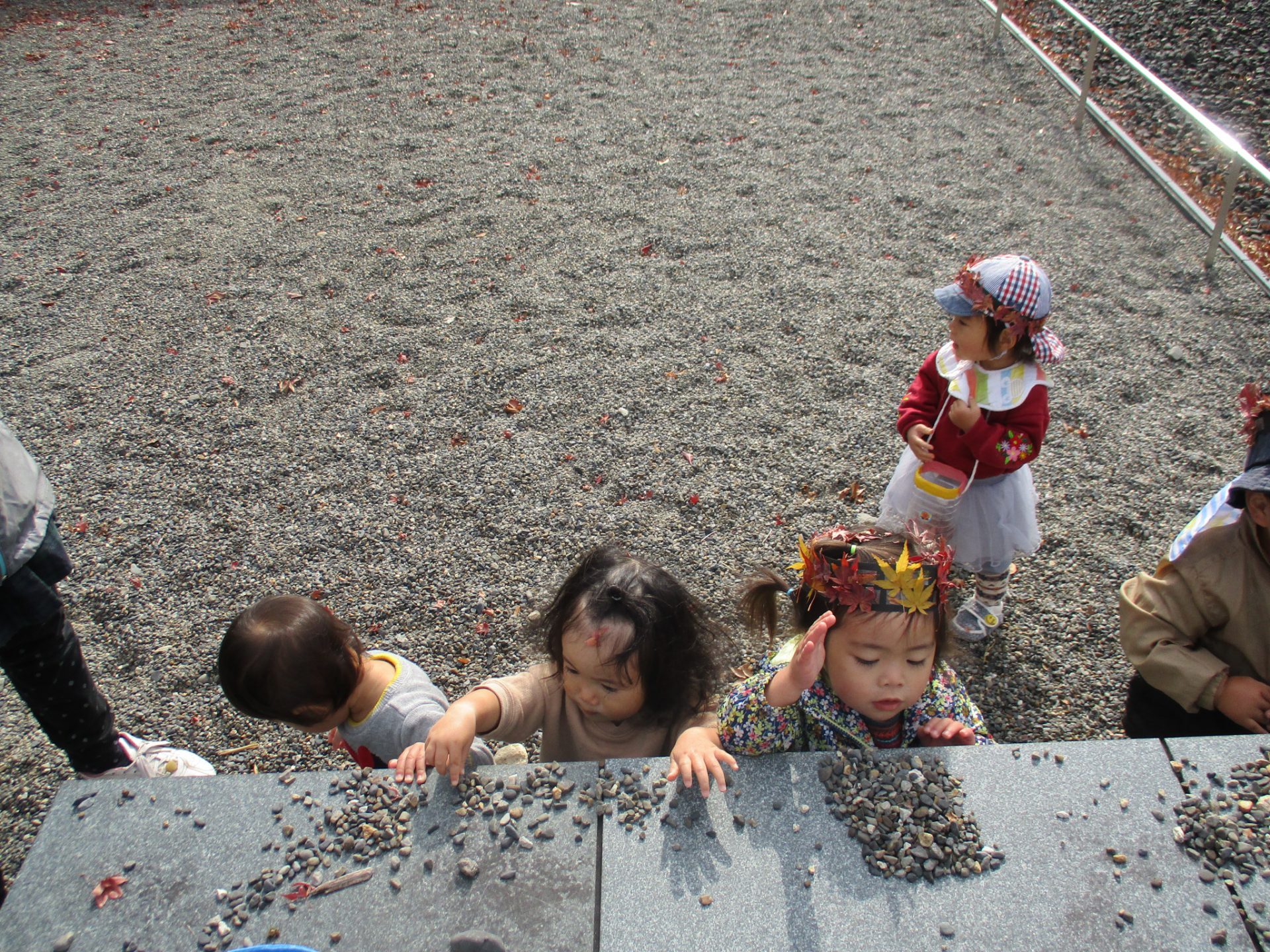 たくさんの真っ赤な落ち葉を見て散歩バックに集める姿、子ども達の上から葉っぱを散らすとうれしそうにする姿、葉っぱかんむりに興味を持って葉をくっつけて頭にかぶりポーズをとる姿...一人ひとり楽しさを感じることはちがうけれど葉っぱに興味を持てたことにうれしく思います。成長していく中での未満児のこの時のこの体験が土台になっていってすくすくと育っていってほしいと思います。