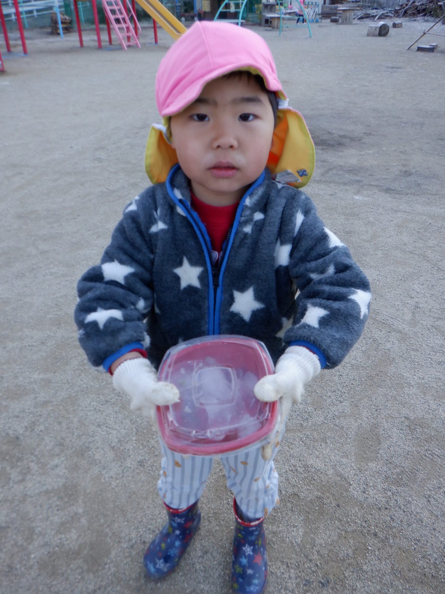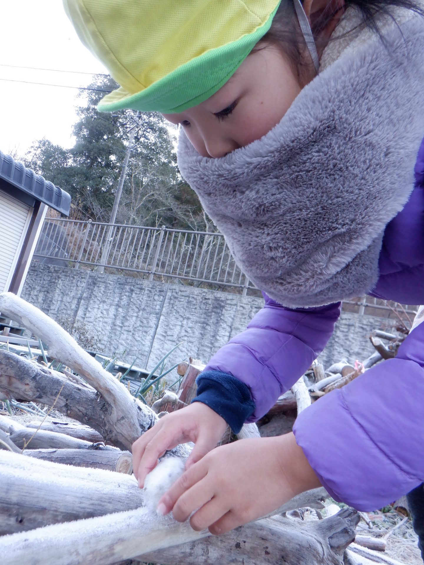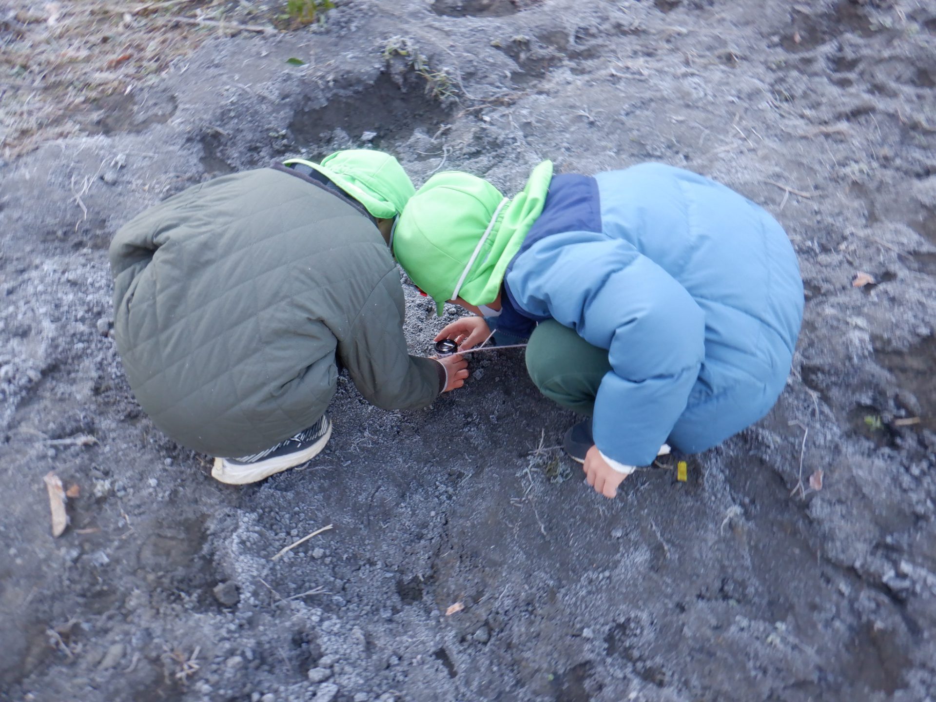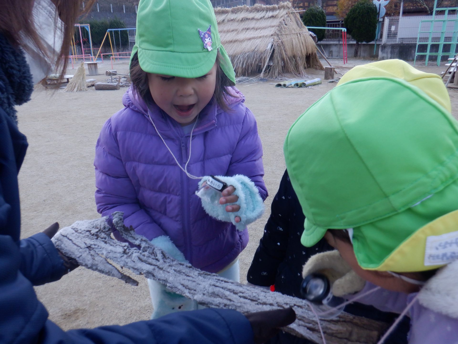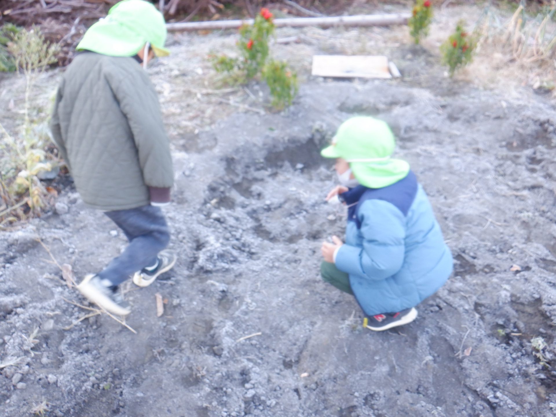 冷え込みの厳しい朝、子どもたちはすぐに園庭に飛び出し、「寒いね~」と言いながらも寒さを楽しんでいるように見えます。「今日は寒いね」「見て~、真っ白!」と霜が降りた辺りを見回し、いつも見えている小芹の山や雷山が見えないことにも歓声を上げていました。そして園庭のあちこちに降りた霜の形が場所によって違うことを不思議がったり、日陰の池は凍ってたけど、桶の水は凍っていないことなどを友だちと一緒に発見してあそぶ姿がありました。