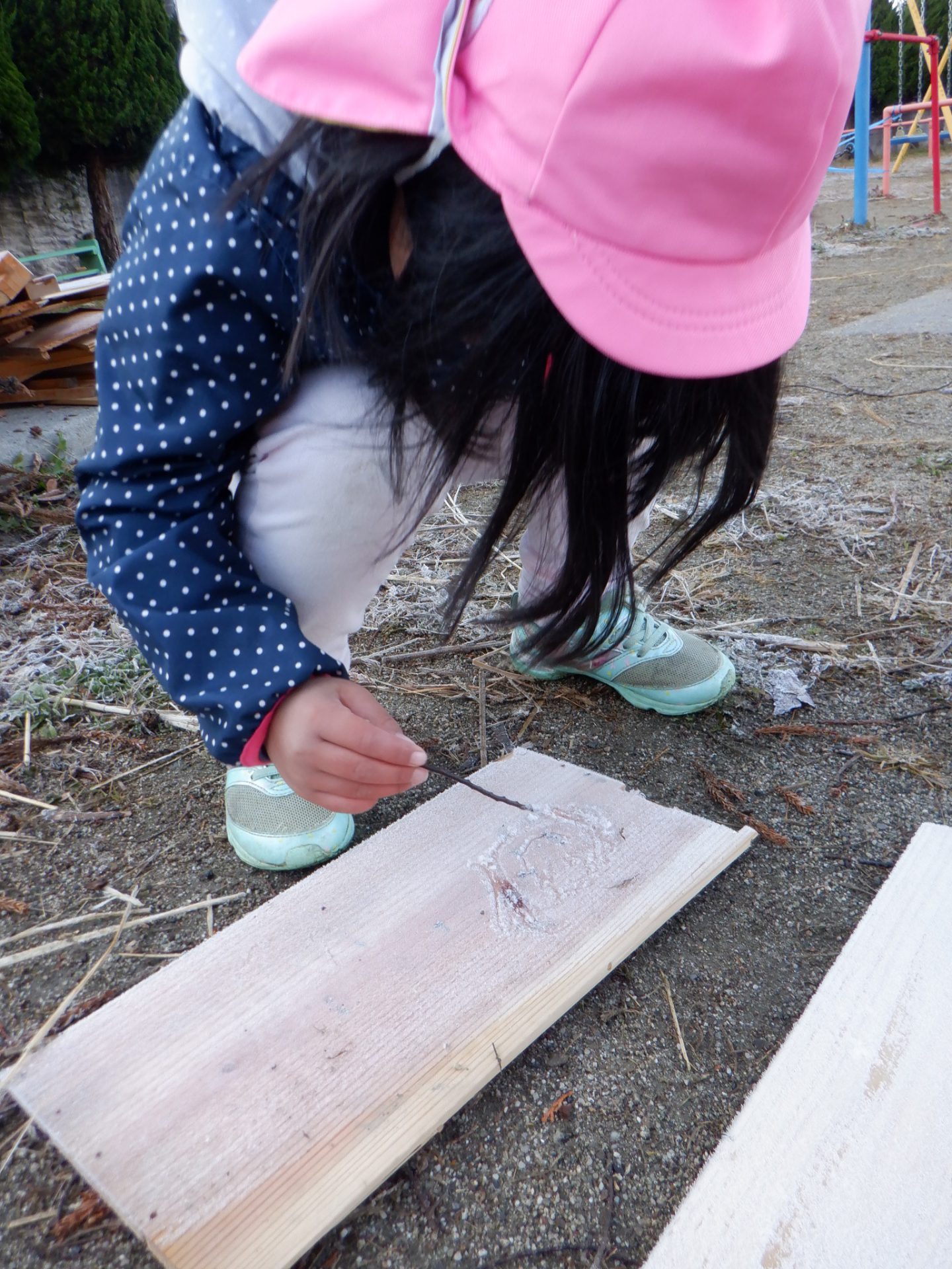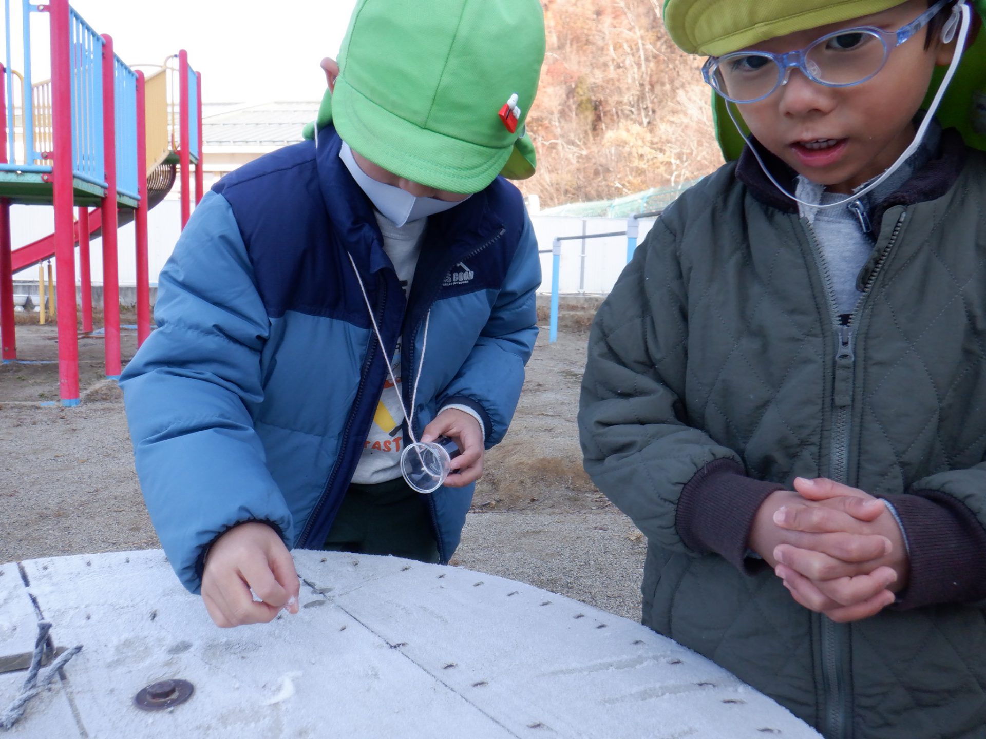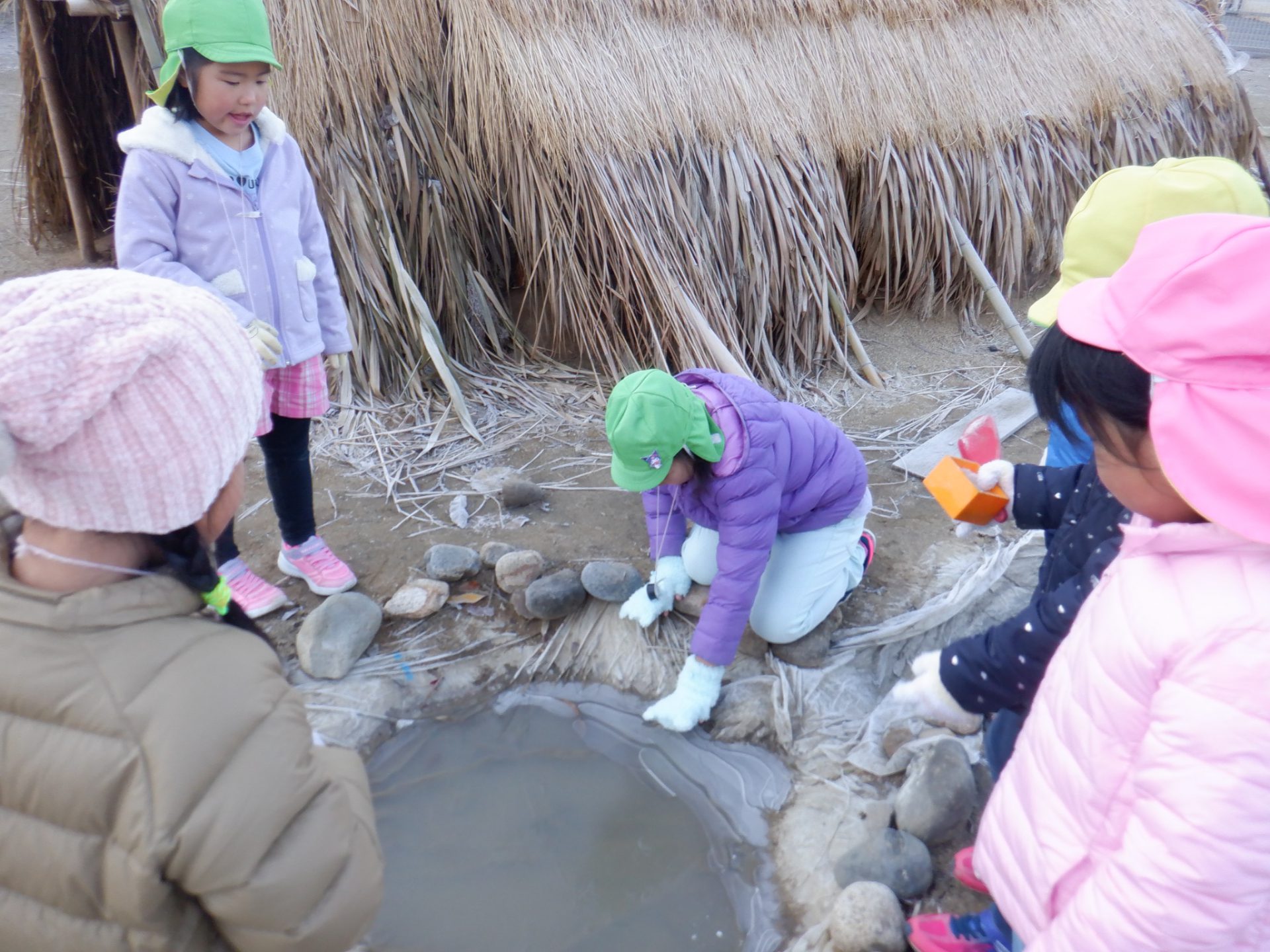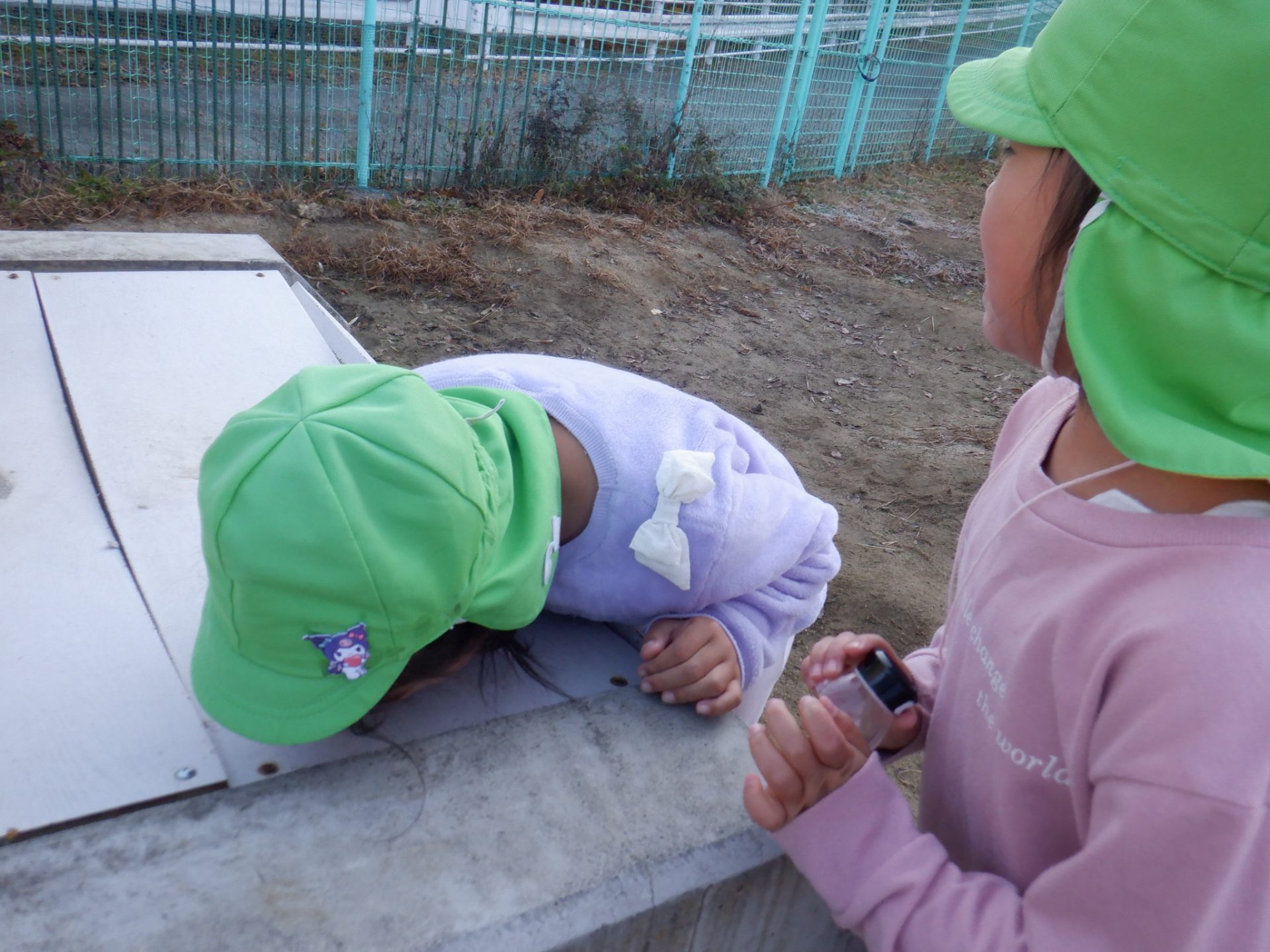 冷え込みの厳しい朝、子どもたちはすぐに園庭に飛び出し、「寒いね~」と言いながらも寒さを楽しんでいるように見えます。「今日は寒いね」「見て~、真っ白!」と霜が降りた辺りを見回し、いつも見えている小芹の山や雷山が見えないことにも歓声を上げていました。そして園庭のあちこちに降りた霜の形が場所によって違うことを不思議がったり、日陰の池は凍ってたけど、桶の水は凍っていないことなどを友だちと一緒に発見してあそぶ姿がありました。