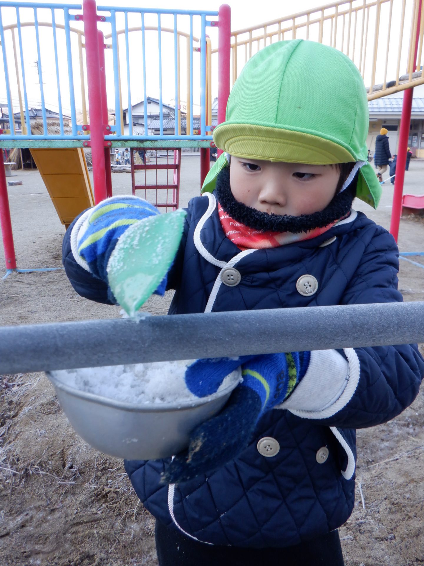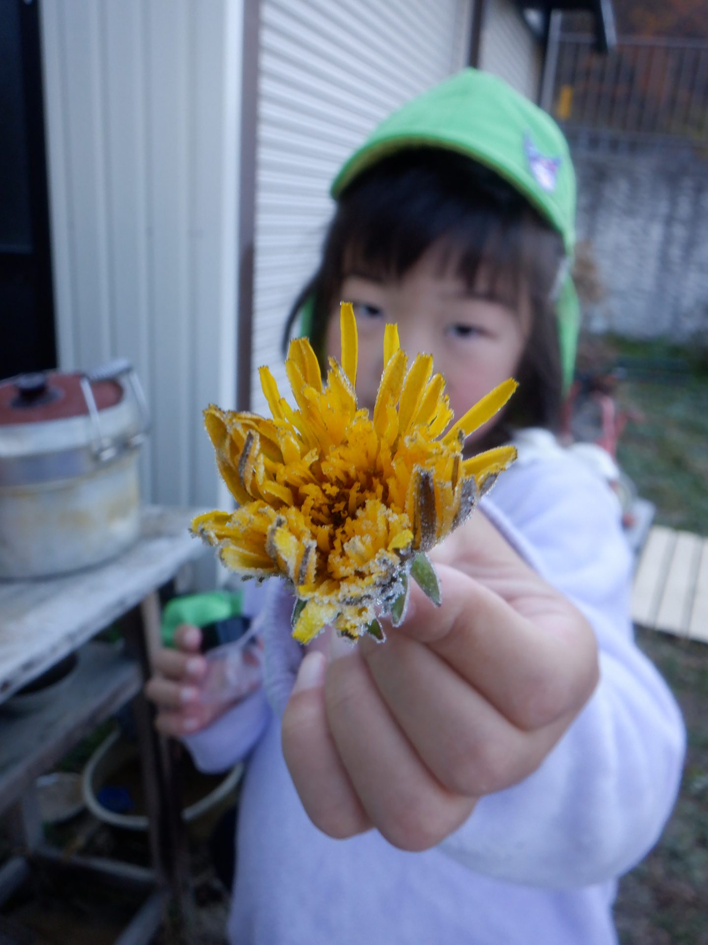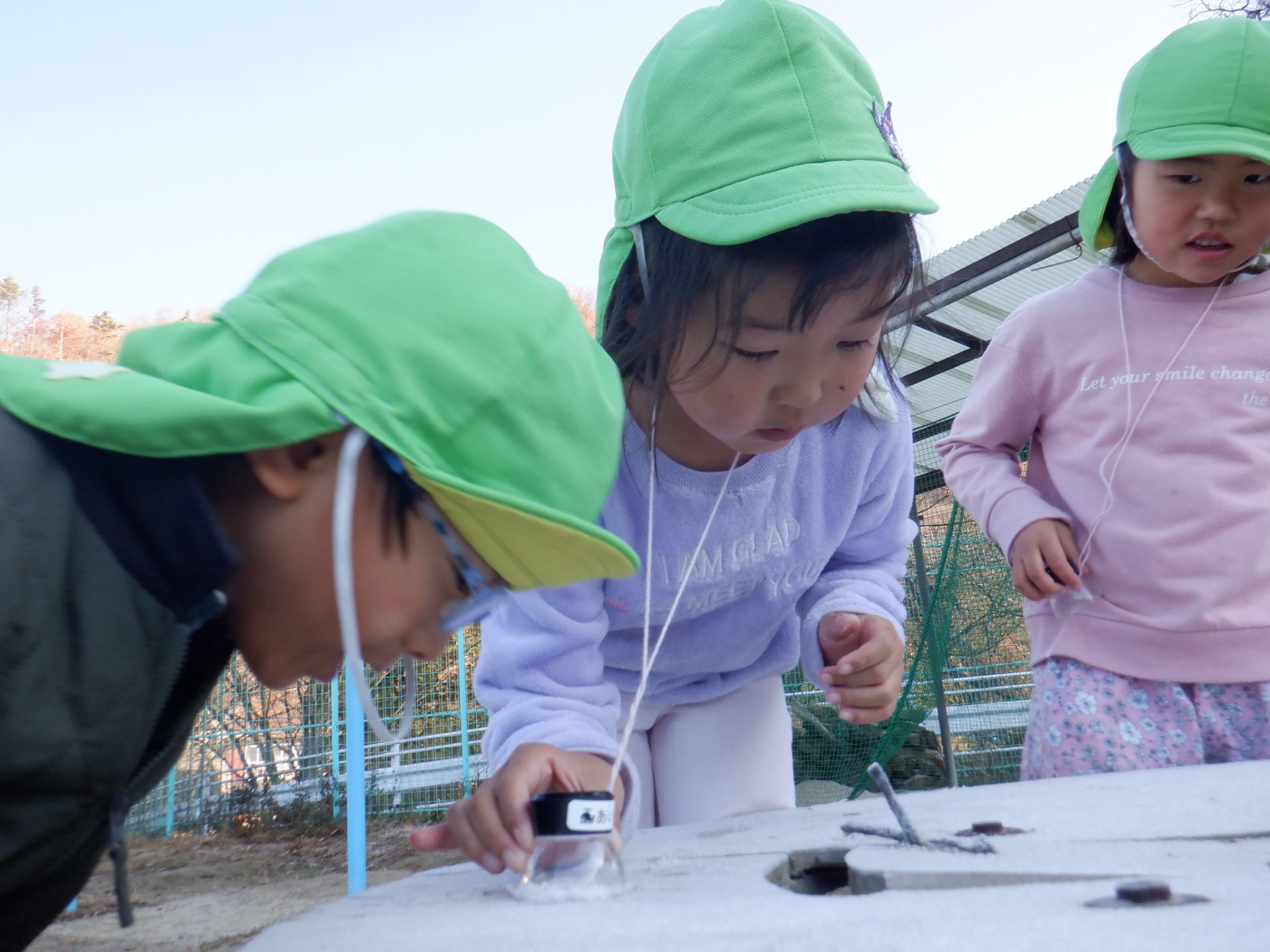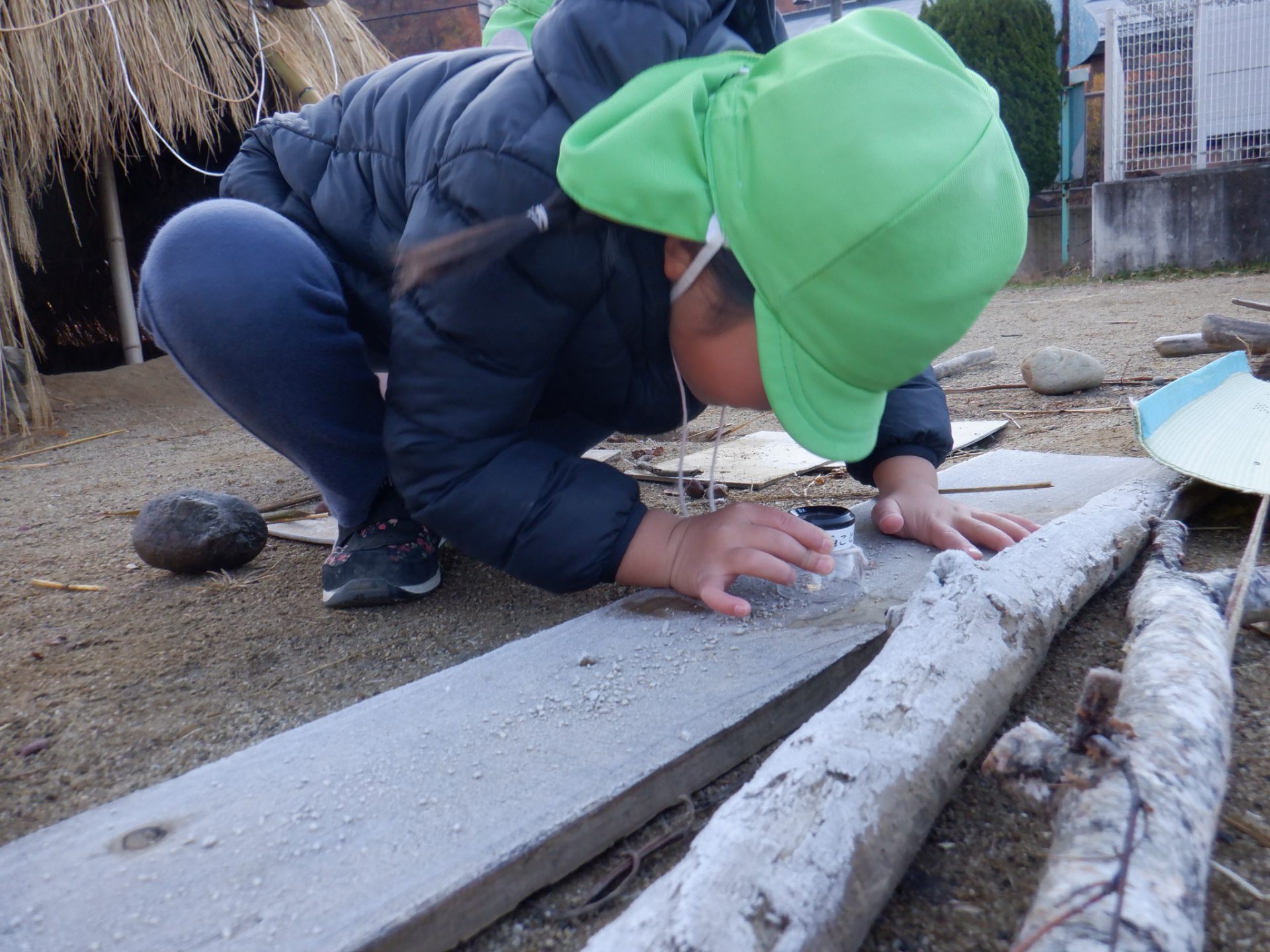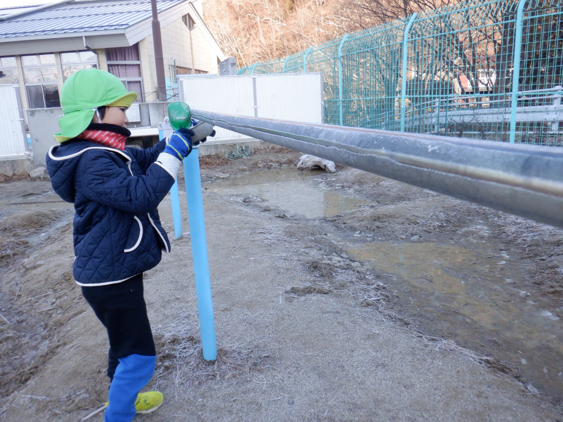 冷え込みの厳しい朝、子どもたちはすぐに園庭に飛び出し、「寒いね~」と言いながらも寒さを楽しんでいるように見えます。「今日は寒いね」「見て~、真っ白!」と霜が降りた辺りを見回し、いつも見えている小芹の山や雷山が見えないことにも歓声を上げていました。そして園庭のあちこちに降りた霜の形が場所によって違うことを不思議がったり、日陰の池は凍ってたけど、桶の水は凍っていないことなどを友だちと一緒に発見してあそぶ姿がありました。