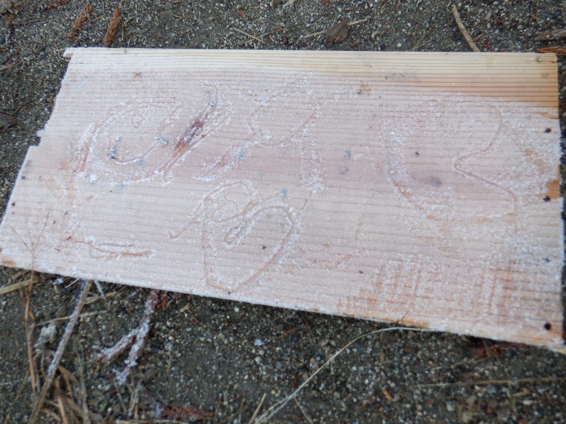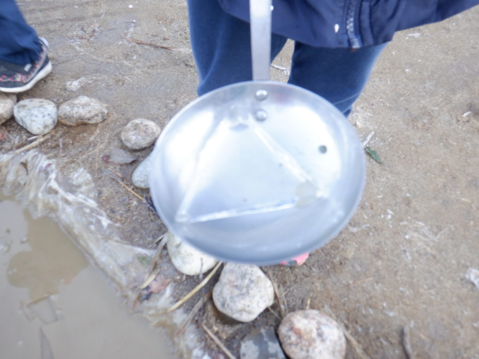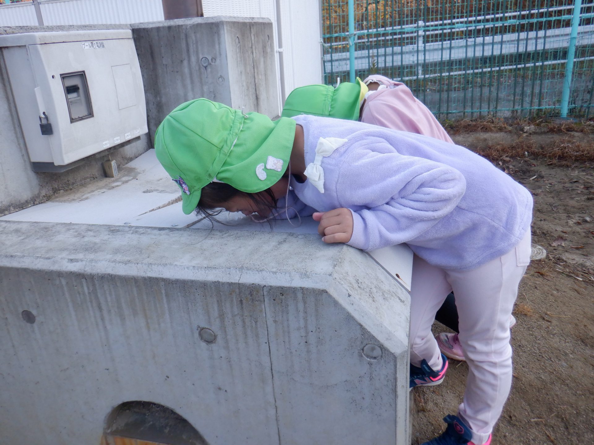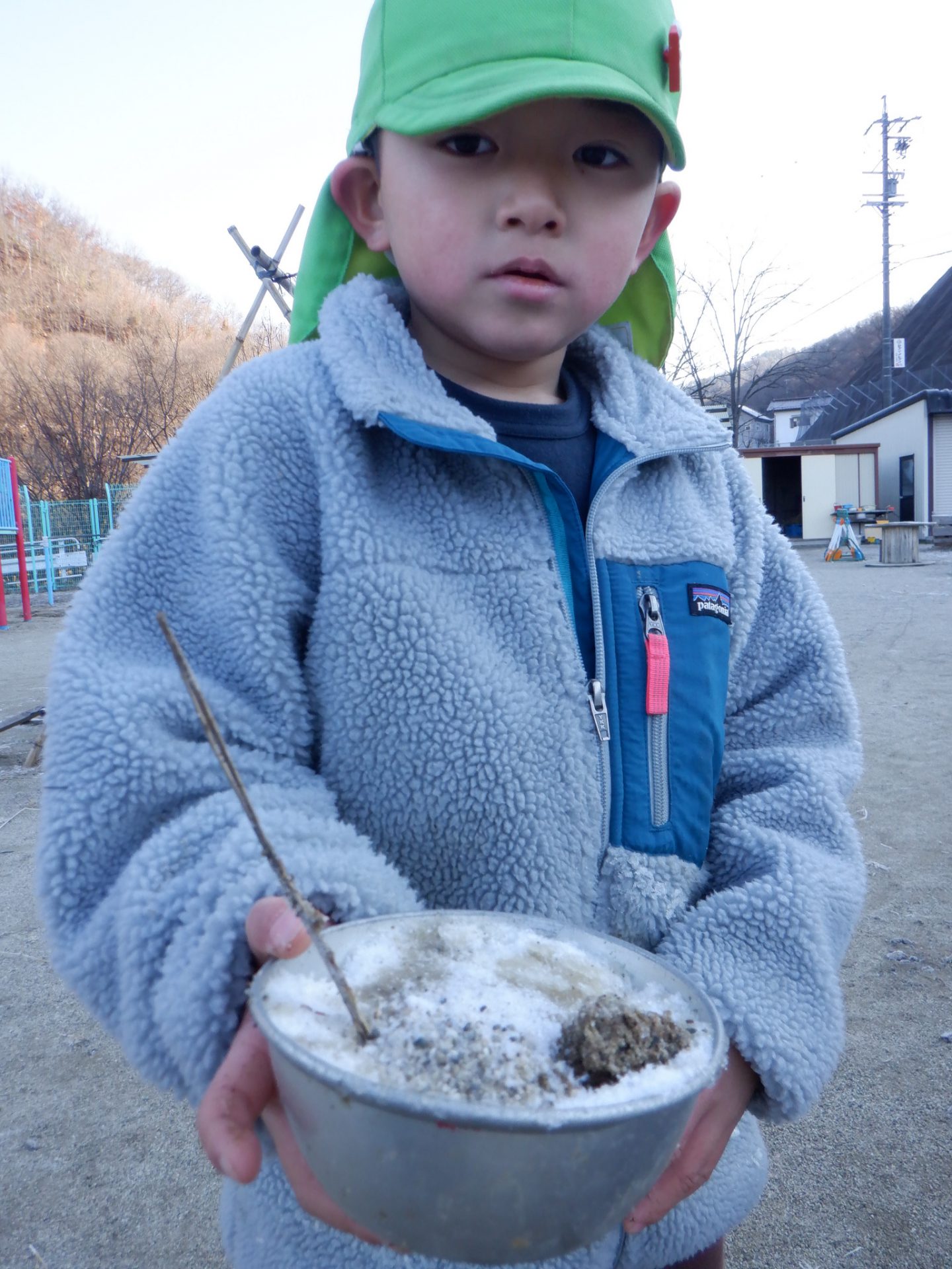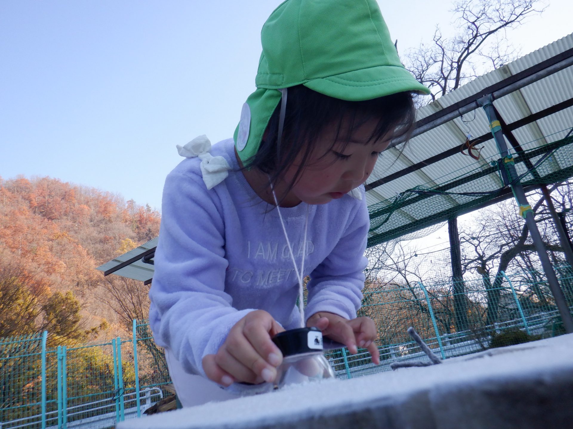 冷え込みの厳しい朝、子どもたちはすぐに園庭に飛び出し、「寒いね~」と言いながらも寒さを楽しんでいるように見えます。「今日は寒いね」「見て~、真っ白!」と霜が降りた辺りを見回し、いつも見えている小芹の山や雷山が見えないことにも歓声を上げていました。そして園庭のあちこちに降りた霜の形が場所によって違うことを不思議がったり、日陰の池は凍ってたけど、桶の水は凍っていないことなどを友だちと一緒に発見してあそぶ姿がありました。