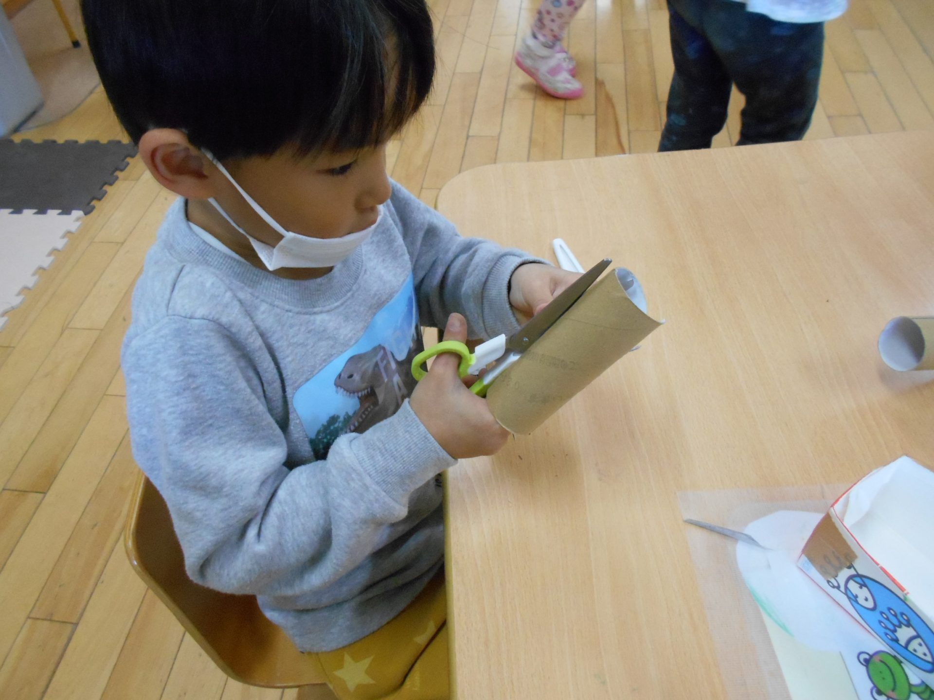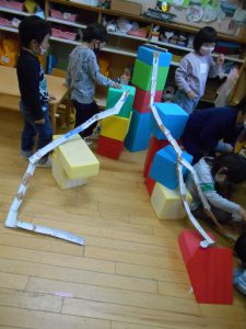 「滑り台作れるかな」「作ってみようよ」「何を使おうかな」「牛乳パック?トイレットペーパーの芯?」「トイレットペーパーの芯を切ると、滑り台みたいだね。」「つなげたらどうなるかな?」