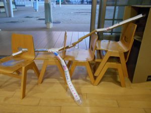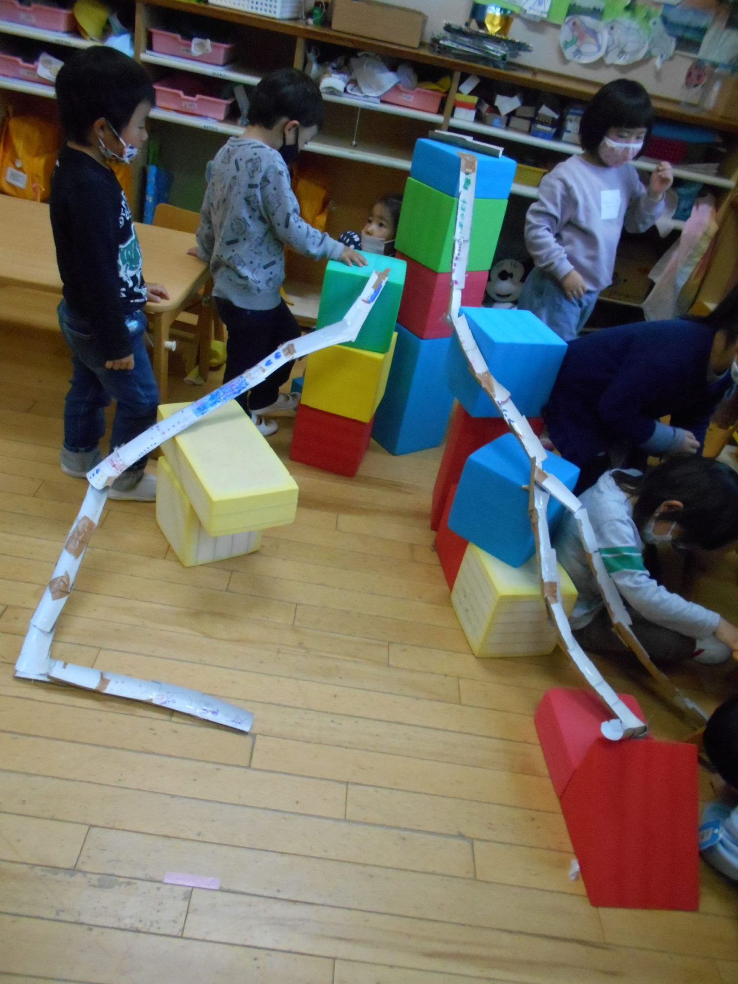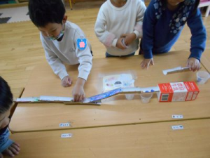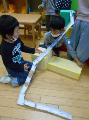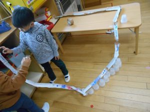 「椅子を使ってみよう」「下に何か置くと転がりやすいね」子どもたちは高くしてみたり、曲げてみたり工夫していました。