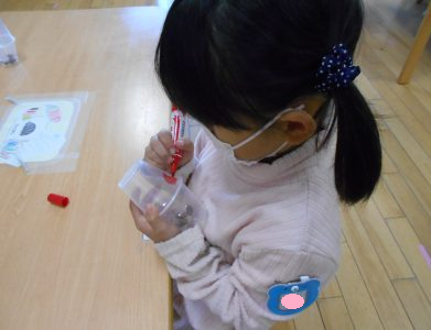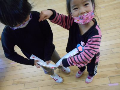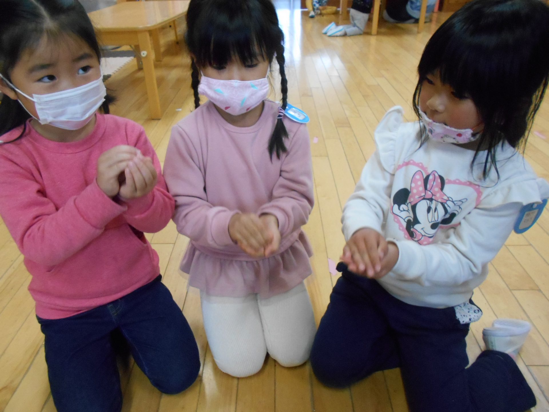 そのうちに、手の中に隠してわらべ歌遊びをしたり、マラカスを作ってミニコンサートをしたり、どんぐりケーキを作ったり等、様々な遊びを思いつき、楽しみました。