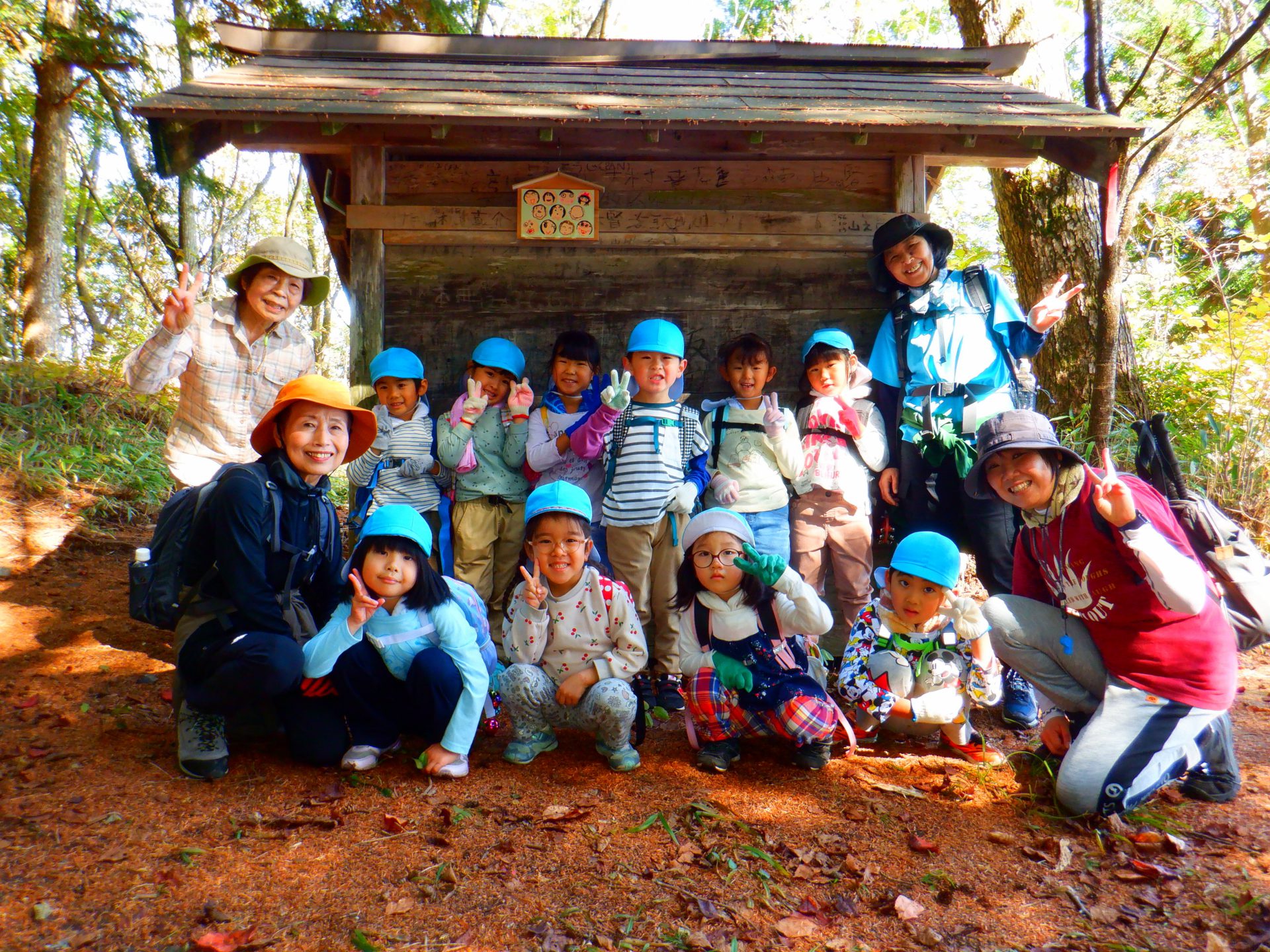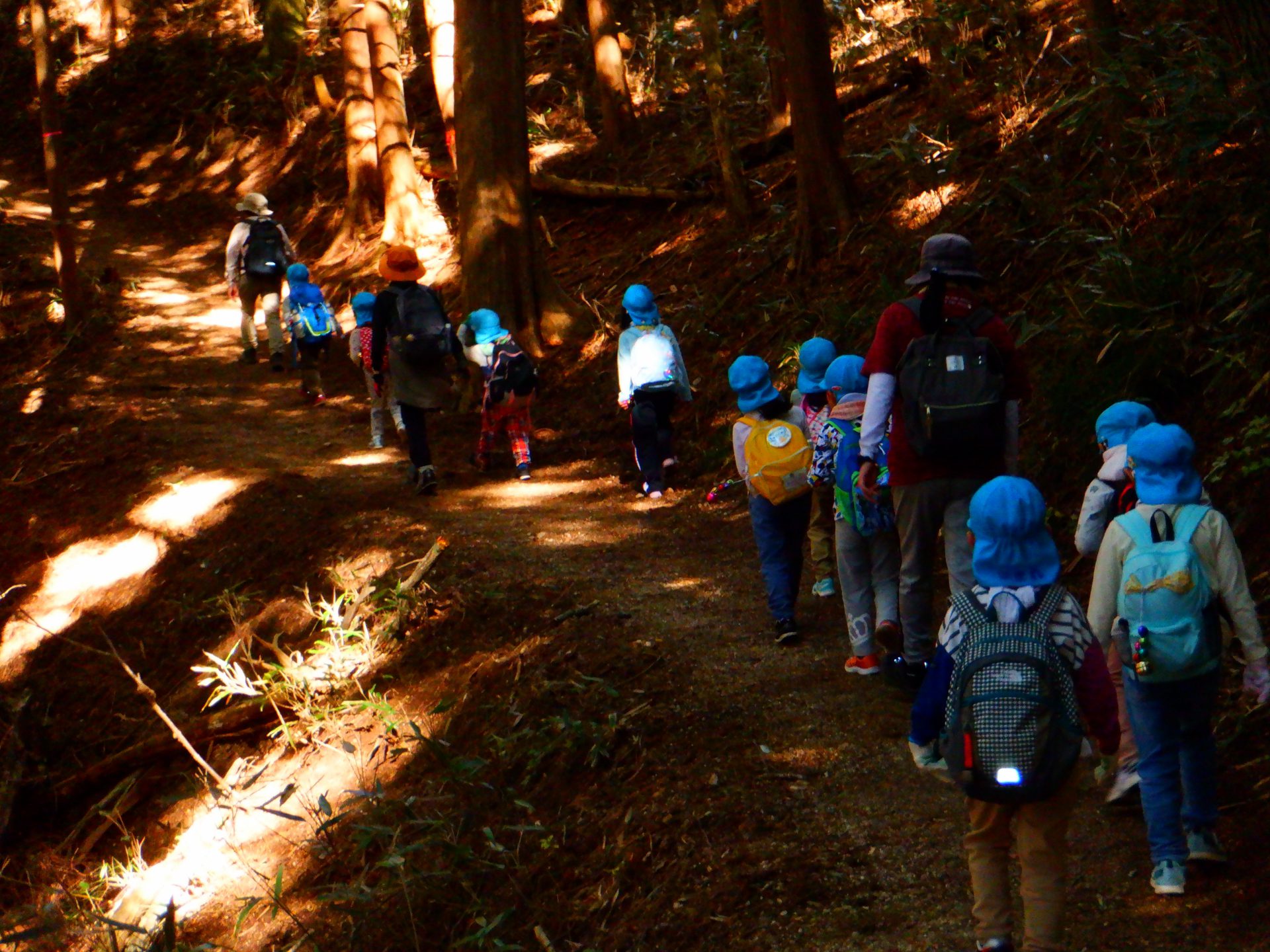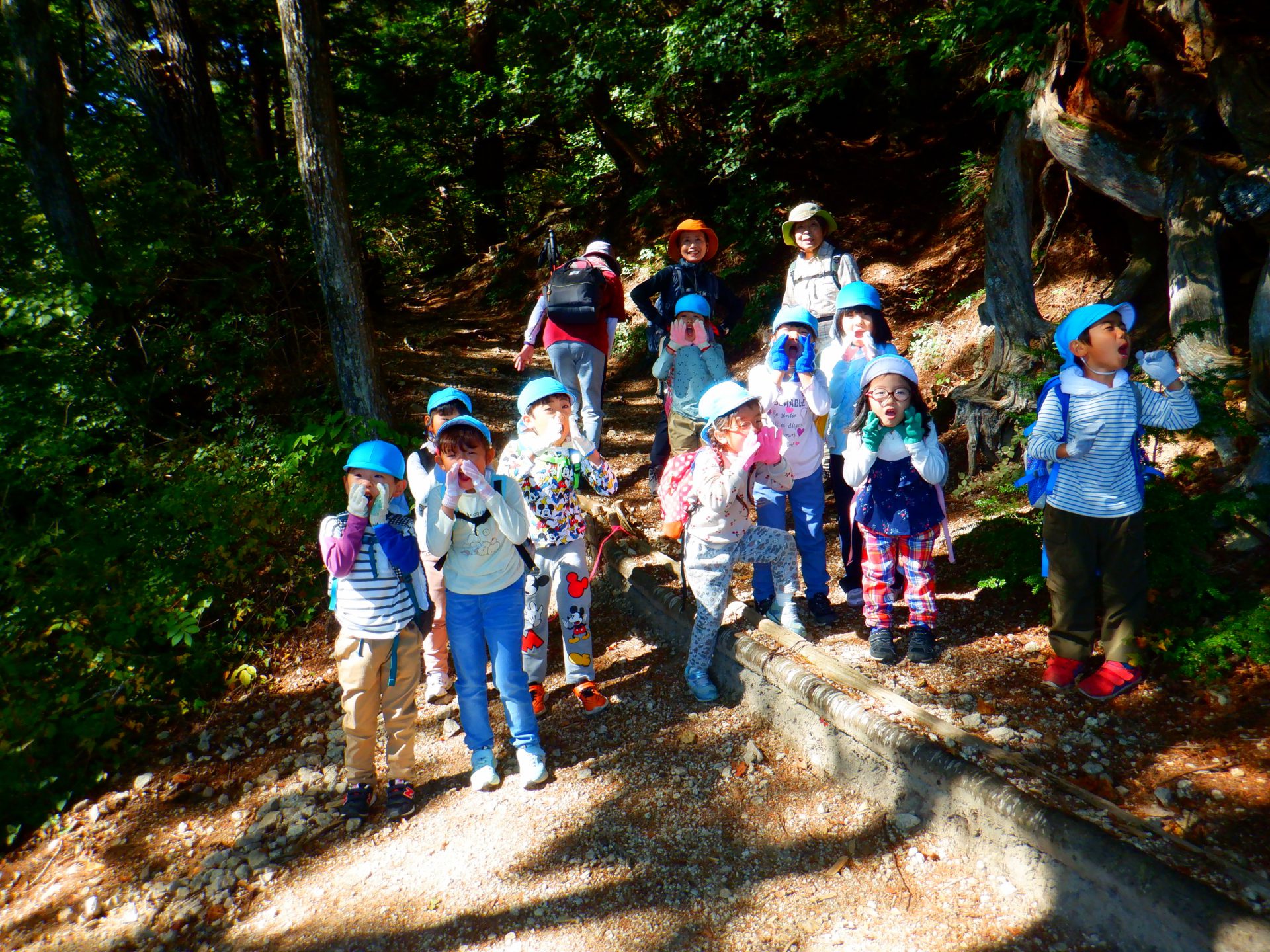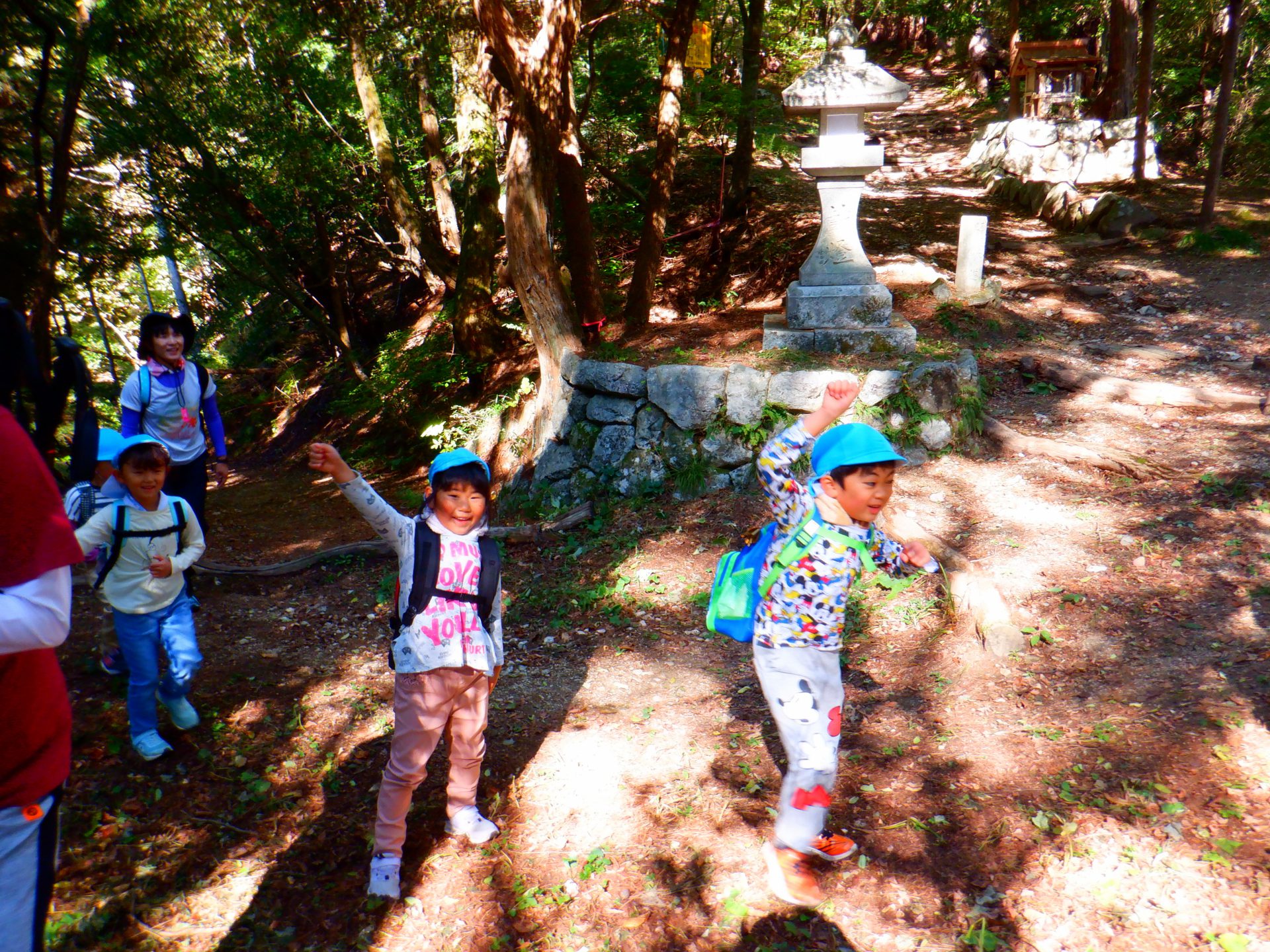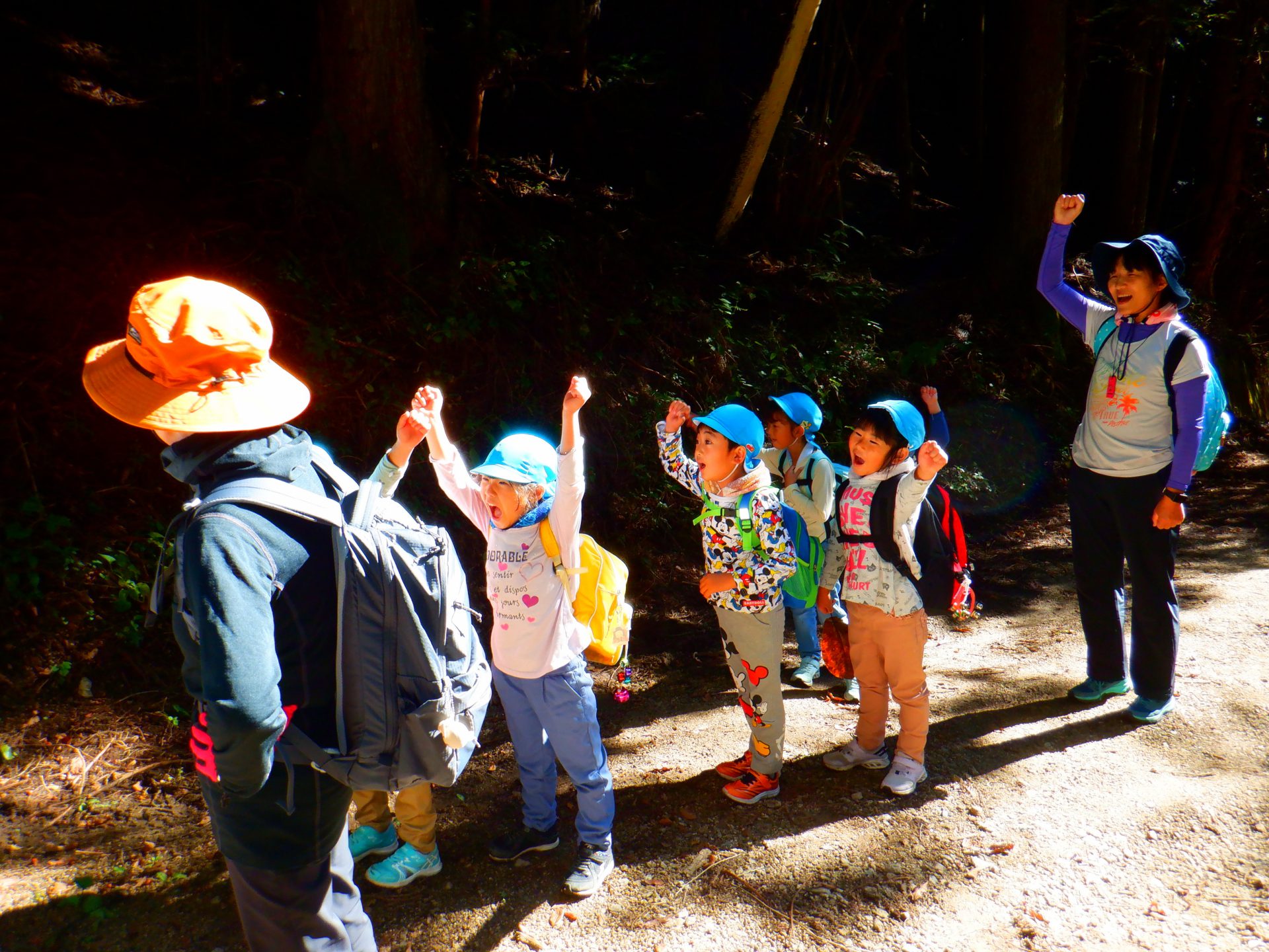 大人でもなかなか大変な登山。子どもたちは「どんぐりコロコロの替え歌」を歌うなど、どの子も楽しみながら、意欲的にどんどん歩いていく姿に感動した。