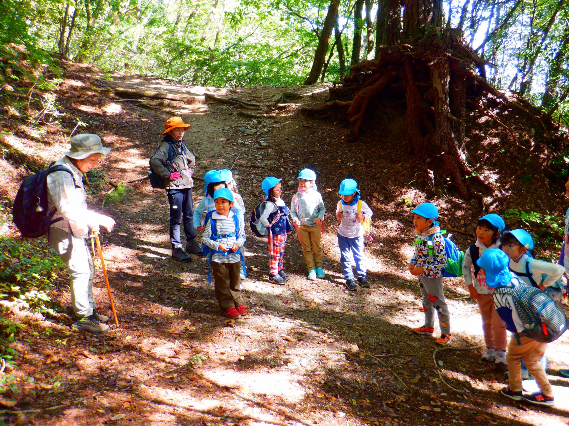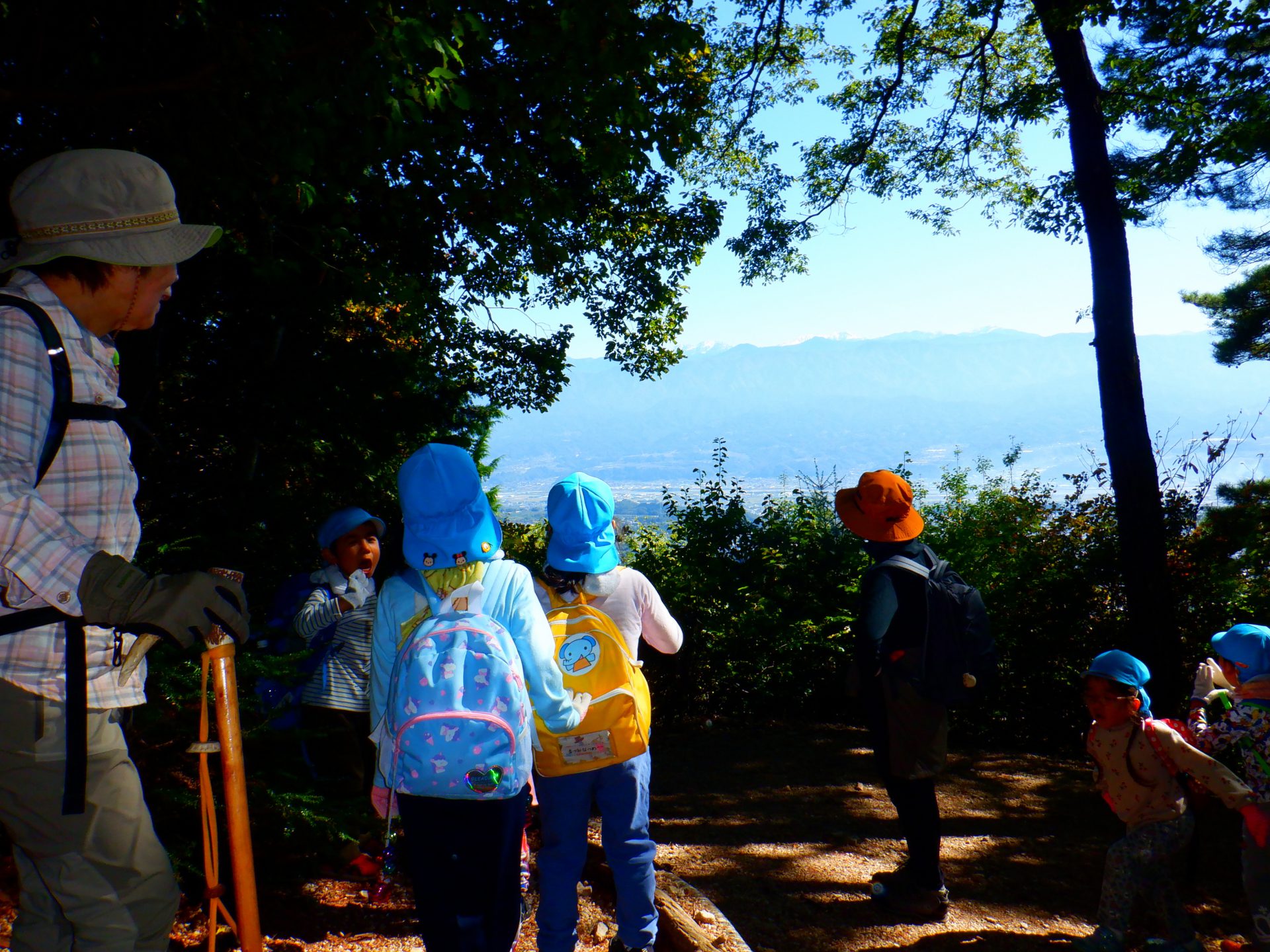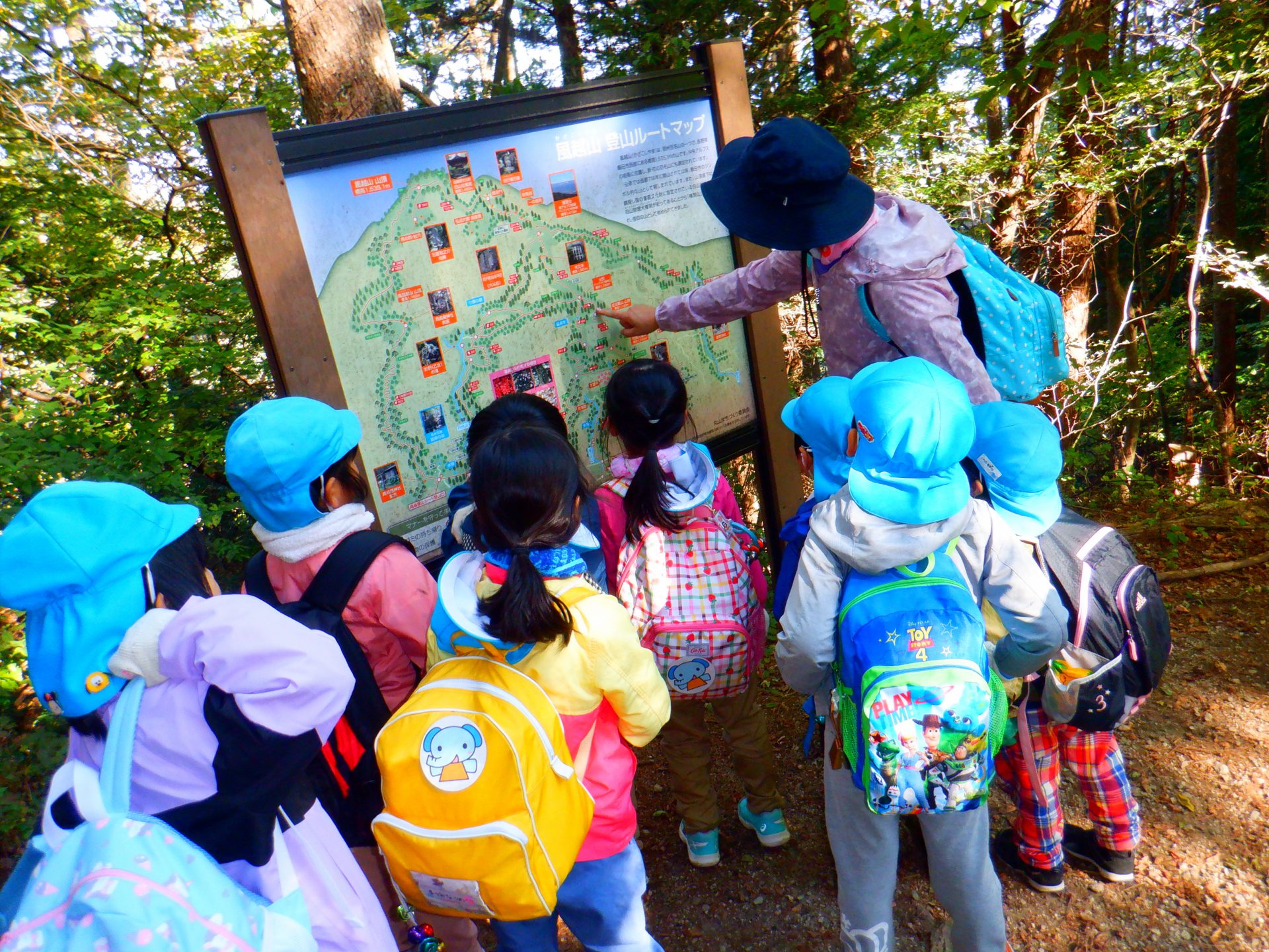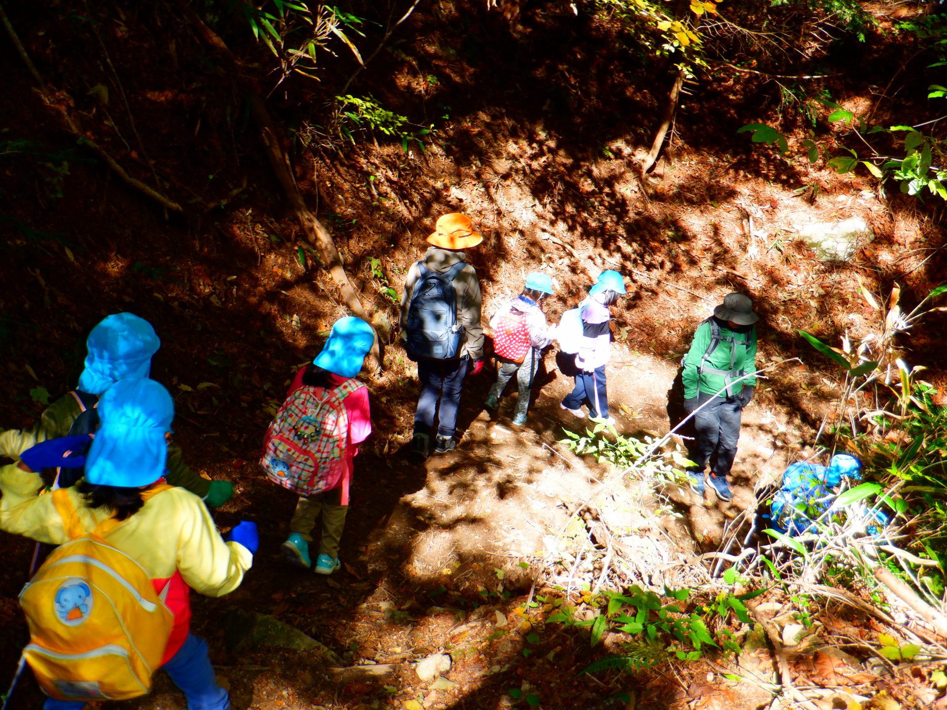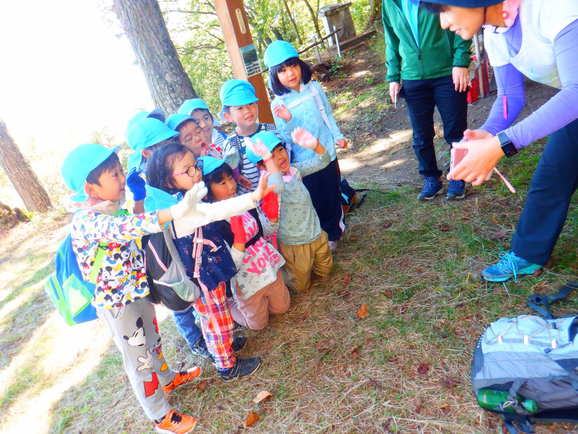 大人でもなかなか大変な登山。子どもたちは「どんぐりコロコロの替え歌」を歌うなど、どの子も楽しみながら、意欲的にどんどん歩いていく姿に感動した。