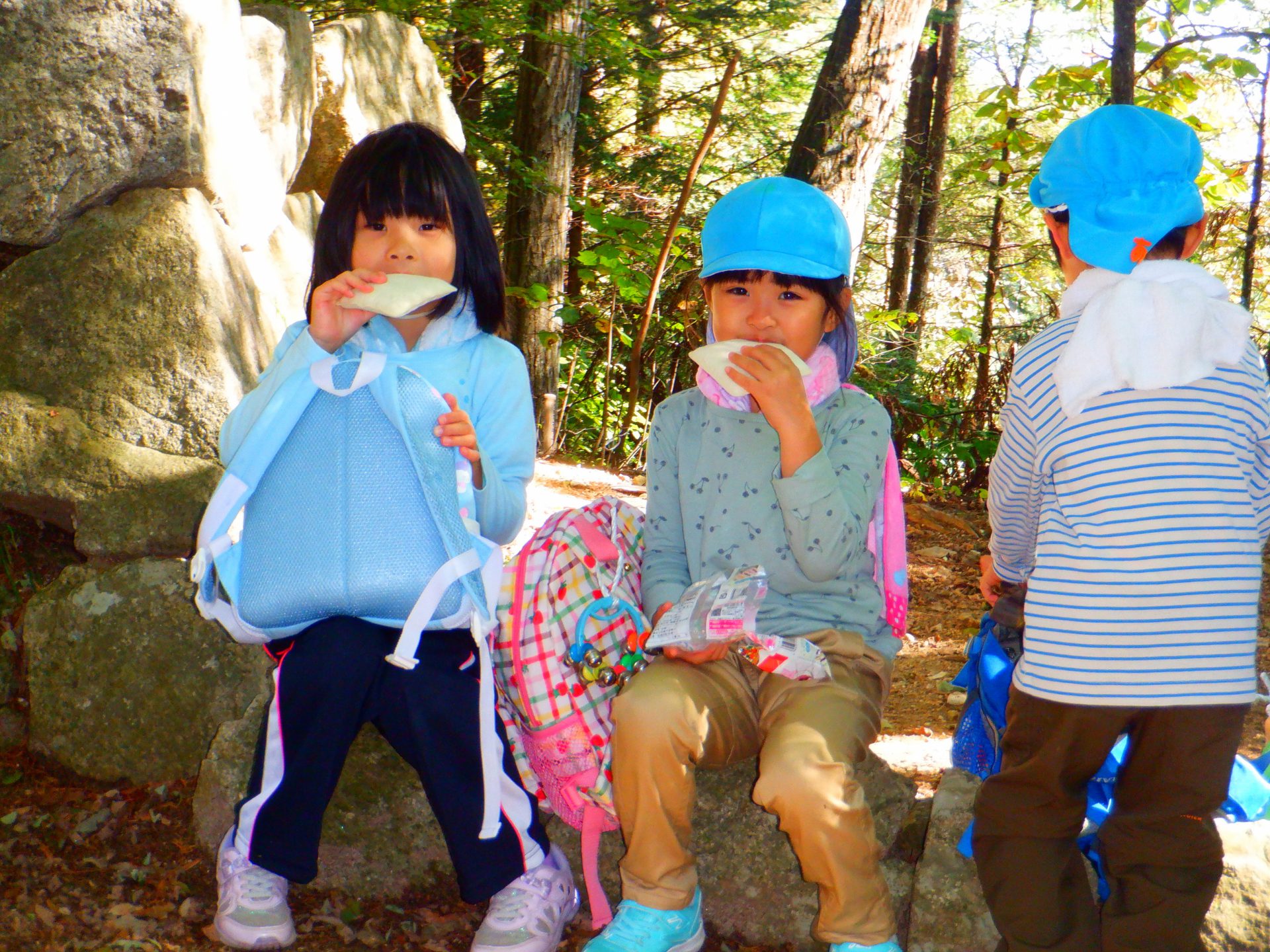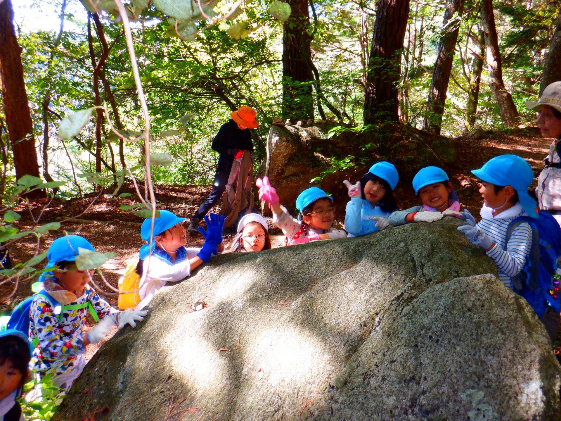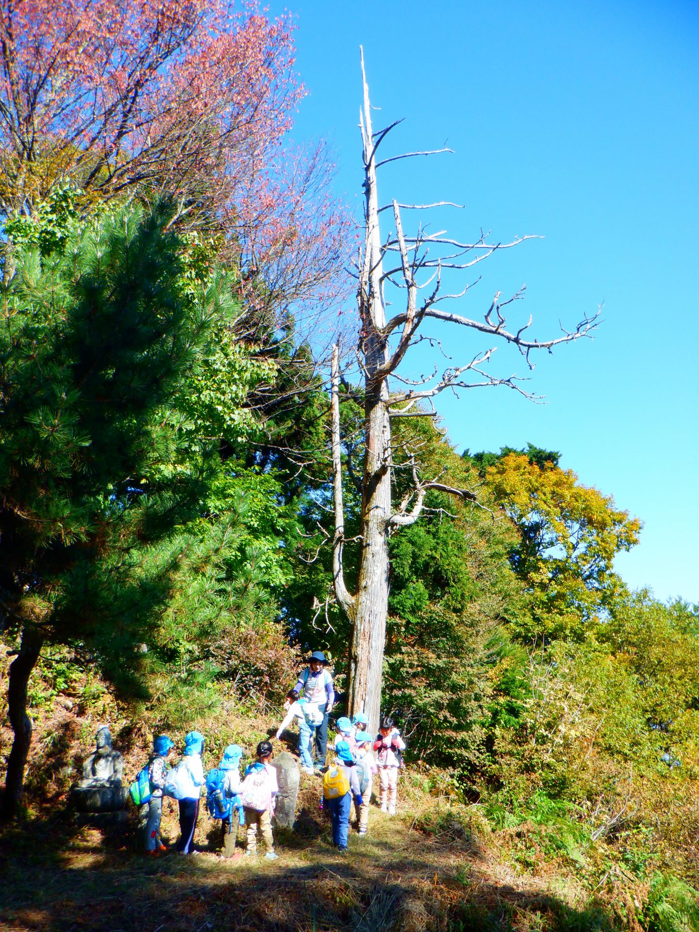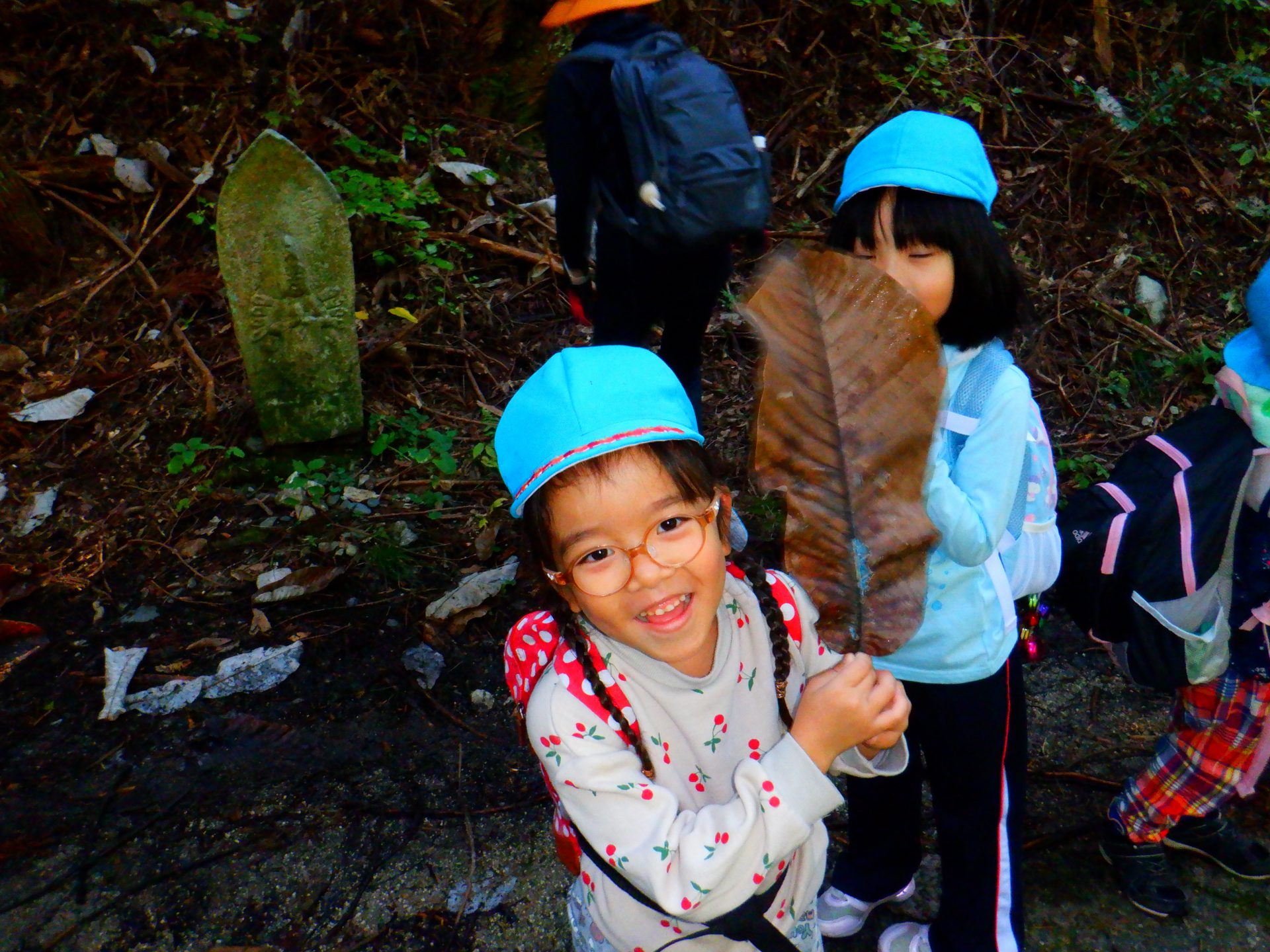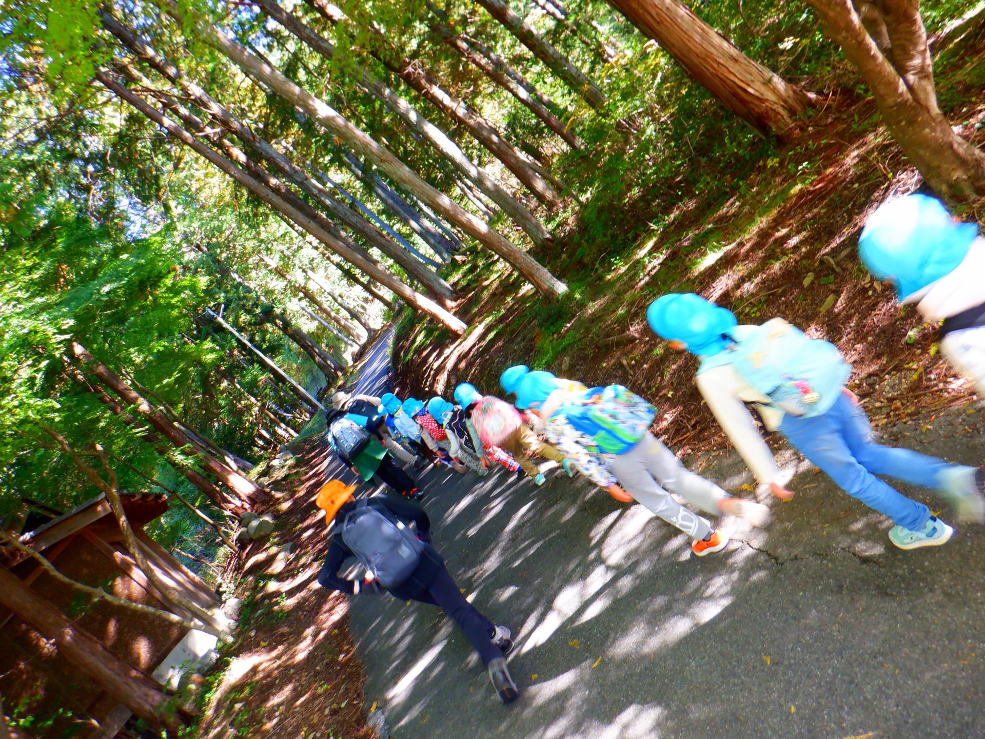 大人でもなかなか大変な登山。子どもたちは「どんぐりコロコロの替え歌」を歌うなど、どの子も楽しみながら、意欲的にどんどん歩いていく姿に感動した。