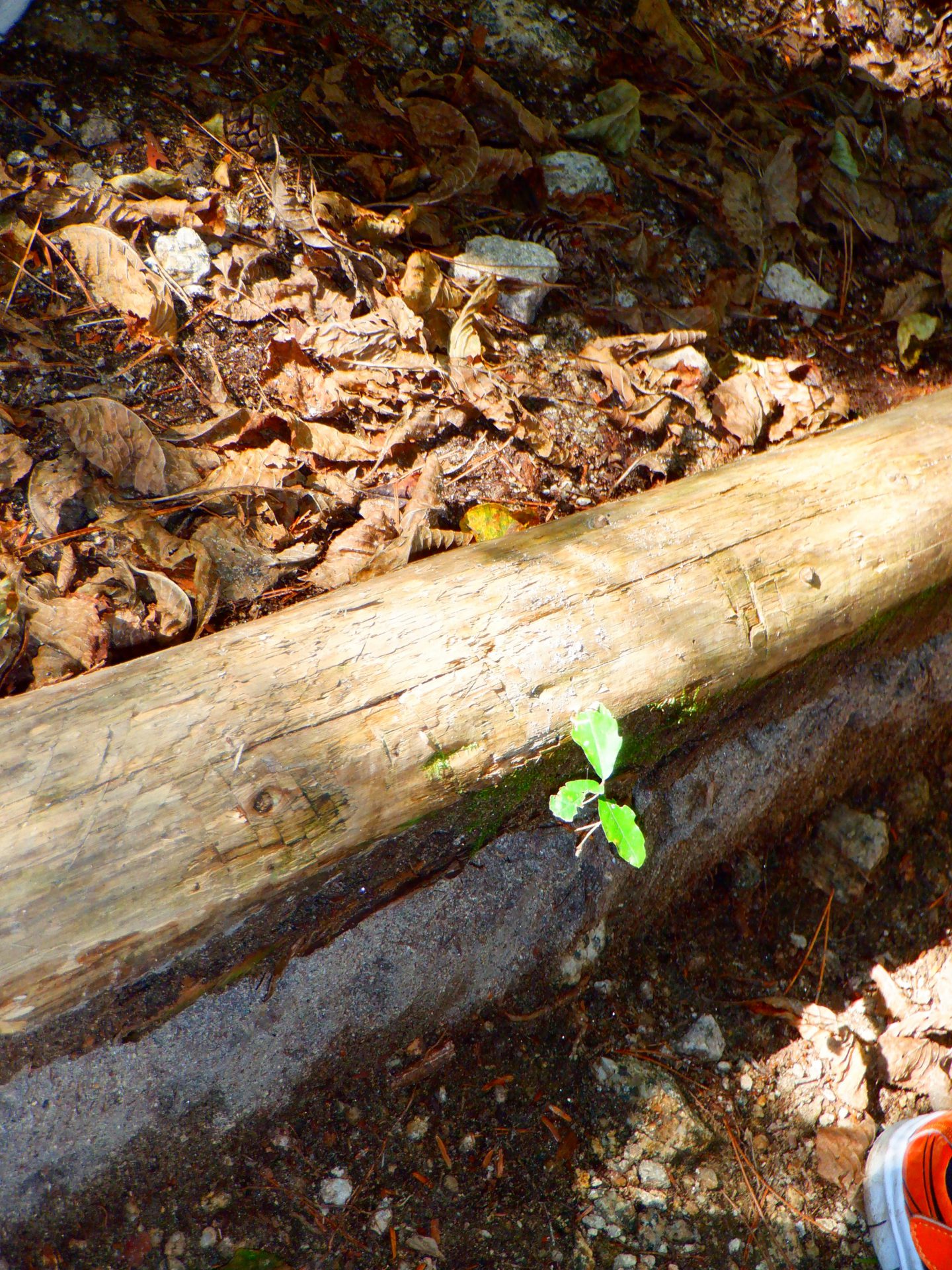 「どんぐりの芽なんだって。すごいね、踏まれないのかなー」