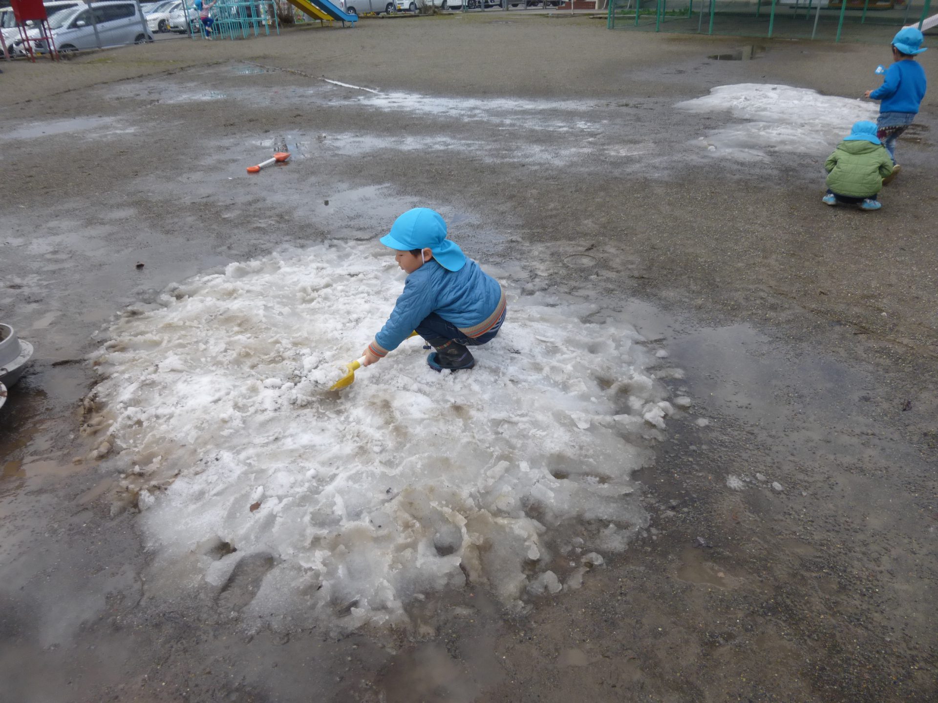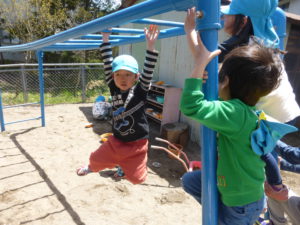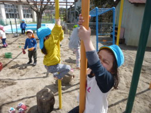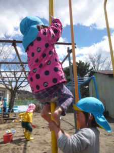 外では、まだ残る雪でままごとごっこを楽しみながらも登り棒にも興味を持ち始め、友だちと一緒に励ましあったり助け合ったりする姿が見られます。
