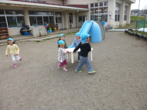 と話が進み小さいお友達でも使いやすいように並べてみました。更に、「テーブルも持ってこよう」と話が進み協力して運んでいました。