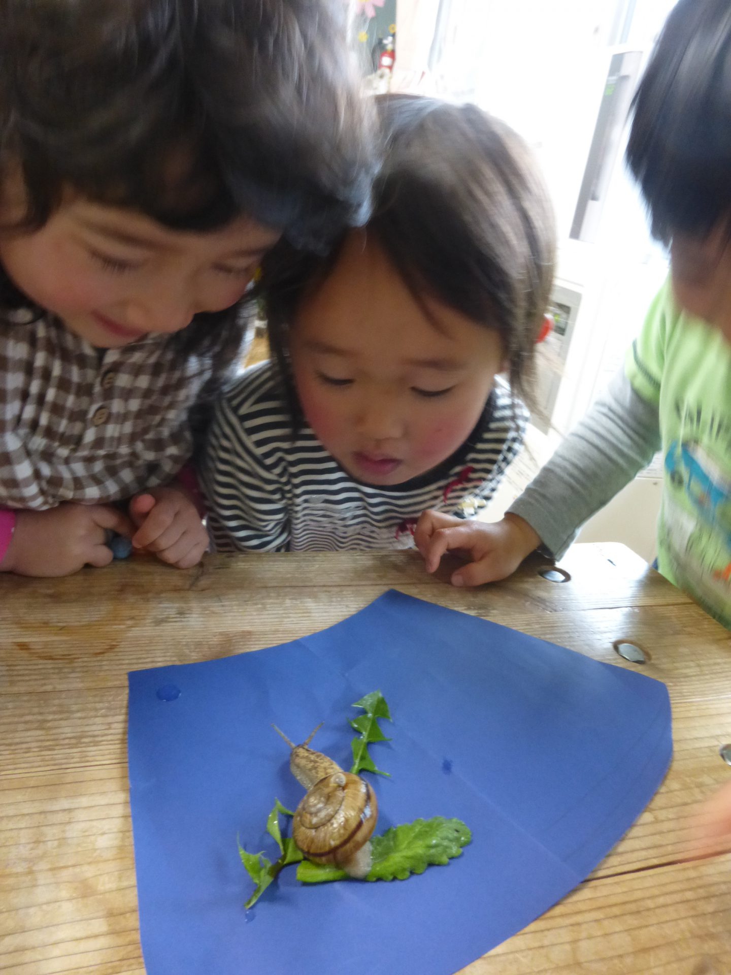 割れていた殻もかたつむりが顔を出したときには粘膜のようなもので覆われてました。それに気づいたのも子ども達。改めて、子ども達の観察力に驚かされました。