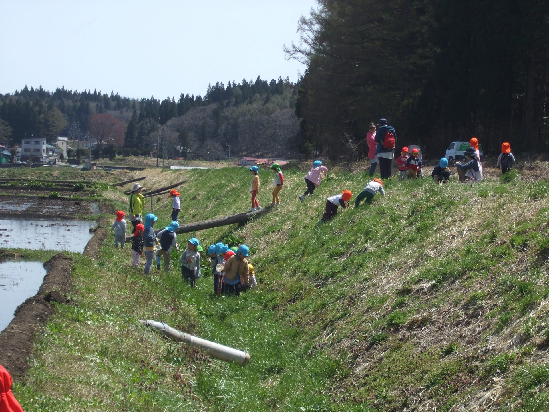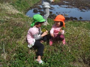 この日は、みんなで農道に行ってきました。春の農道には子ども達にとって魅力的なものがたくさんあります。