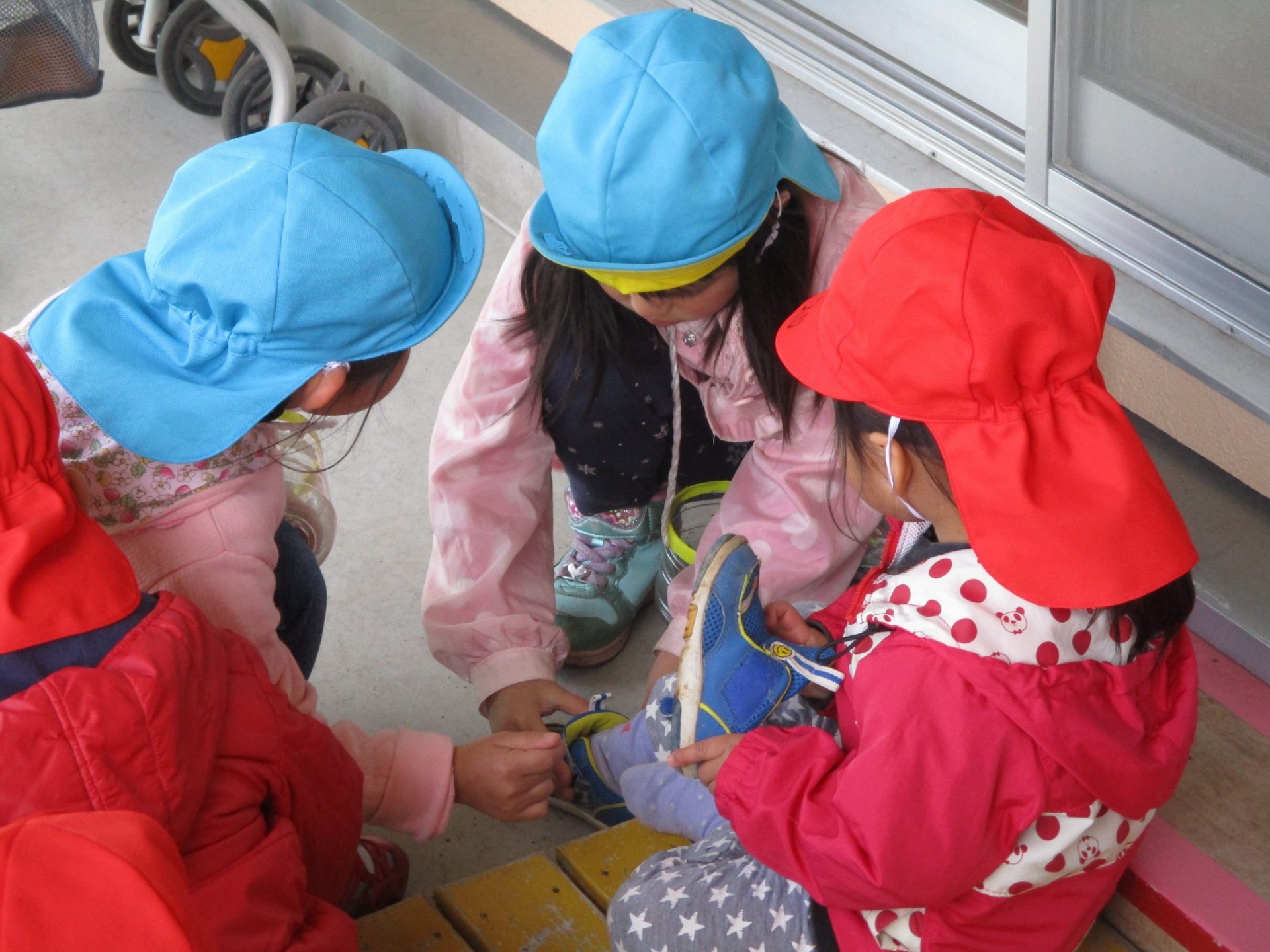 小さいお友達が靴を渡すと、「靴履くんだよね?」と言って小さいお友達が履きやすいように靴を置いてくれたり、「(マジックテープを)ビリってやると履きやすいよ。」と教えてくれたりしていました。
