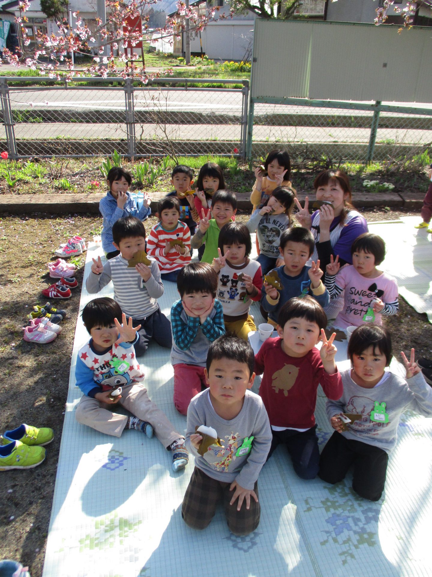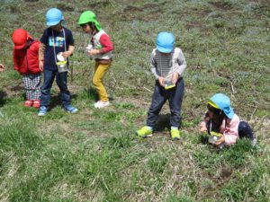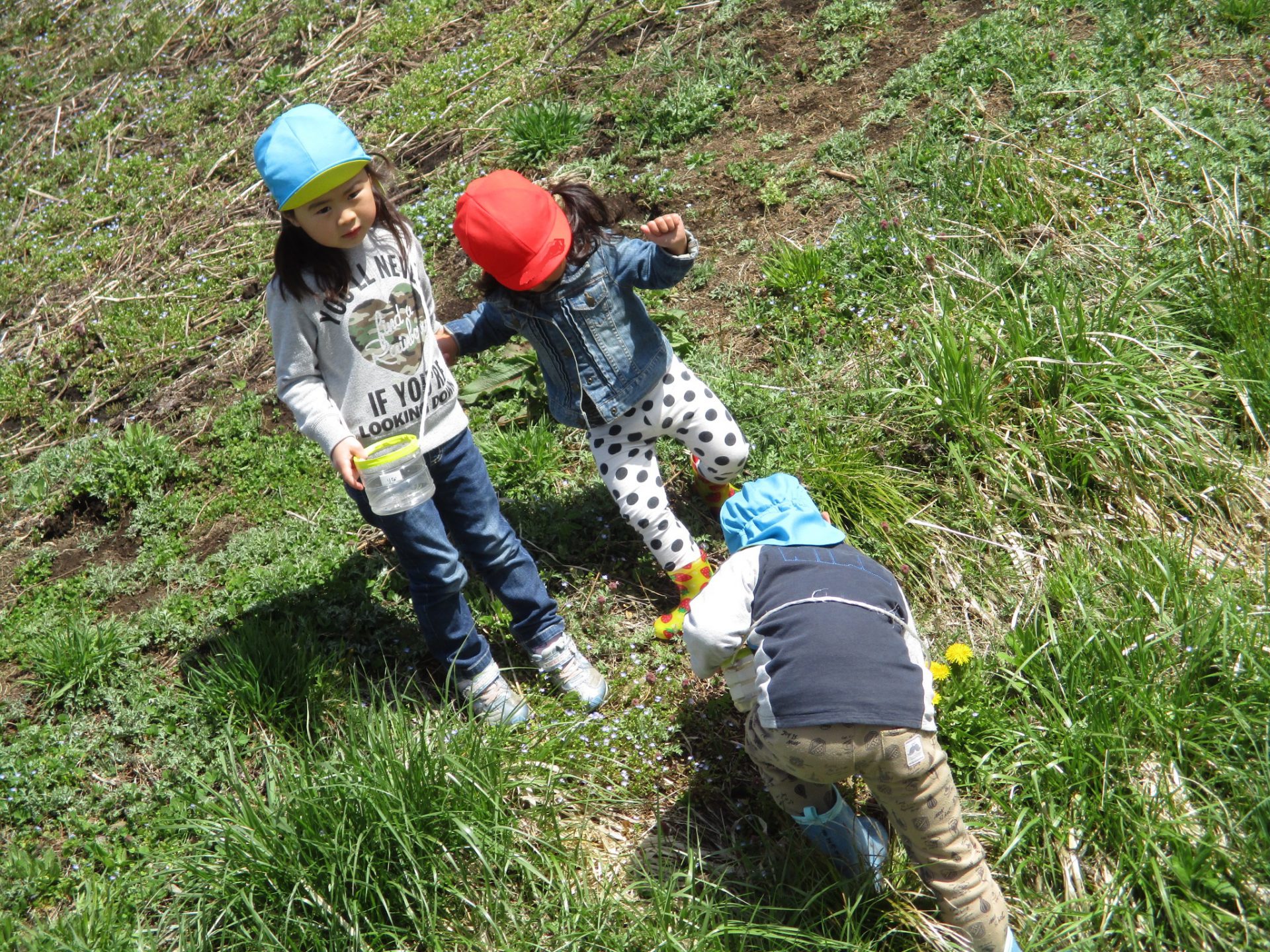暖かいの日差しが続き、保育園の周りには春の草花や生き物達が見られるようになってきました。戸外に行くと「あ!ちょうちょだ!」「カエルだ!」「たんぽぽだ!」と子ども達の興味は尽きません。季節の変化に目を向けたり、気づいたりしていくことが出きるよう自然に触れる活動を多くし、季節感のある遊びを取り入れていきたいなと思います。また、年上の子は年下の子へのいたわりや思いやりの気持ちを感じたり、年上の子の活動をモデルとして憧れを持ったりなど、お互いに育ち合えるように異年齢の活動を大切にしていきたいと思います。