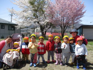 土のでこぼこ道、コンクリートの固い道、いろんな道を歩いて旧小学校までたどり着くと、桜がとても綺麗に咲いていて「きれー!」「おーき!(おおきい)」と子ども達から歓声があがります。