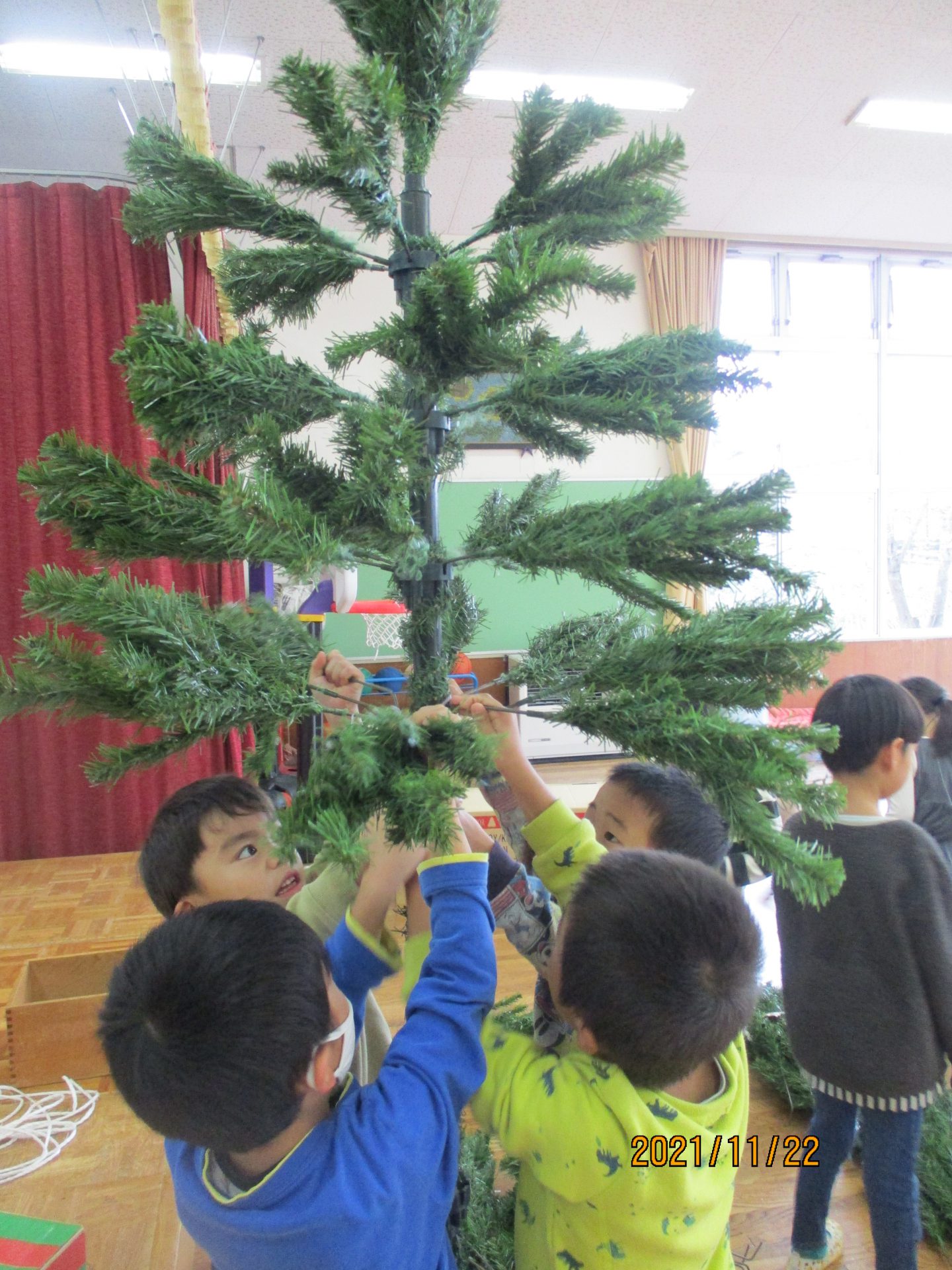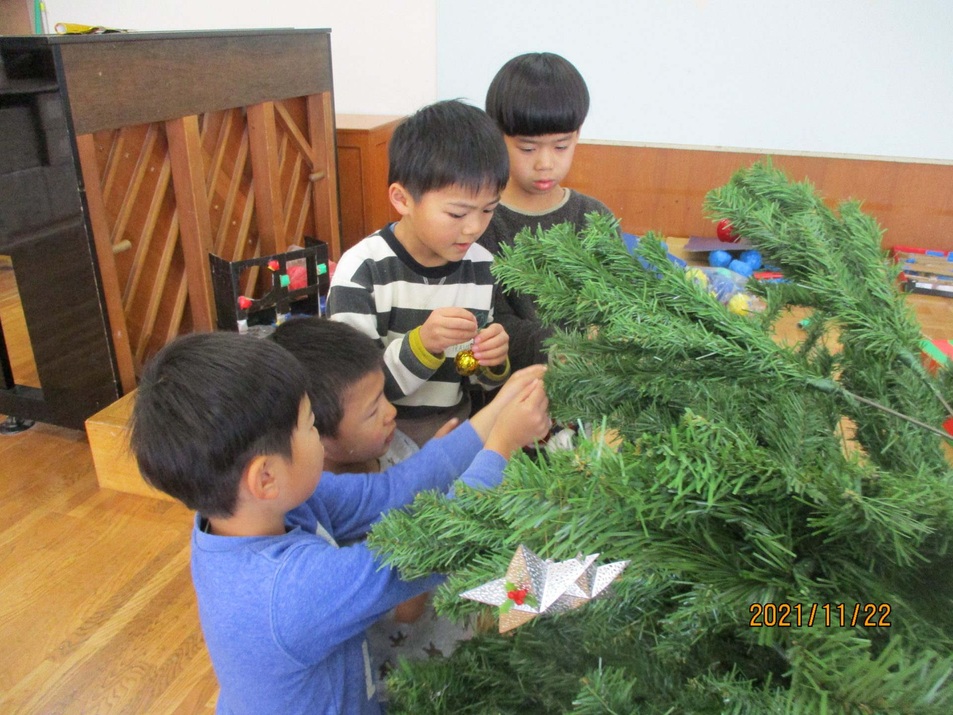 ツリーを飾ったり、クリスマス会でみんなが座るいすにつける飾りを手作りしたり・・・