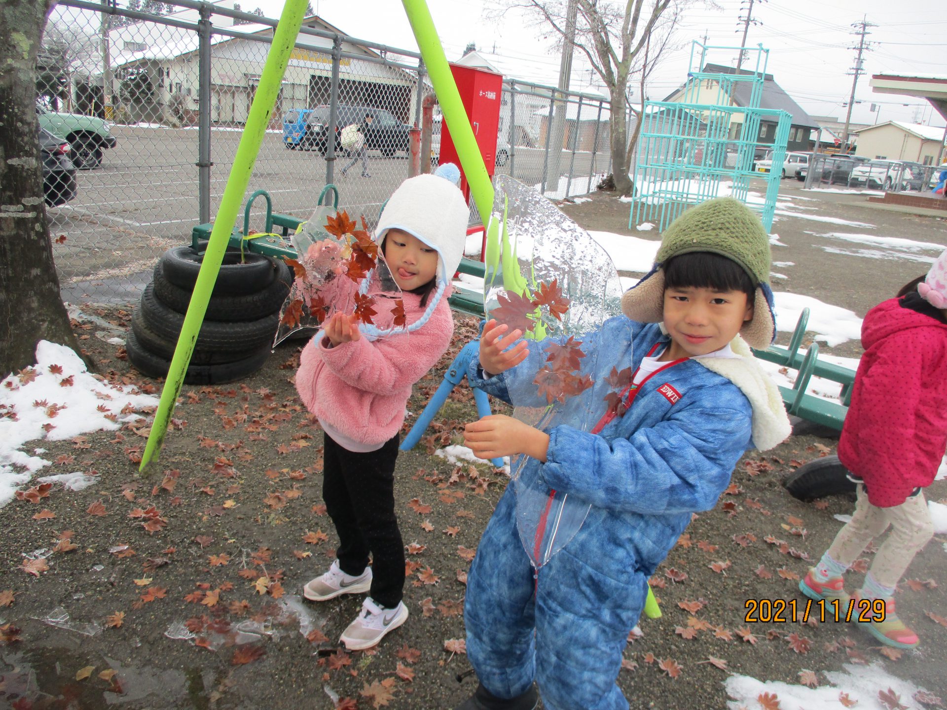 自然と触れ合いながら、冬の訪れを感じていました。これから、本格的な雪の季節。ワクワクしながら楽しみにしている子ども達です。年長さんにとって保育園最後の冬、どんな遊びが広がるでしょうか。