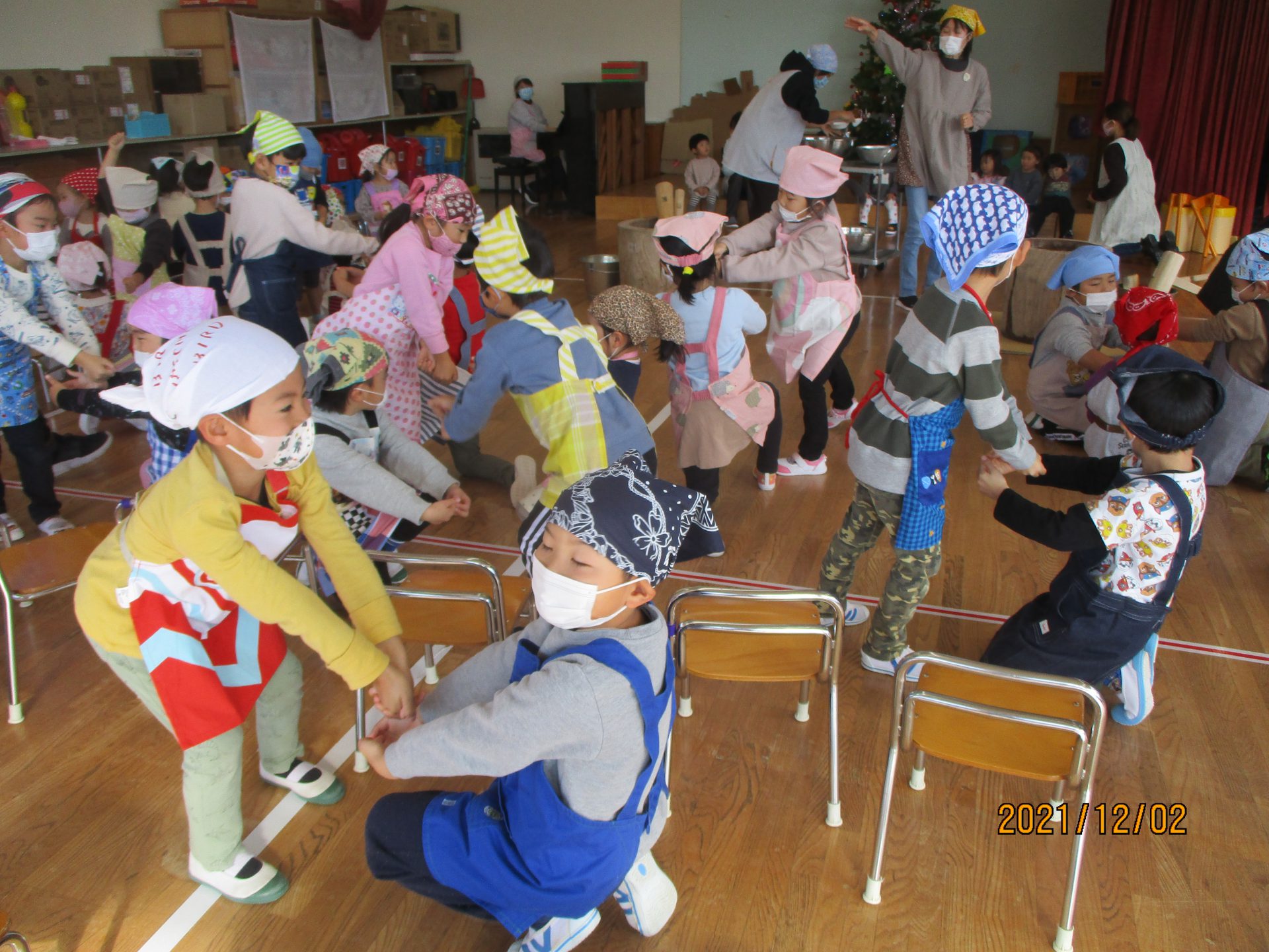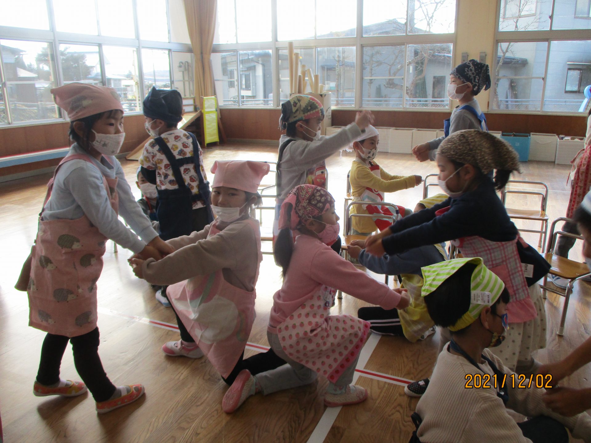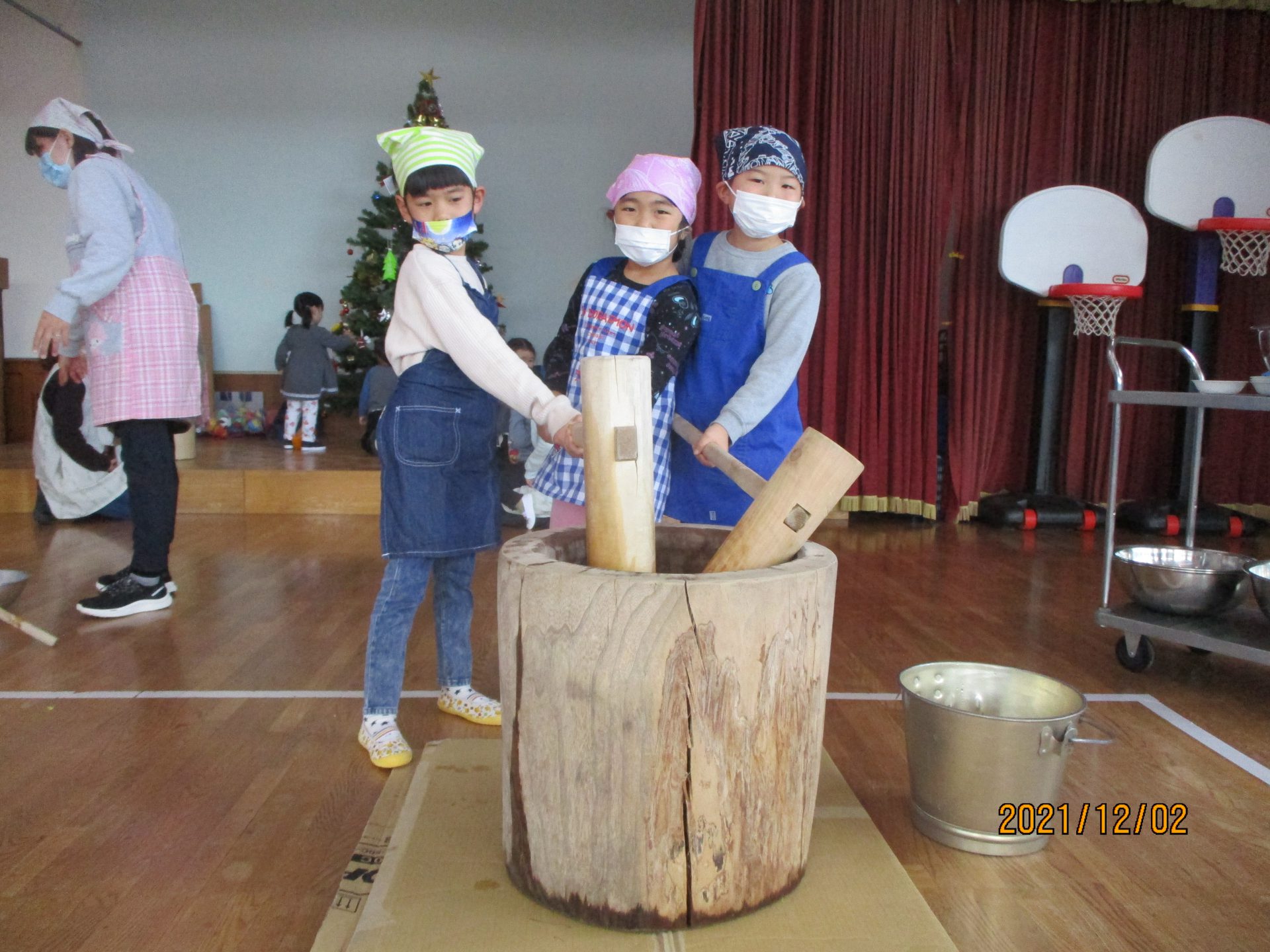 まずは昨年はコロナウイルスで中止になってしまった餅つき会。「今年はできるかなぁ?」と楽しみに歌を歌ったり、餅つきごっこをしたり、「何味のお餅が好き?」と話題に上ったり・・・楽しみにしていました。