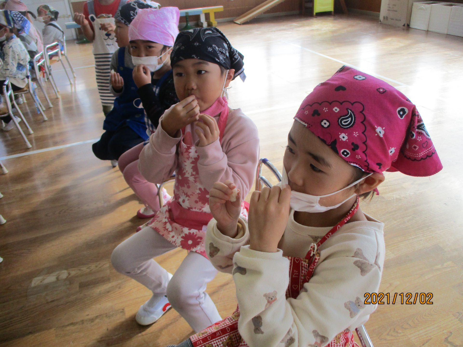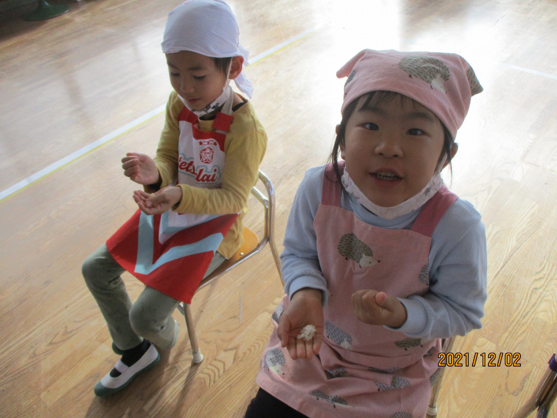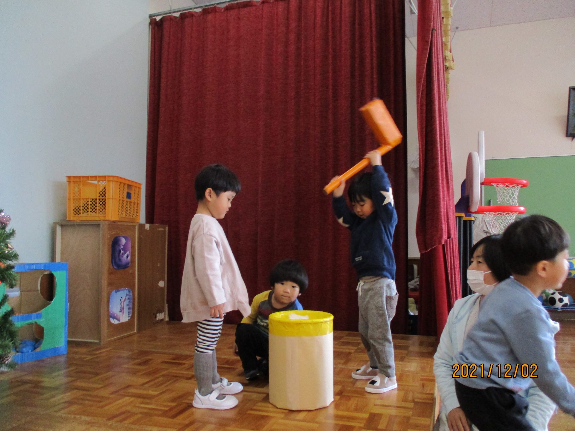 まずは昨年はコロナウイルスで中止になってしまった餅つき会。「今年はできるかなぁ?」と楽しみに歌を歌ったり、餅つきごっこをしたり、「何味のお餅が好き?」と話題に上ったり・・・楽しみにしていました。