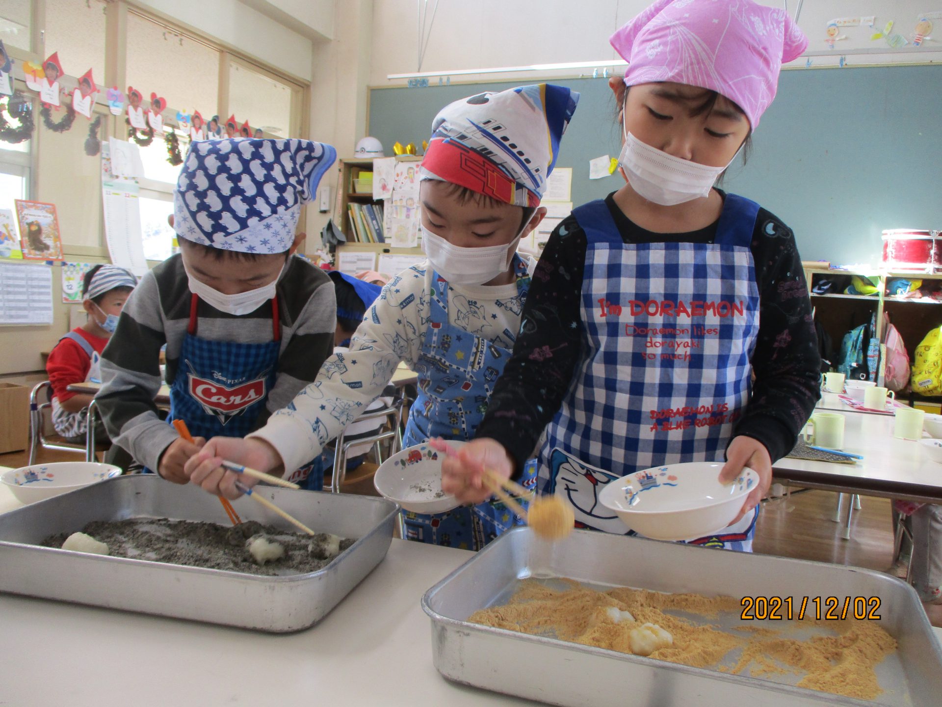 つき上がると、部屋で味付けです。きなことごまは子どもたちが自分のお箸で転がしながら味をつけました。「たくさんつけておいしくしたいの!」と器用に転がしています。