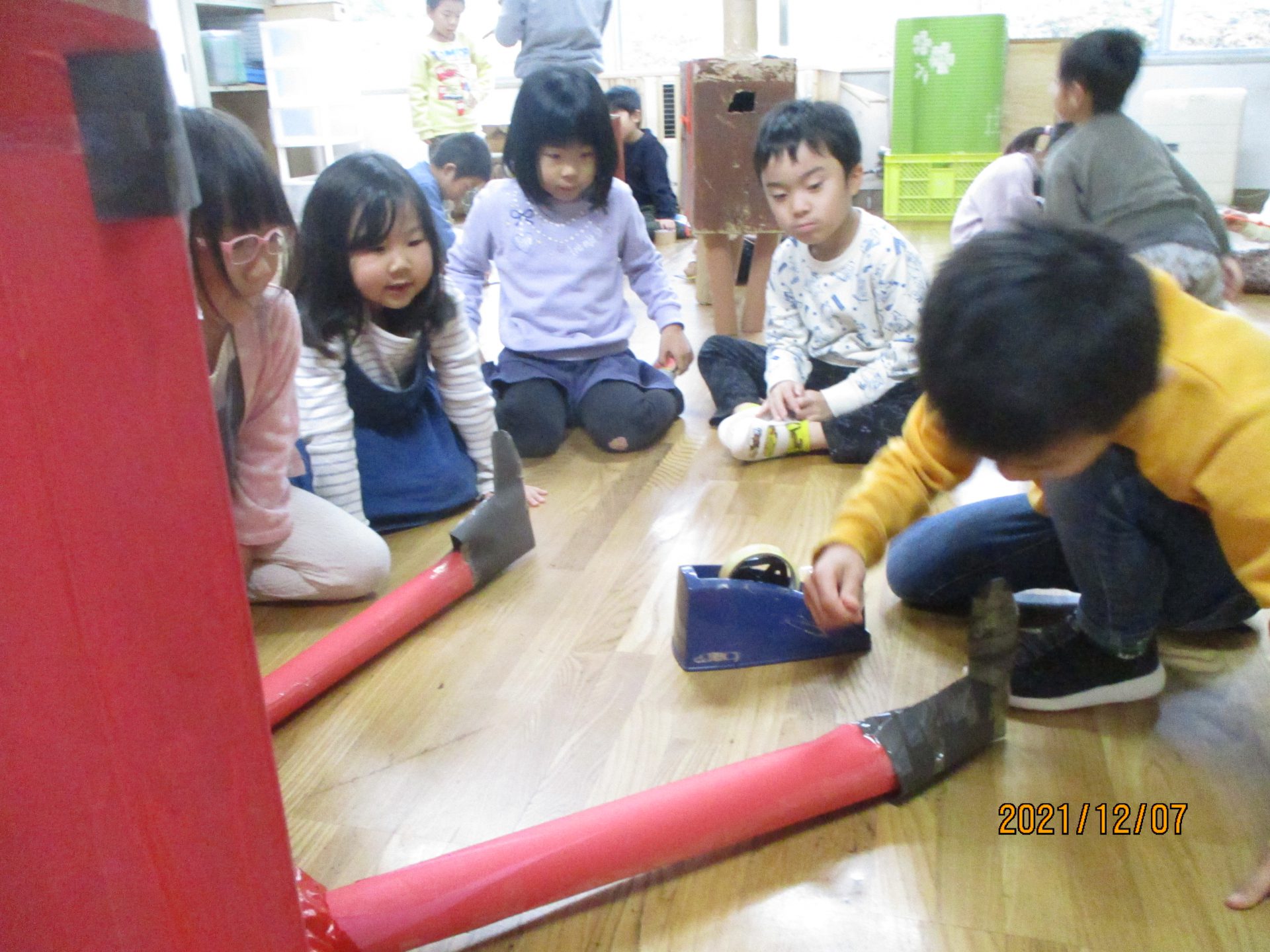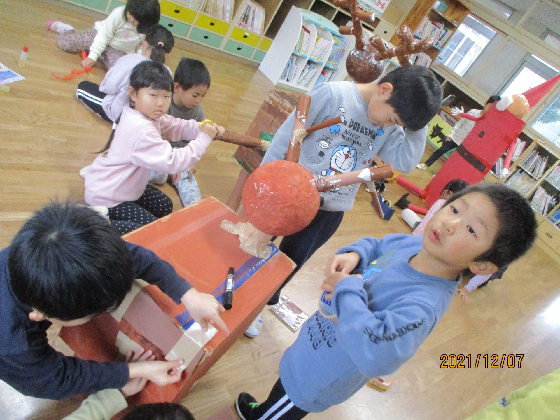 「飾り付けをしたい」「プレゼントをあげたい」「大きいサンタさんとトナカイを作ってビックリさせたい」いろいろな意見がでます。だんだんと意見を伝え合えるようになってきた年長さん。「それ、いいね!」「でも、こうしたほうがいいんじゃない?」「じゃぁ、みんなでチームに分かれて作ったら?」「材料はどうする?」子どもたちの話し合う姿に成長を感じます。