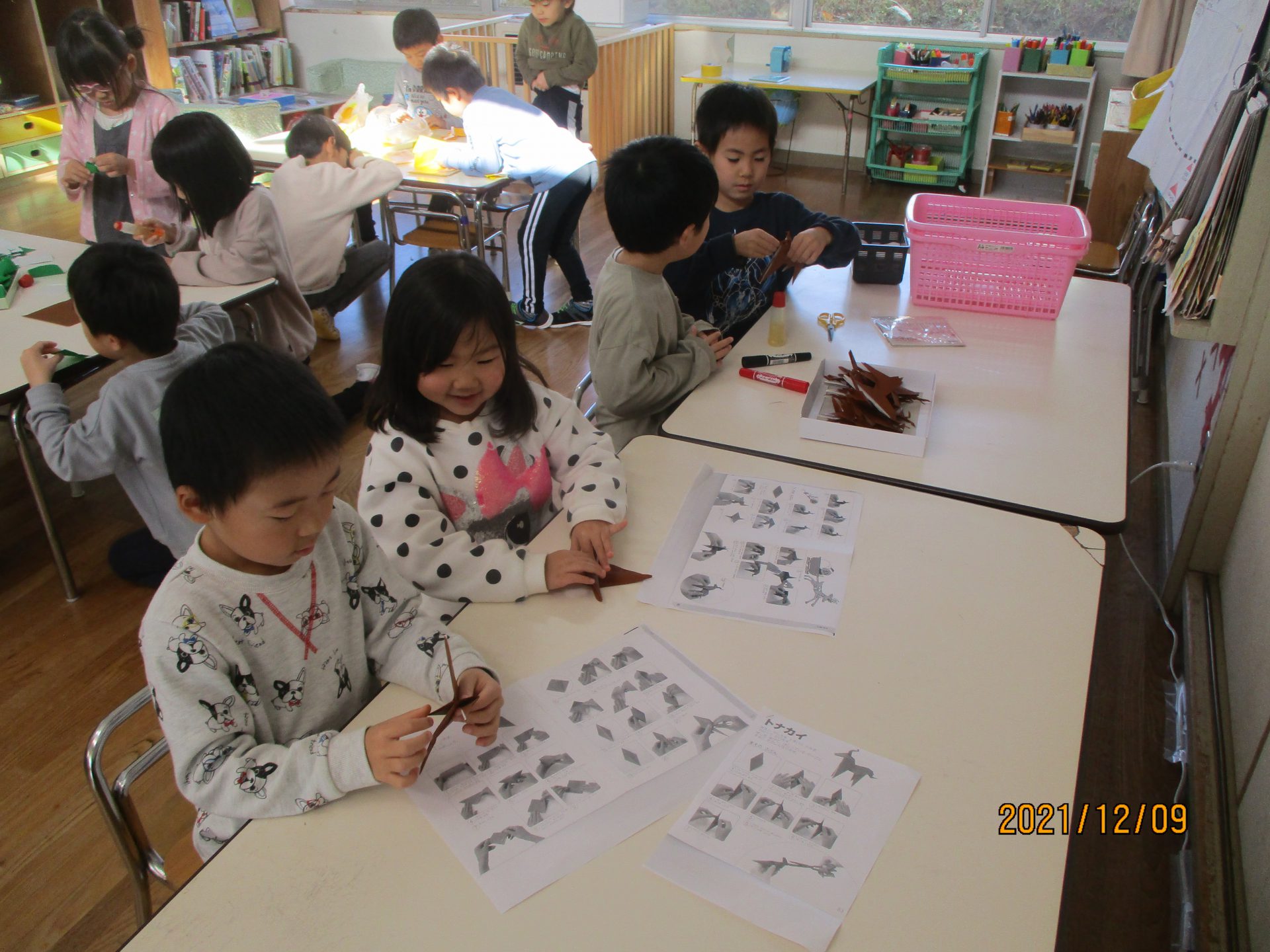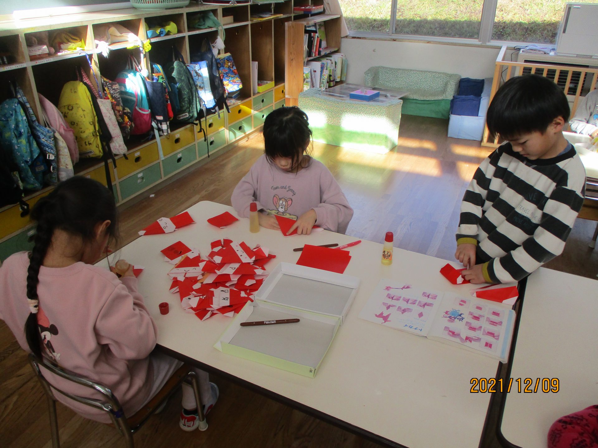 そして、プレゼント作り。「年中さんは何人だっけ?」と各クラスの人数を紙に書いて人数分用意しようと頑張ります。「もらえない子がいたらかわいそうだよ」優しい思いやりの心がそだっています。4チームに分かれて得意の折り紙を折ってプレゼントにしました。サンタとトナカイ、ツリー、ベル。折り方も一生懸命に調べます。