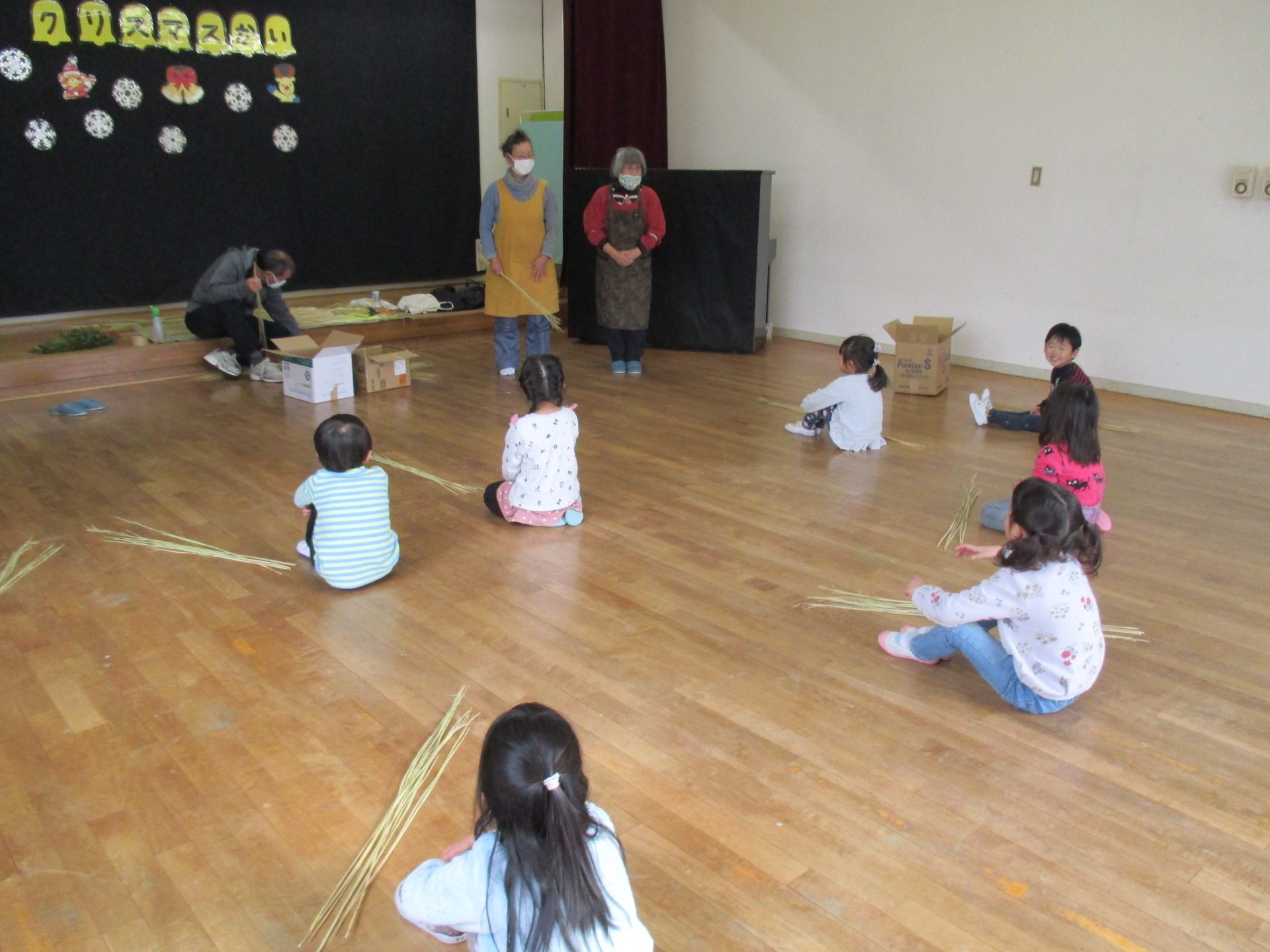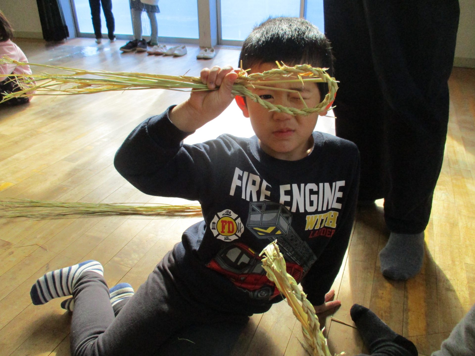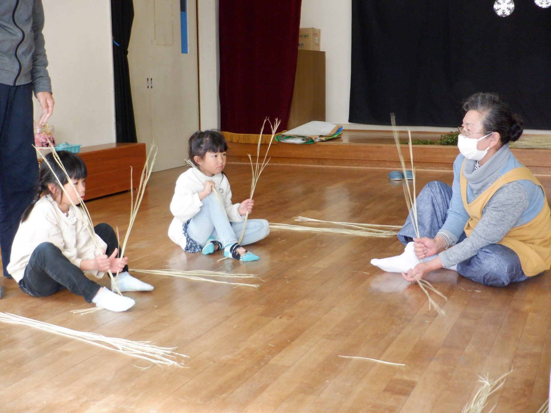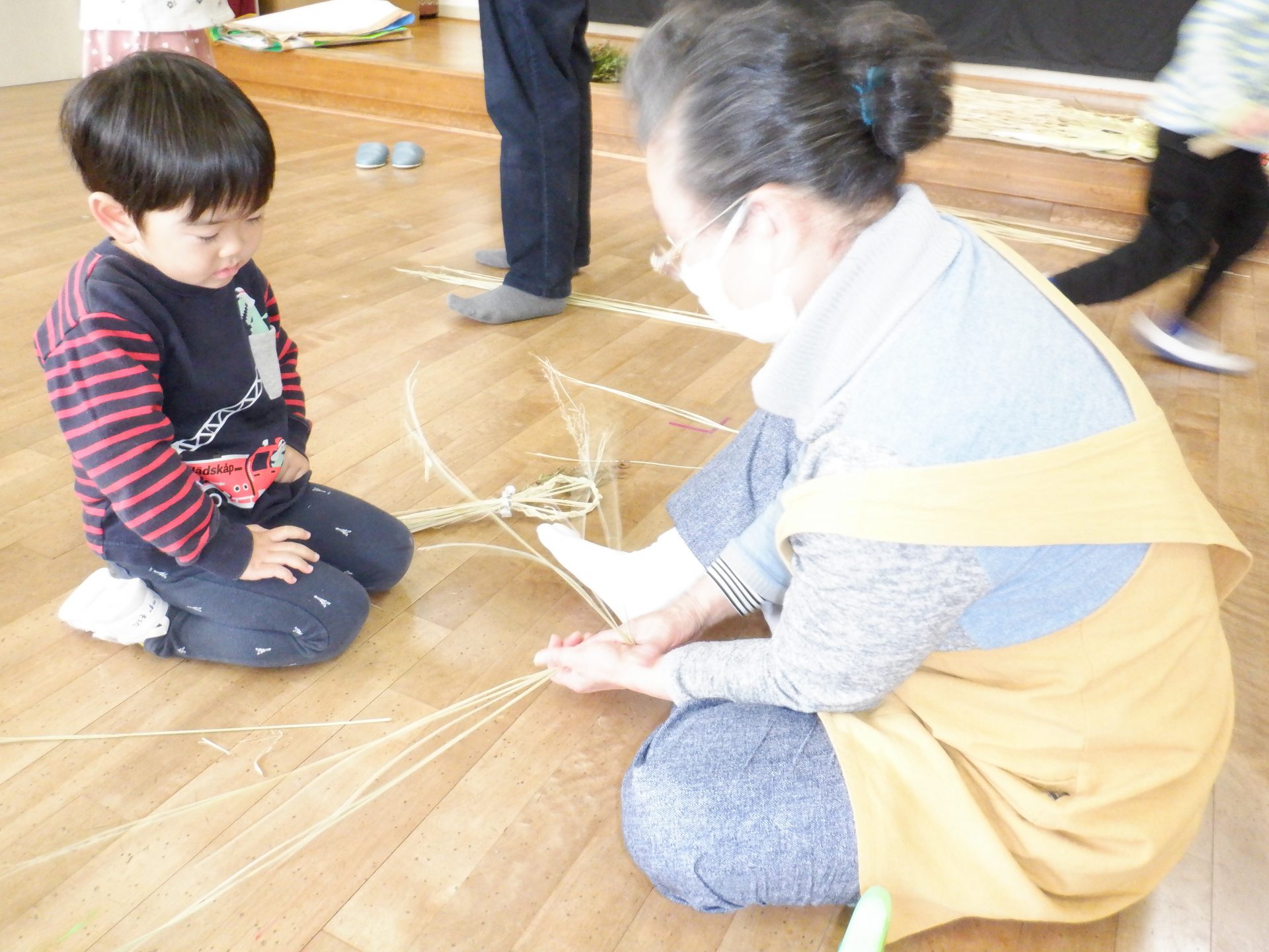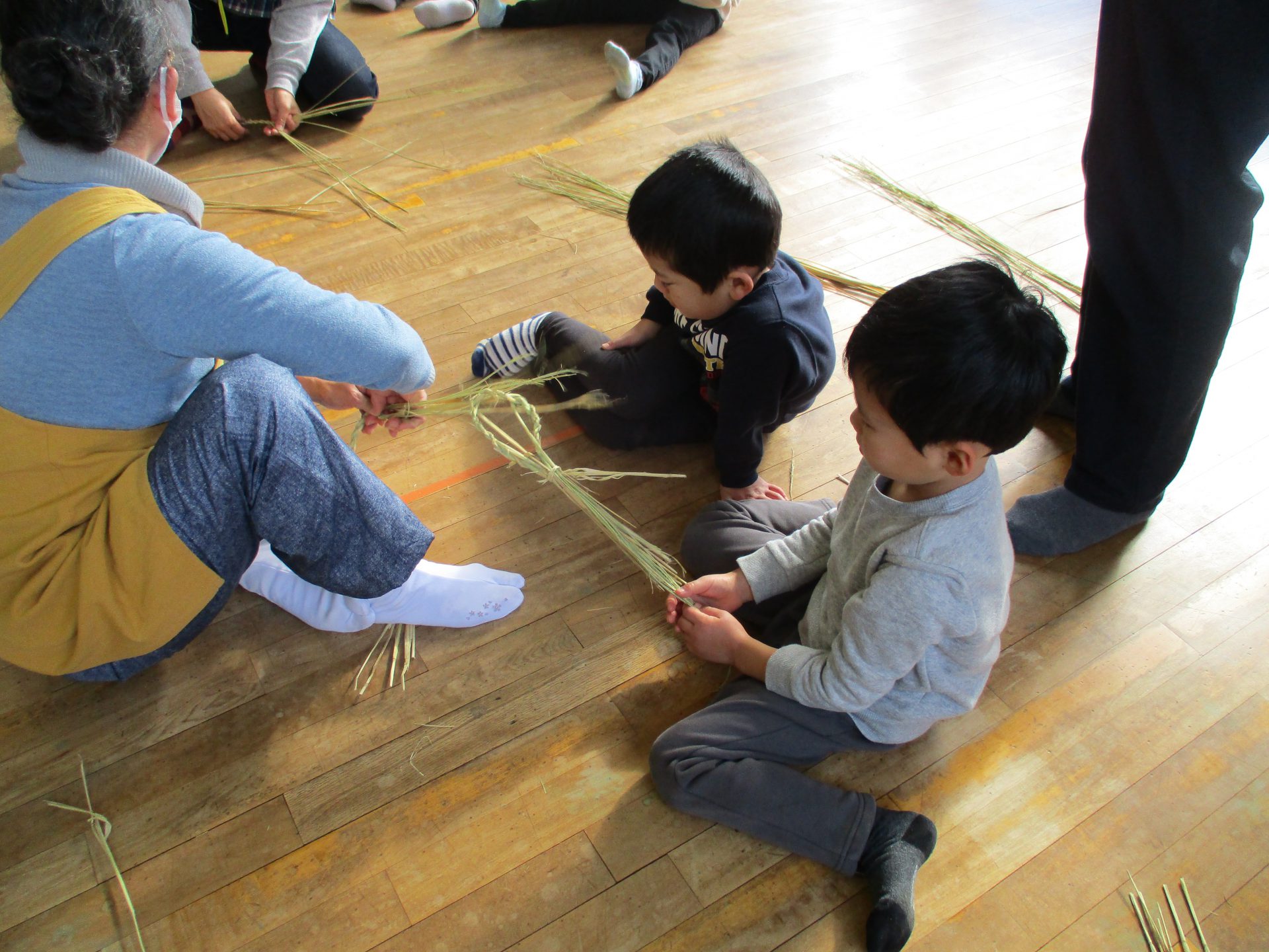 しめ縄用のまっすぐできれいなわらを持ってきて、子ども達や私たち職員に丁寧に作り方を教えてくださいます。