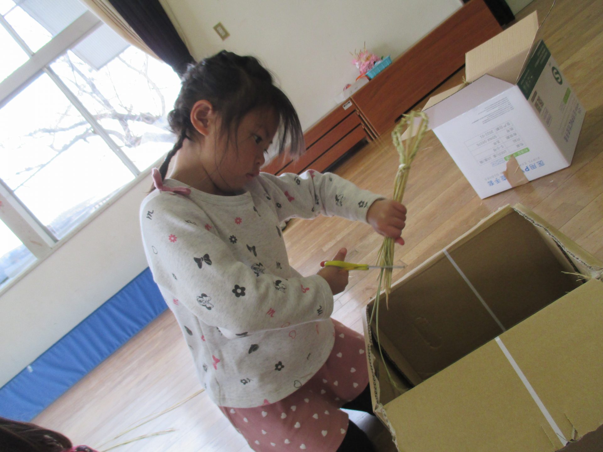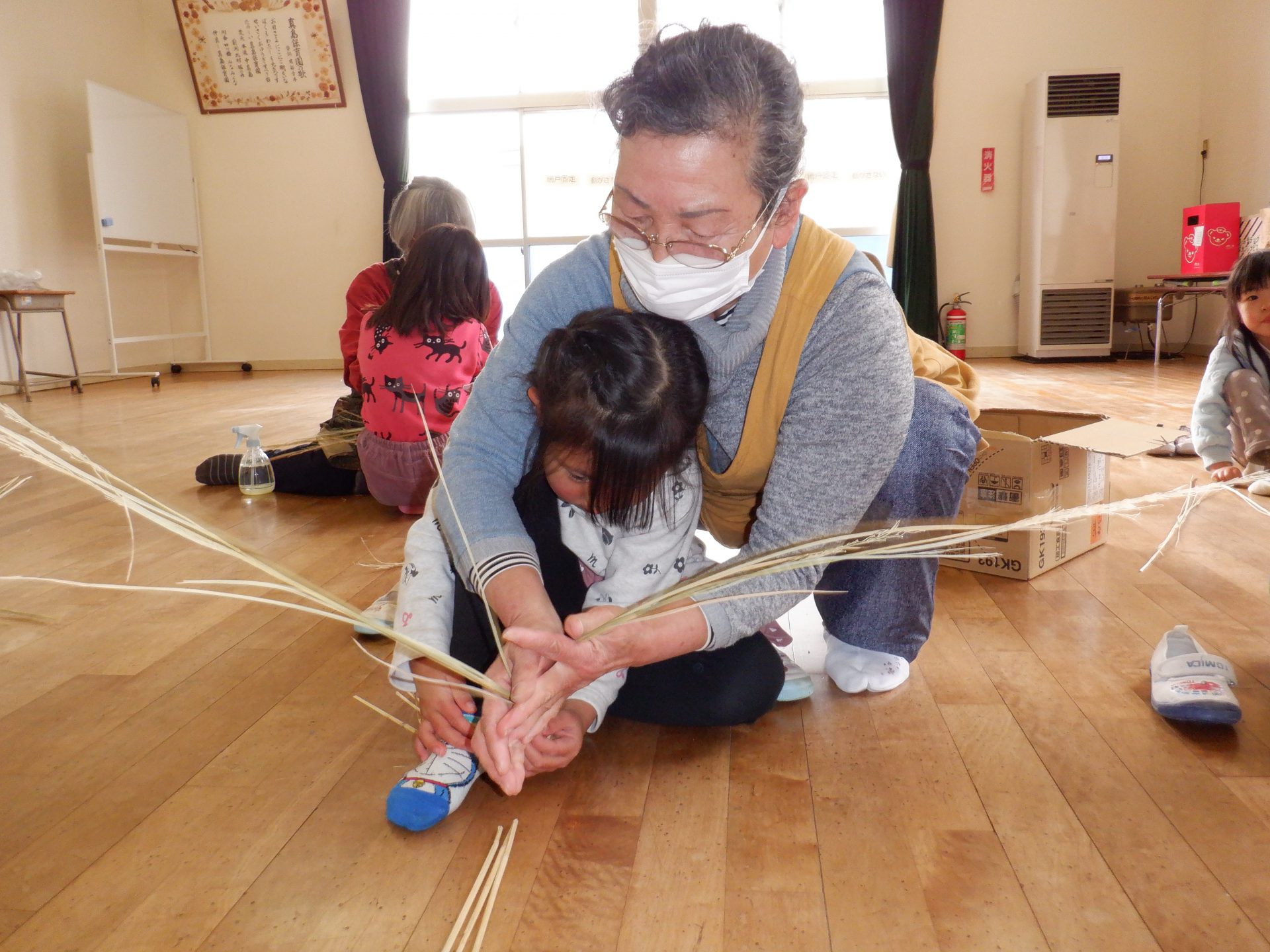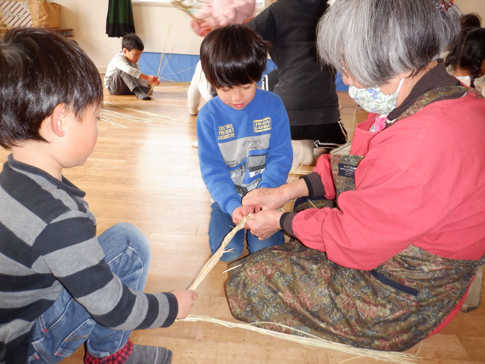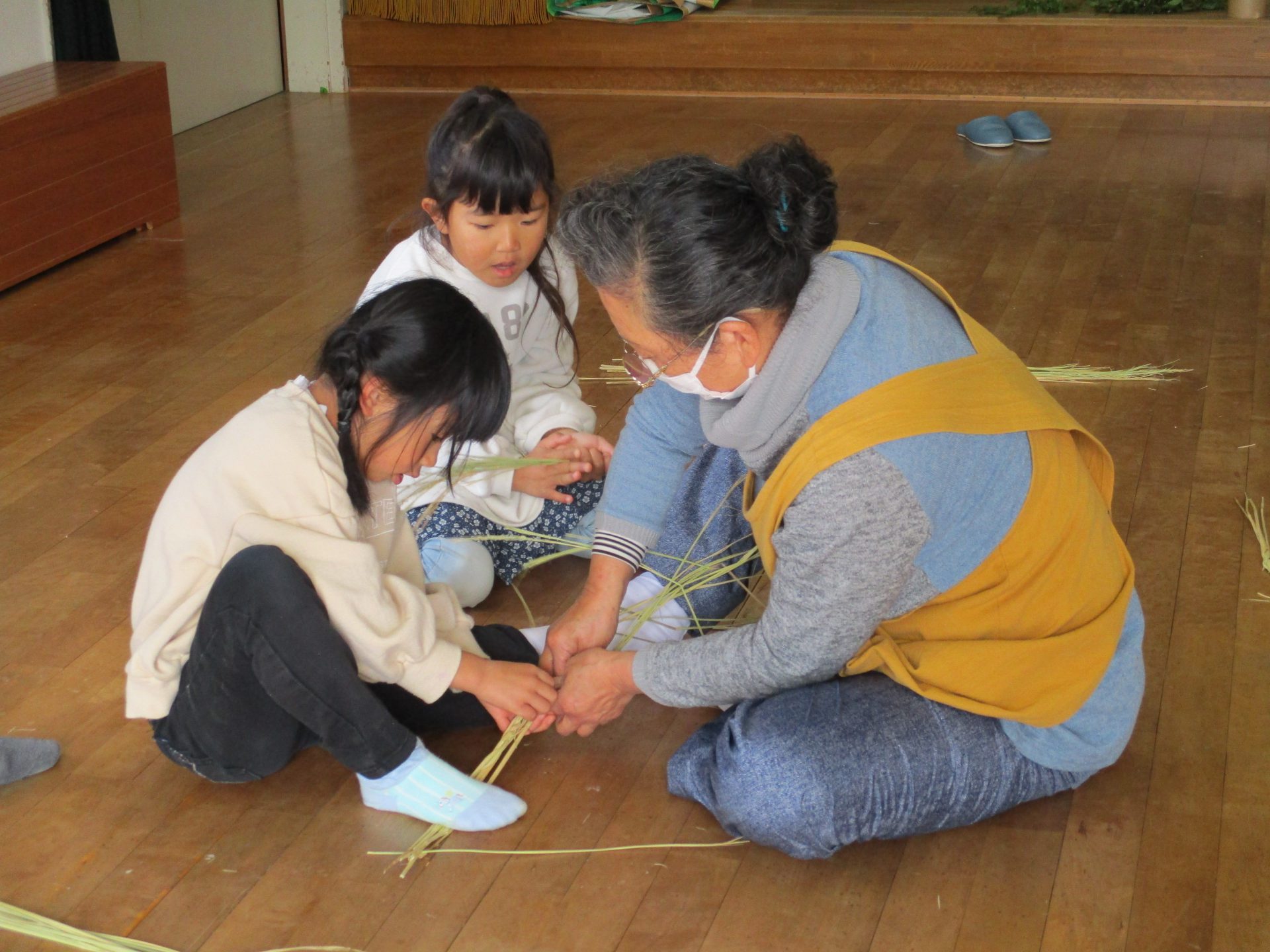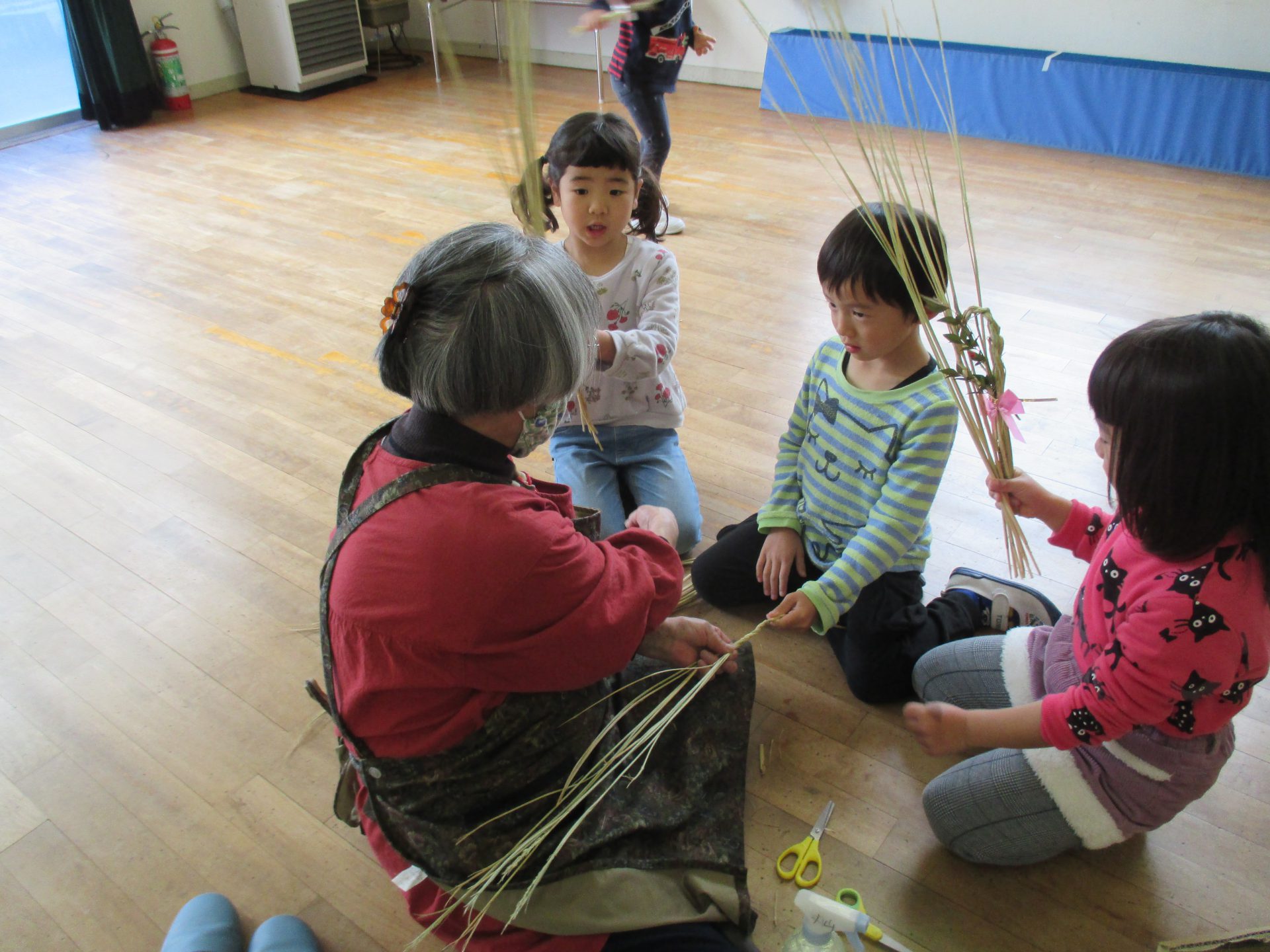 しめ縄用のまっすぐできれいなわらを持ってきて、子ども達や私たち職員に丁寧に作り方を教えてくださいます。