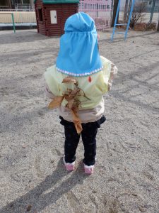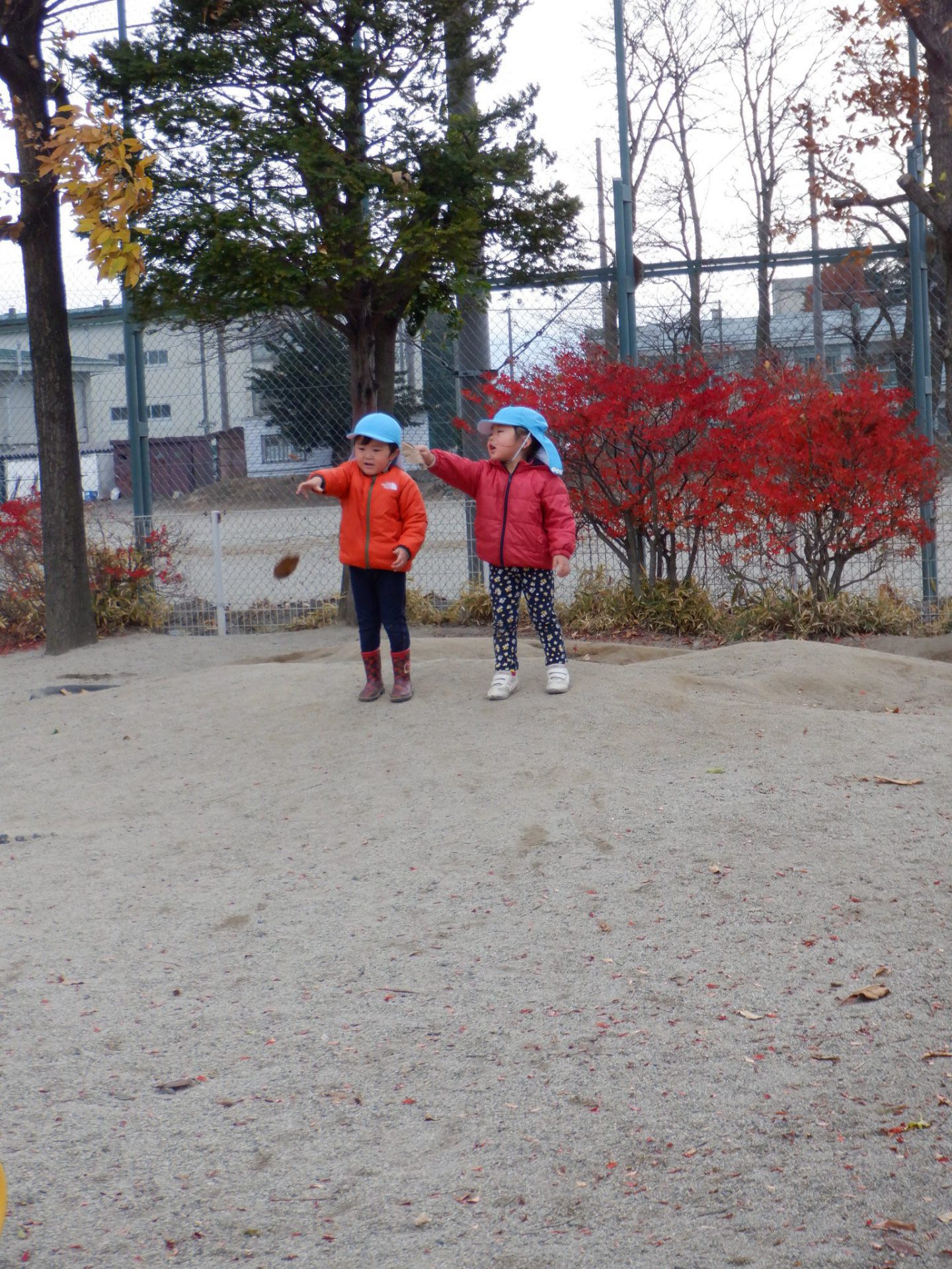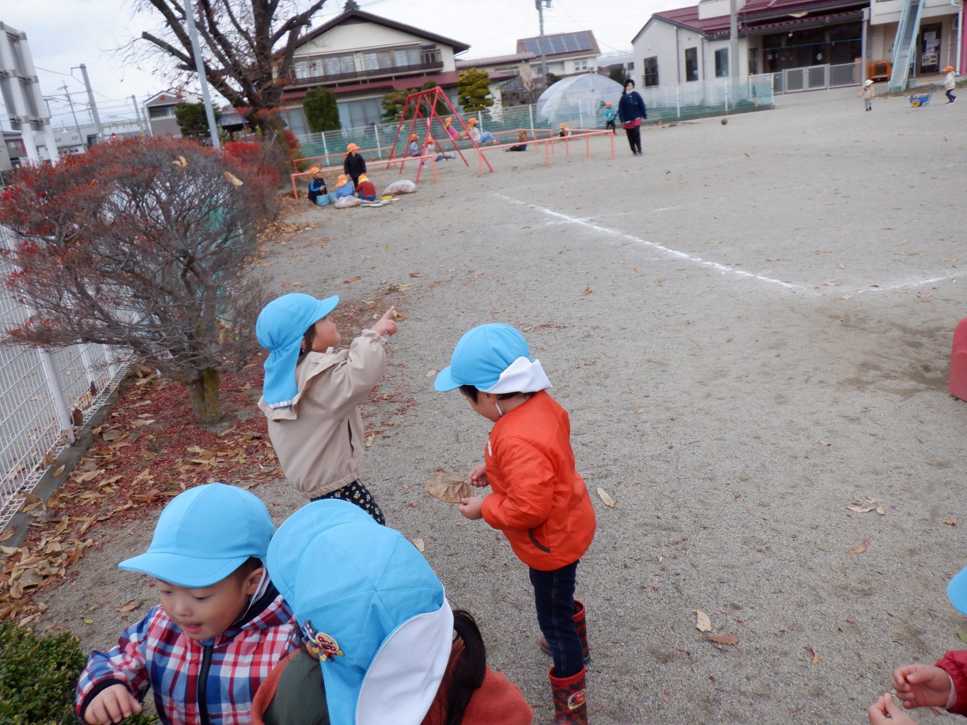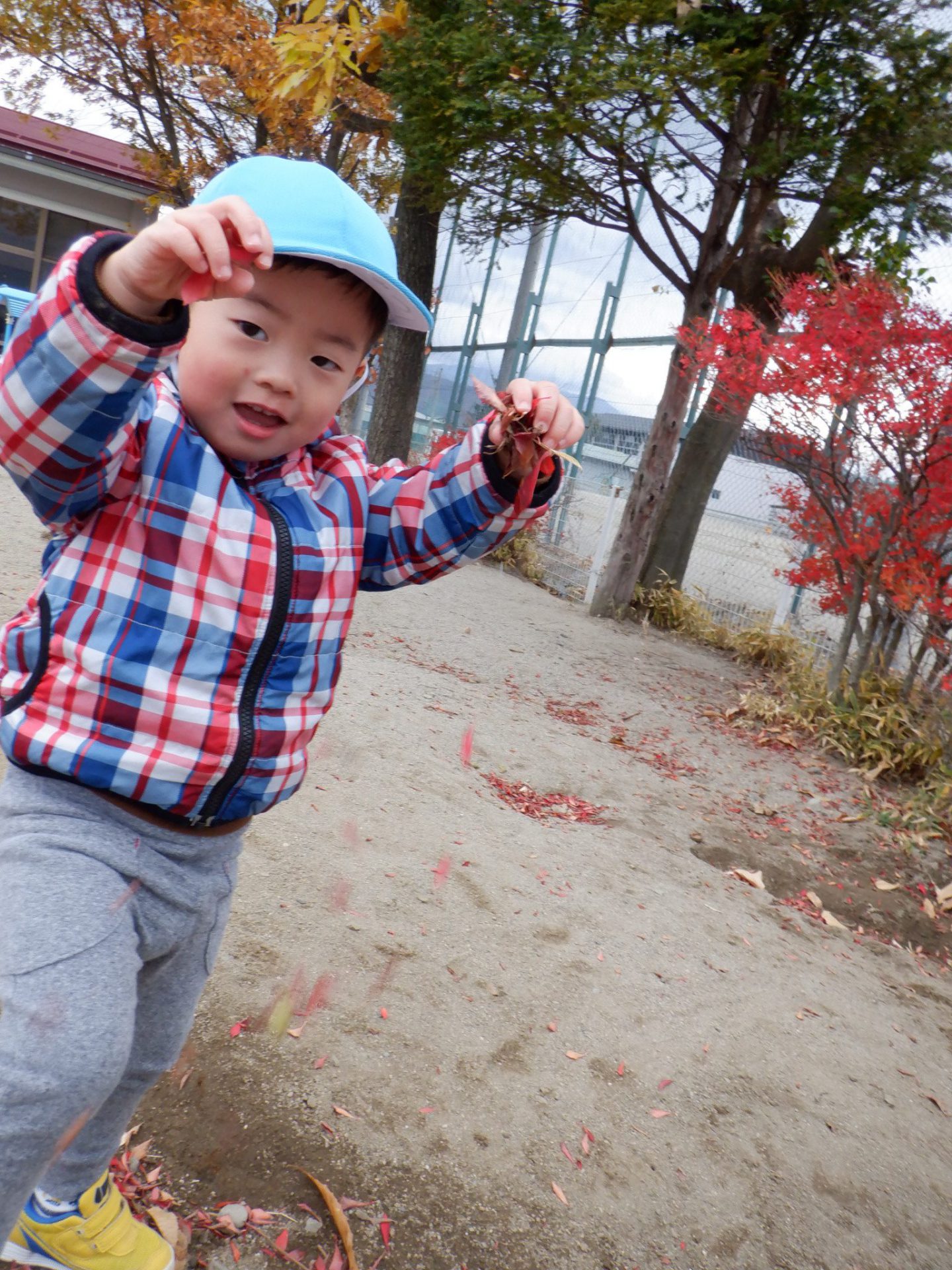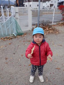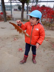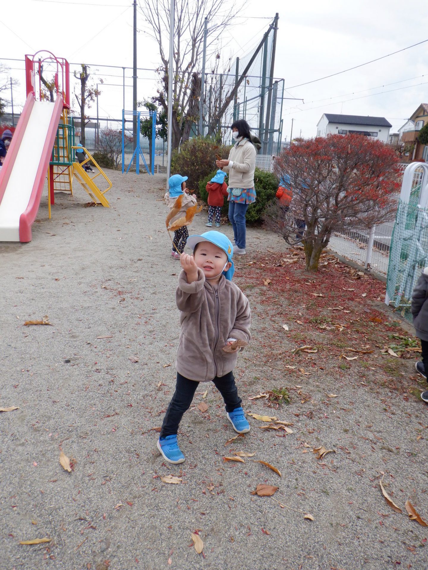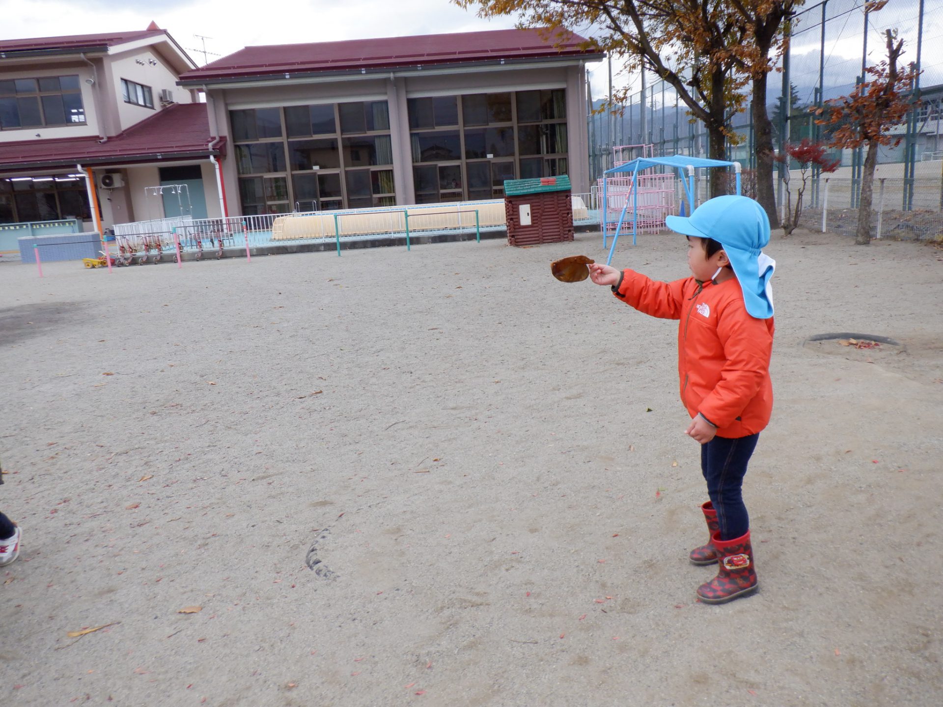 どんなふうにどこまで飛んでいくのか、友だちとどちらが遠くまで落ち葉を飛ばせるのか、風に舞う葉っぱの様子を楽しんでいました。