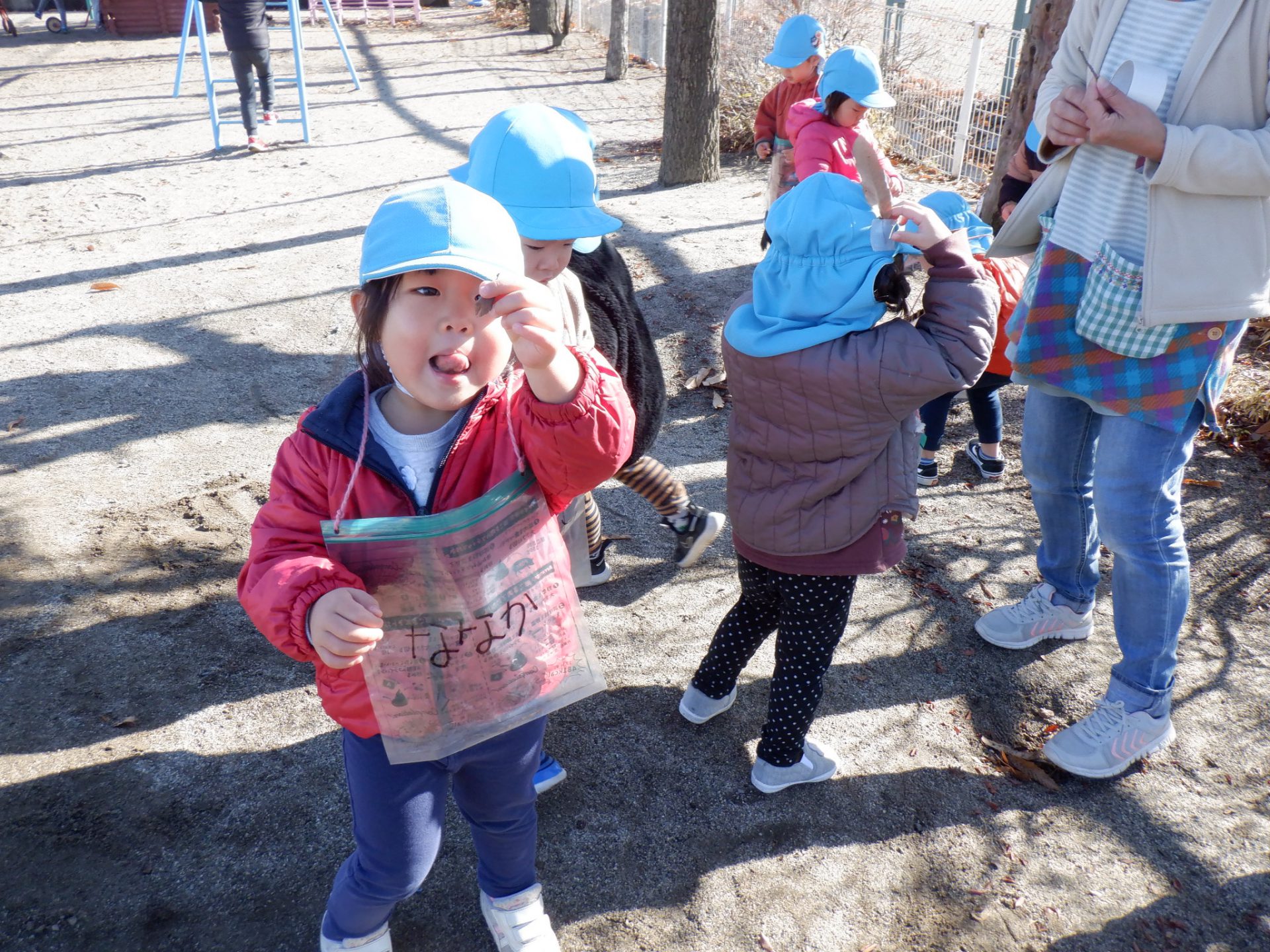 「あっ!お洋服にくっついたよ」「ひよこぐみまで飛んでいくのかなあ」「おうちまで飛んでっちゃいそう!」「大きな葉っぱがあるよ!」