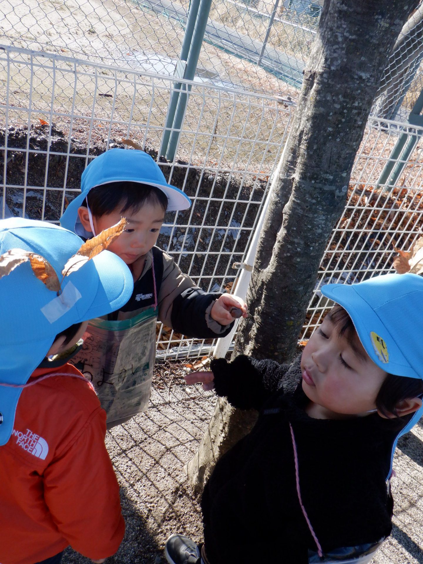風が強い日に、園庭の周りにある樹木の枯れ葉が空高く飛んでいるのを発見!