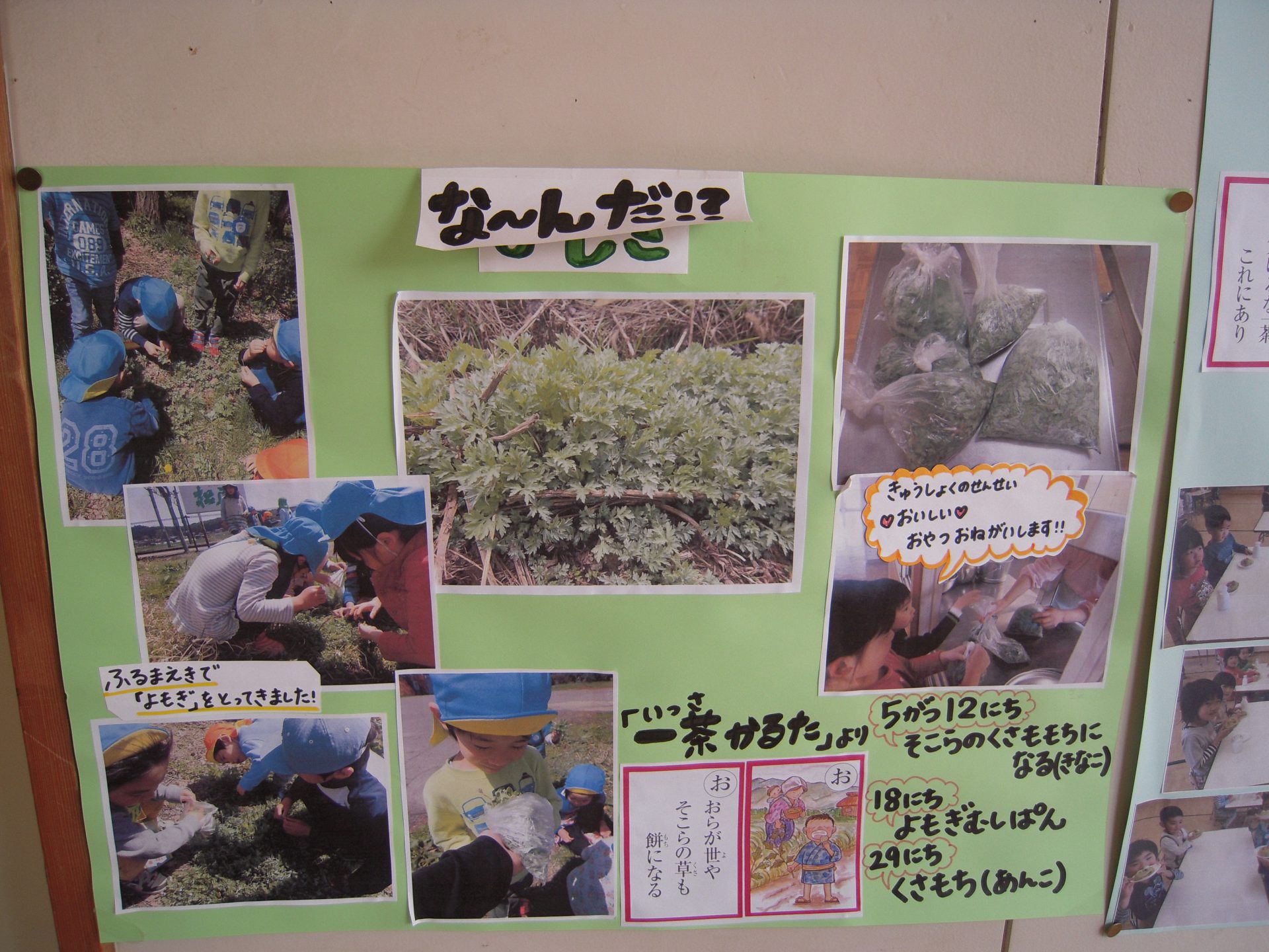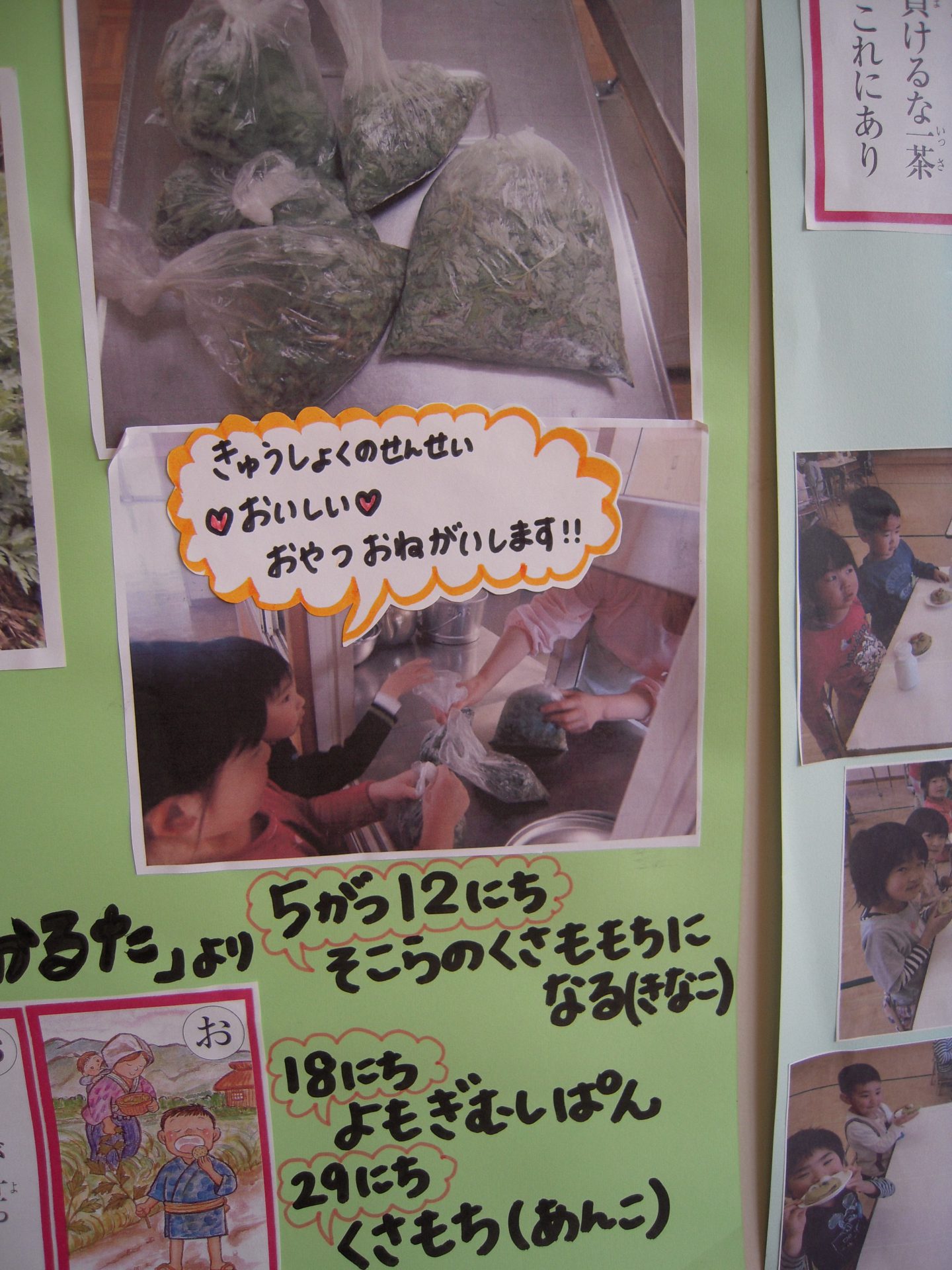 1日目のかえるパンと、金曜日のおやつに提供させていただく、草もちのよもぎ取りの様子が展示されていました。