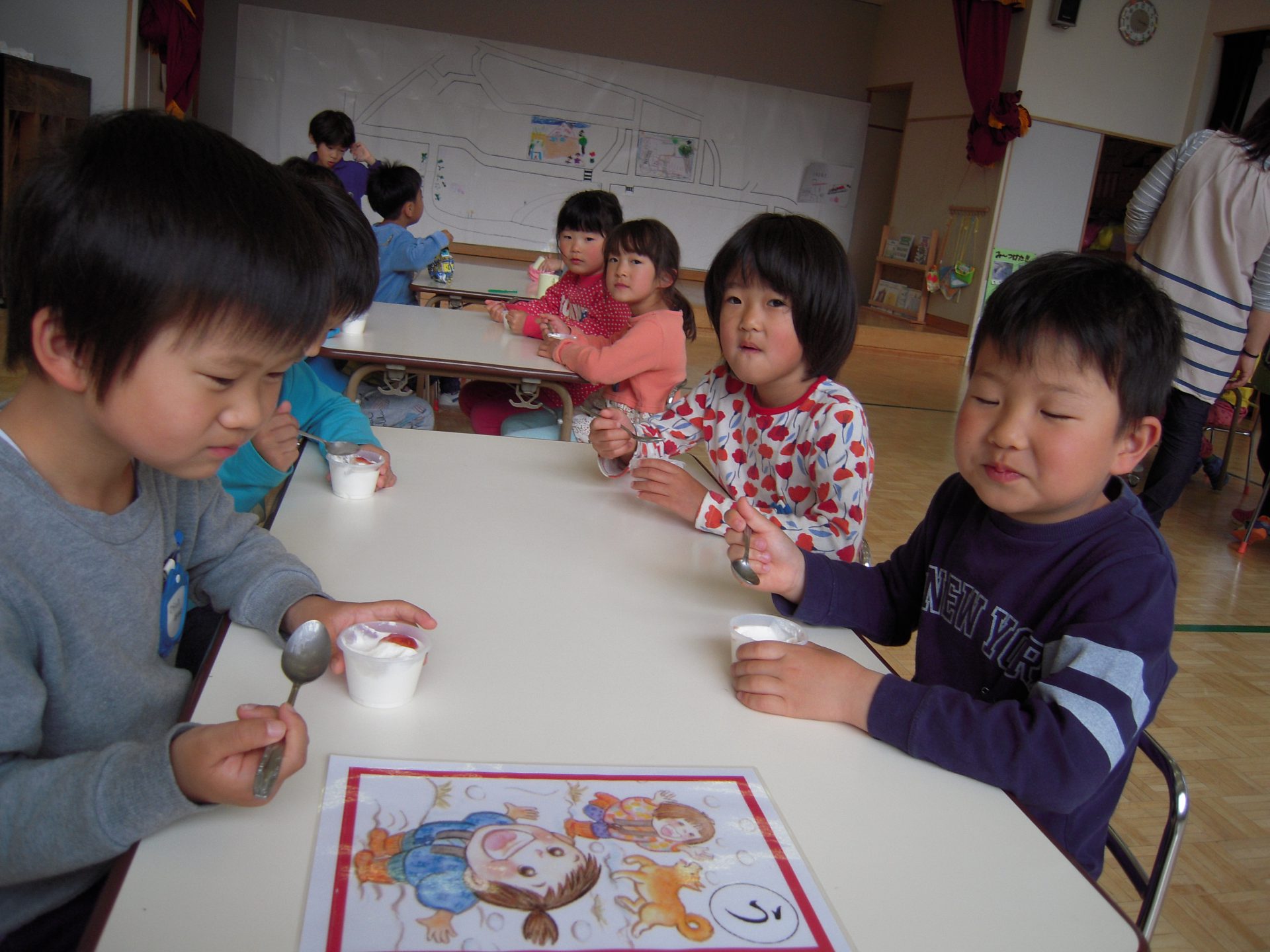 今日、栄養士はお昼とおやつの時間に古間保育園にお邪魔しました。
