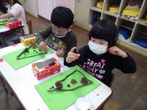 たくさんの自然物をバックに入れて園に帰り、後日自分たちで拾ってきた自然物を使い、クリスマスの飾りを作りました!