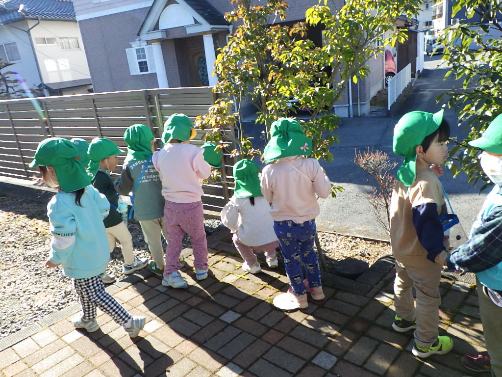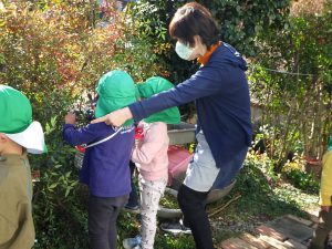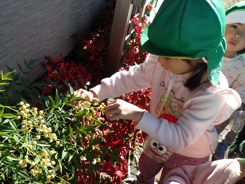 自分のお散歩バックにどんどん赤と白の南天を入れていく子どもたち。きれいなドングリが嬉しくてドングリばかり、たくさん拾う子もいました。