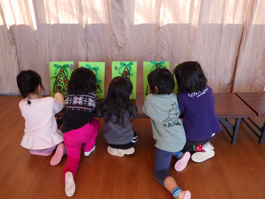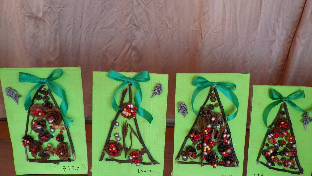 ・自分たちの作ったクリスマス飾りを作り、「これ私の!」「かわいい~」と友だちと作品を見合って嬉しそうにしている姿があり、個々の作品ではあるが、友だちと一緒に拾いに行ったり作ったりする楽しさや、出来上がった喜びを味わうことができたのではないか。