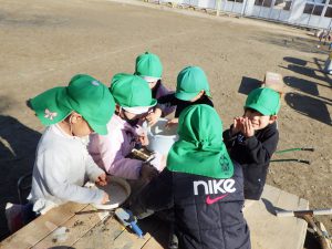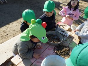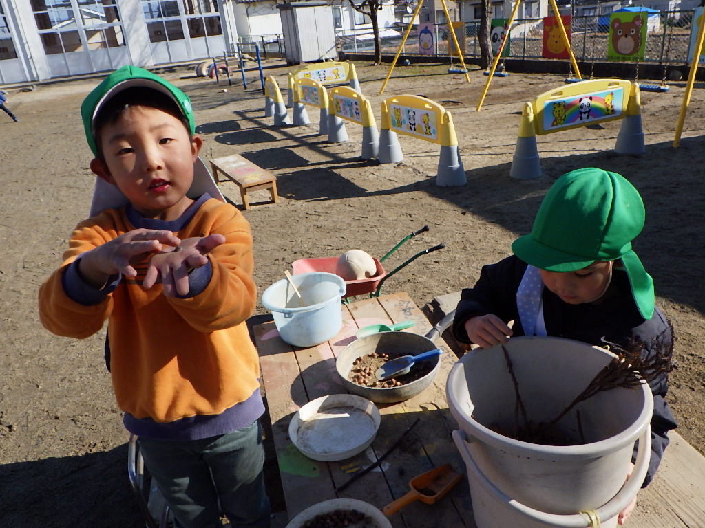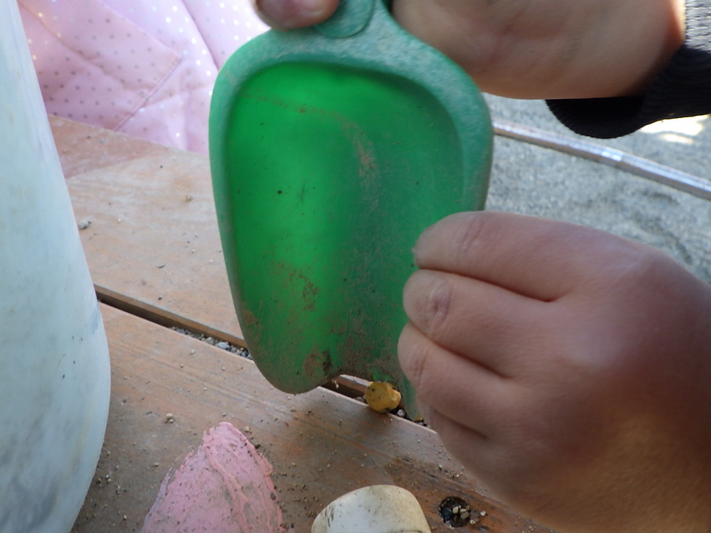 フライパンに入れて混ぜたりお皿に盛りつけたり、机の溝にドングリを上手くはめて、転がっていかないようにしながら上手にスコップで切るお友だちもいました!