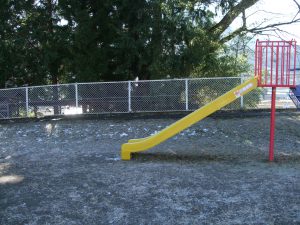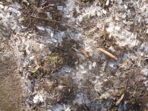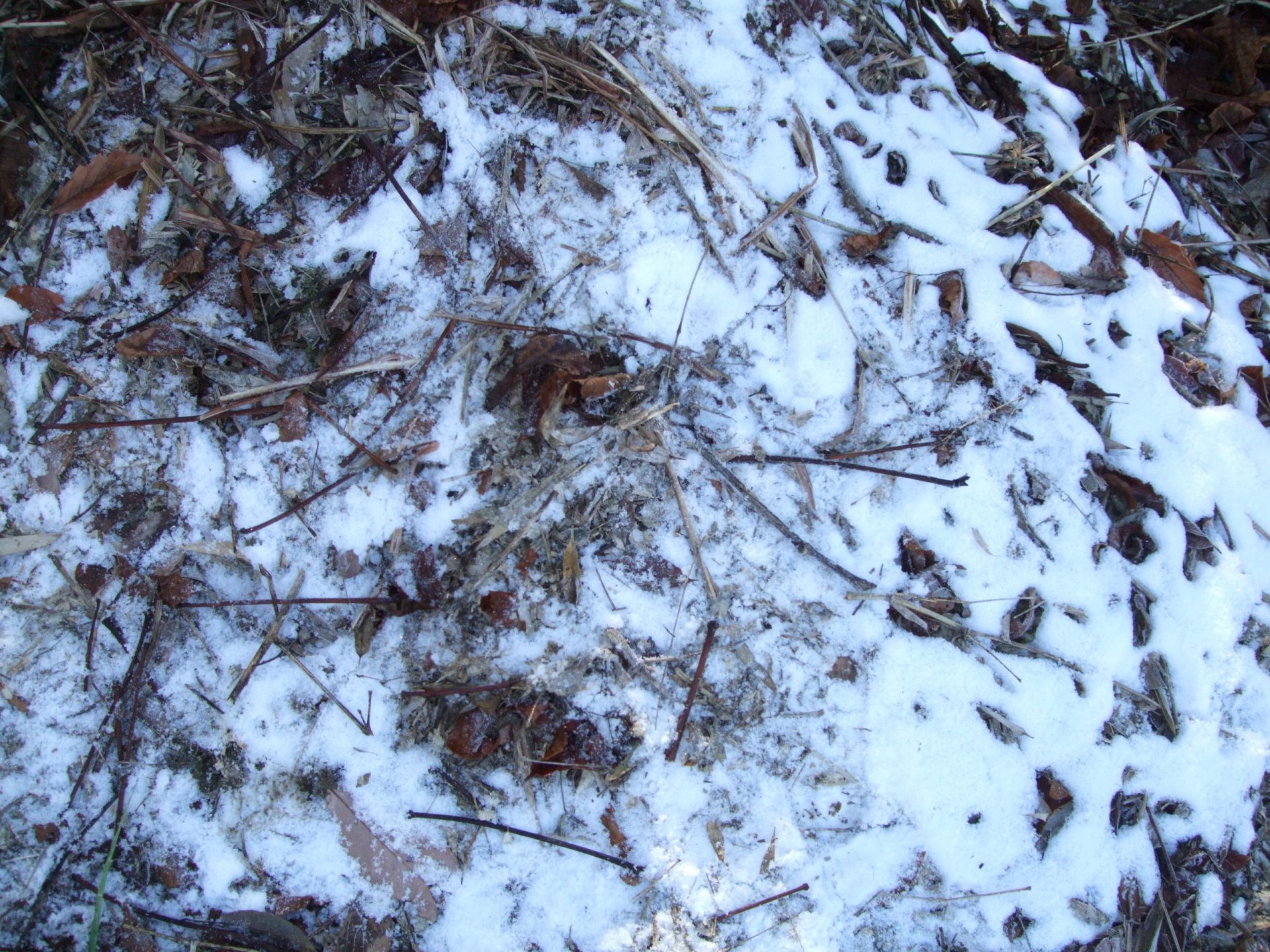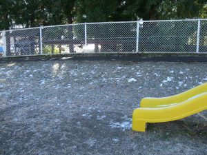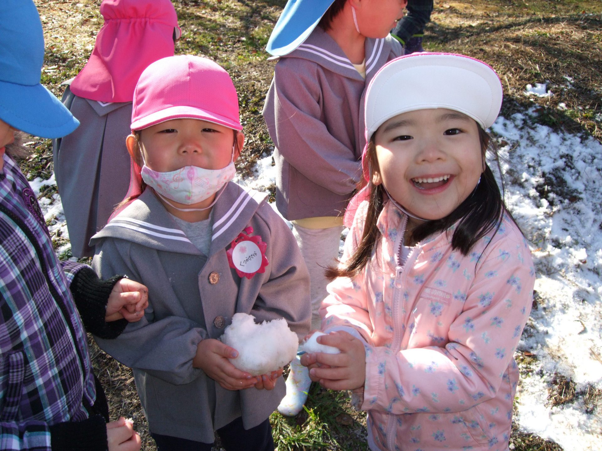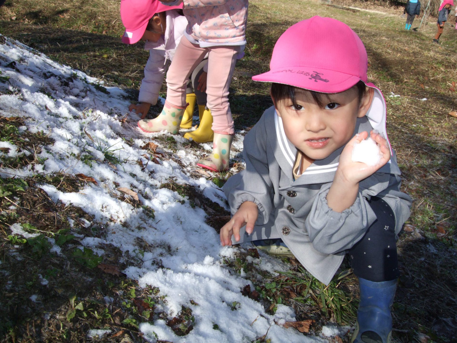 「あ~楽しかったね~」と広場から帰ってくると、いつもみんながたくさんあそんでいる園庭の日陰にも、うっすらと雪が残っていました。