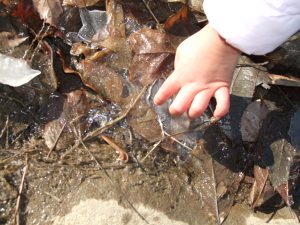 さっそく身を乗り出し、川に張った氷に手を伸ばします。