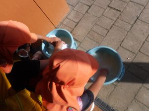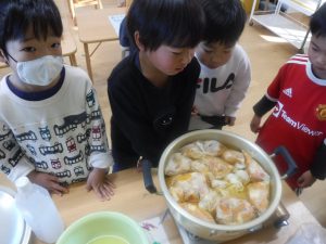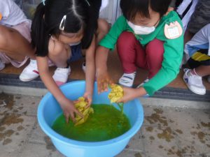 5月にこいのぼりを絵具で染めてから”染める”ということを楽しんできた子どもたち。