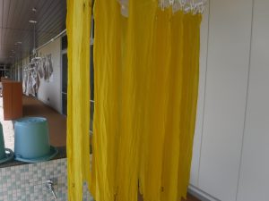 一緒についている濃い黄色の布はマリーゴールド、ピンクは赤しそで染めたものです。