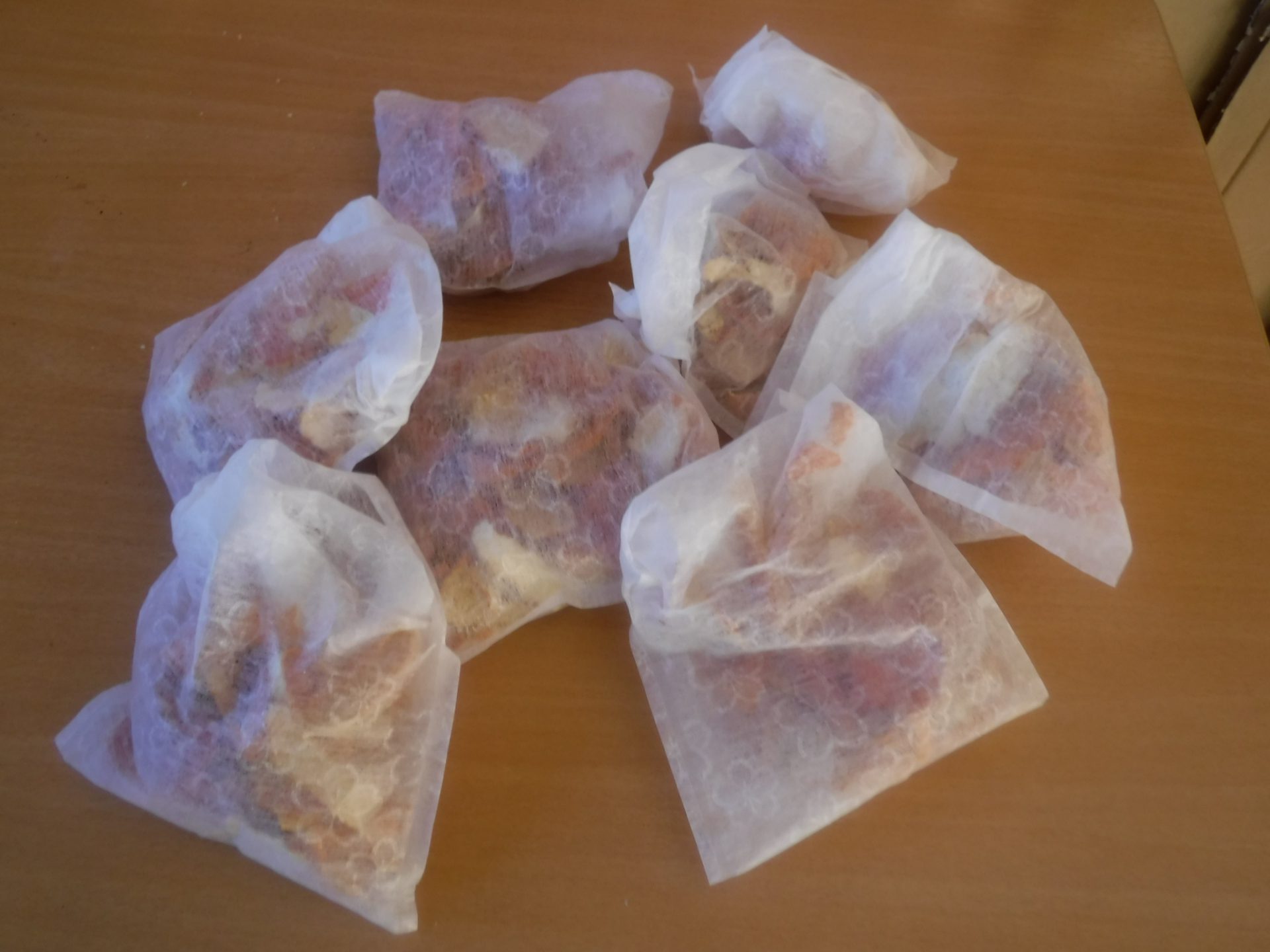 そこで自分のクラスだけでなく、他のクラスからもみかんの皮を集め、何日か天日干しをし、染め物をすることにしました。