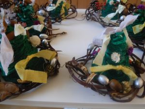 染めた布は切り分けて、クリスマスの飾りにリボンにしてつけました。