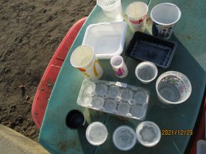 砂場用玩具のお皿に氷ができていることを発見し、遊びに取り入れていた子どもたち。「氷作りたい!」と、子どもたち一人一人好きな形の容器を選んで氷づくりに挑戦しました。