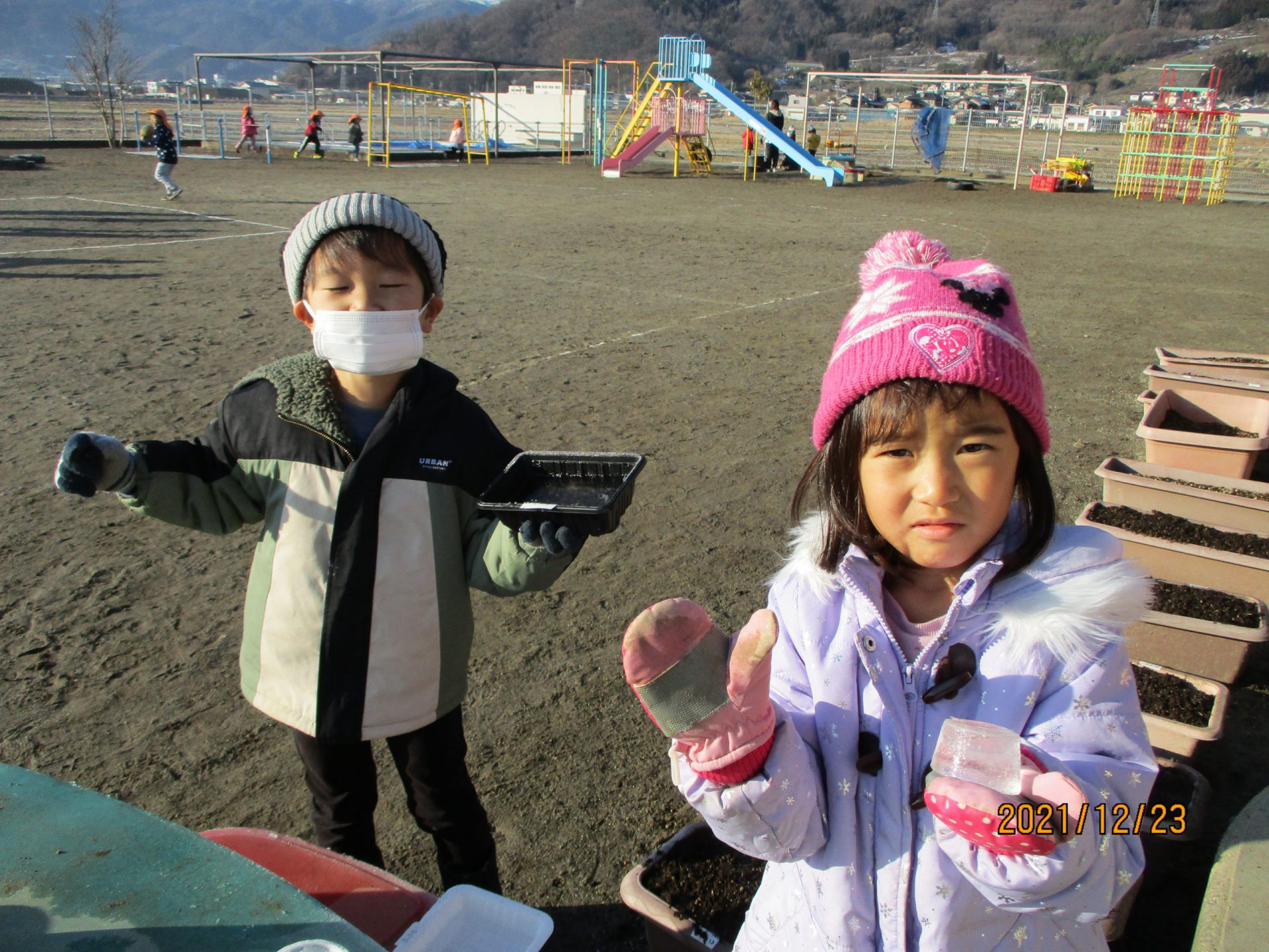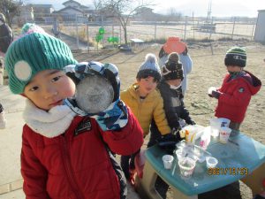 園庭で氷や霜柱を発見し、遊びに取り入れて楽しむ姿や、自分でお皿に泥水を溜めて氷になるか試す姿がありました。水が氷に変化する不思議さを感じ共有したり、子どもたちからも「氷作りたい!」という声があったので、自分で容器を選び、好きな形の氷づくりを楽しんだりしてほしいと思い活動に取り入れました。子どもたちの様々な気付きや発見を今後も大切にしていきたいです。