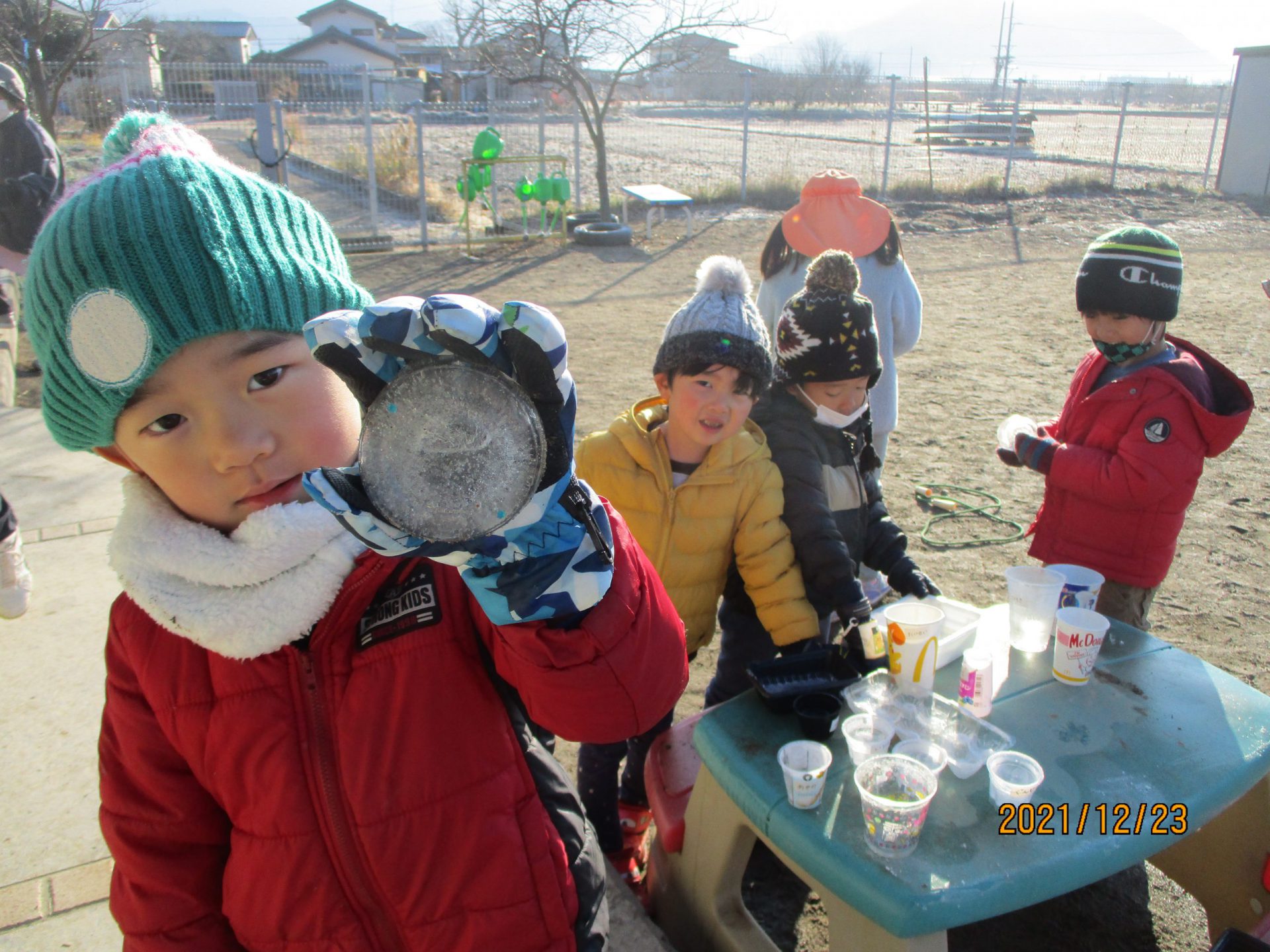 氷づくり1日目では、氷が出来ず残念そうな子どもたち。「なんで?」「暖かかったからかな?」と考える姿がありました。